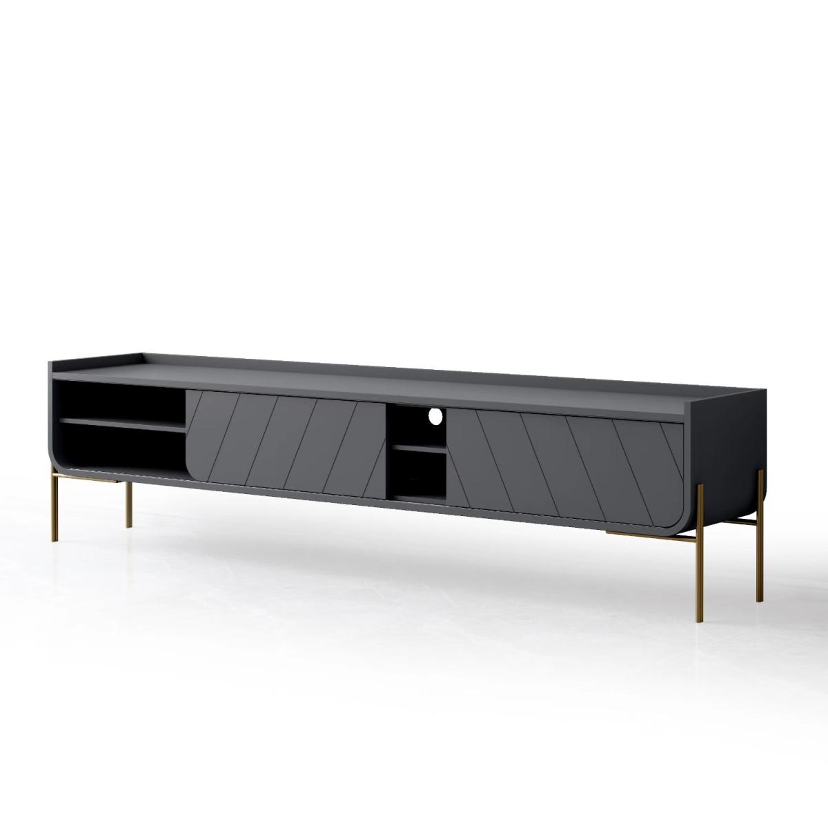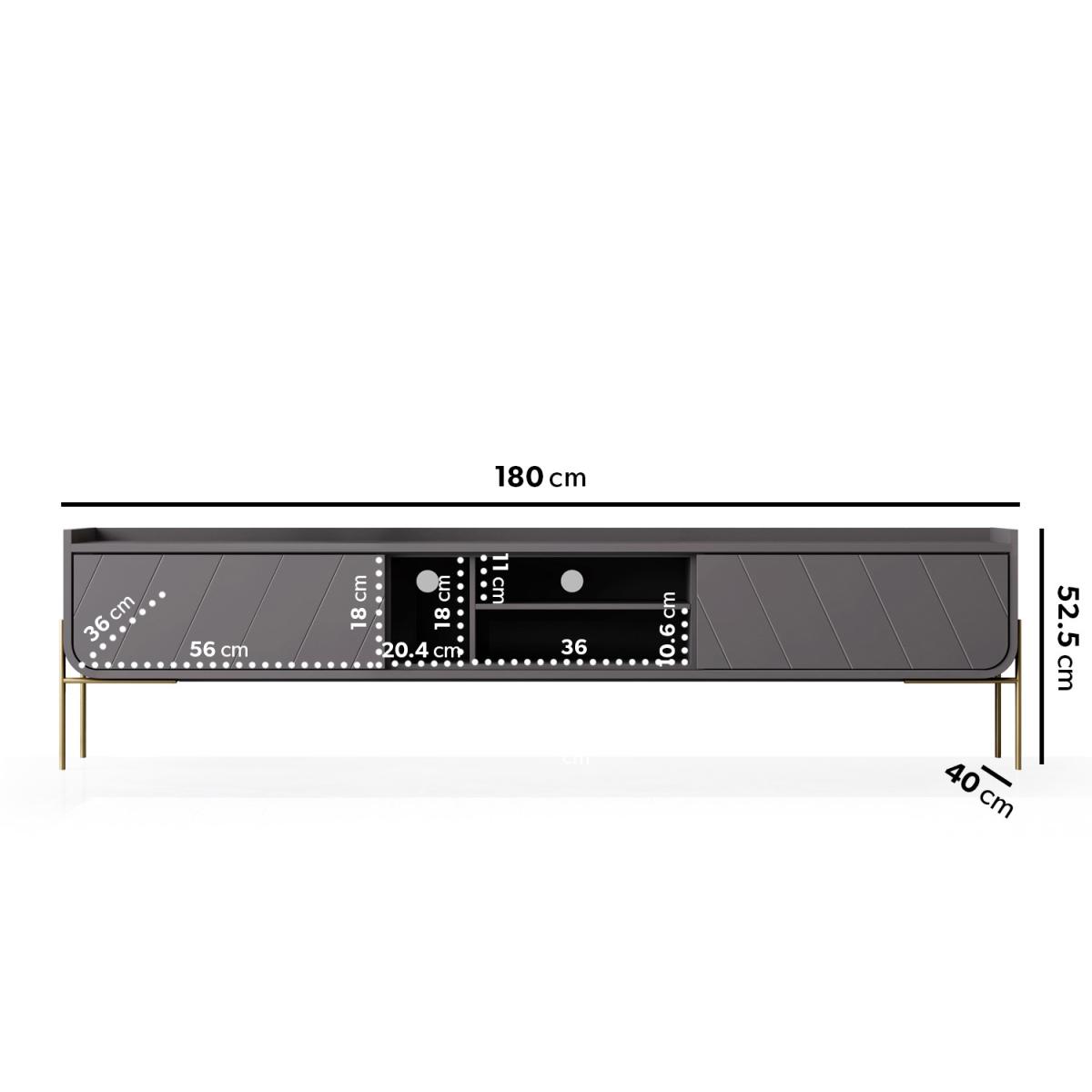 Contemporary TV unit with concealed storage Features cut out inlaid detailing on the door fronts Brushed gold legs complement the dark grey finish Both open and closed storage for all your essentials Each door is fitted on a metal runner and slides open Minimal assembly required, simply attach the legs Need to know More info Weight: 52.5kg Colour: Dark grey, gold legs Finish: Painted Material: MDF, plywood, stainless-steel and premium hardware Construction: Metal runners for sliding doors Max Weight: This TV unit will hold up to 30kg Assembly required: Yes - just the legs