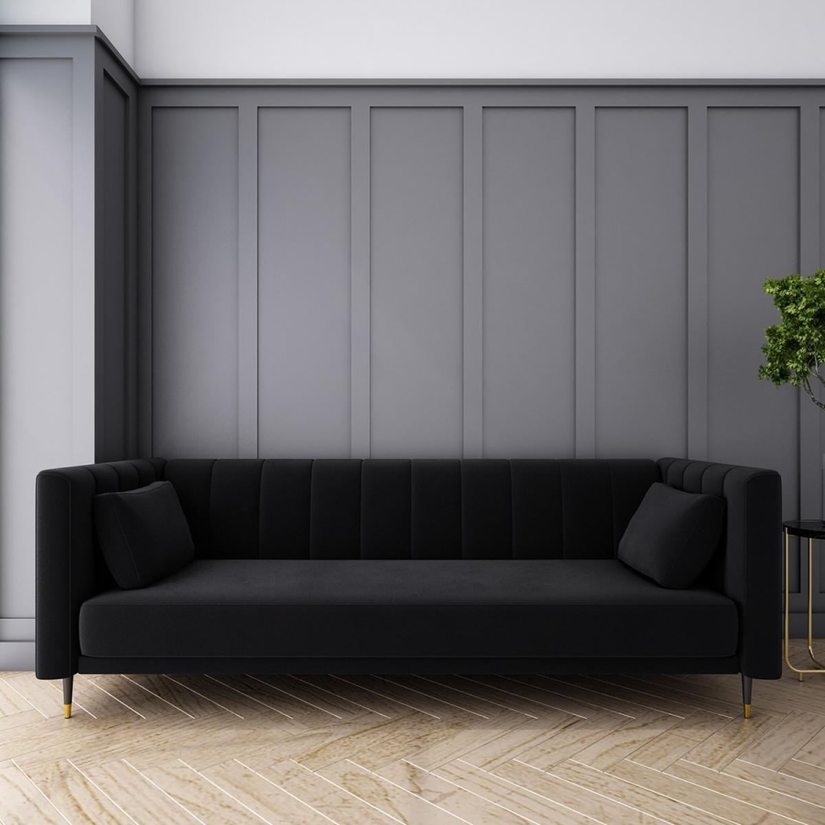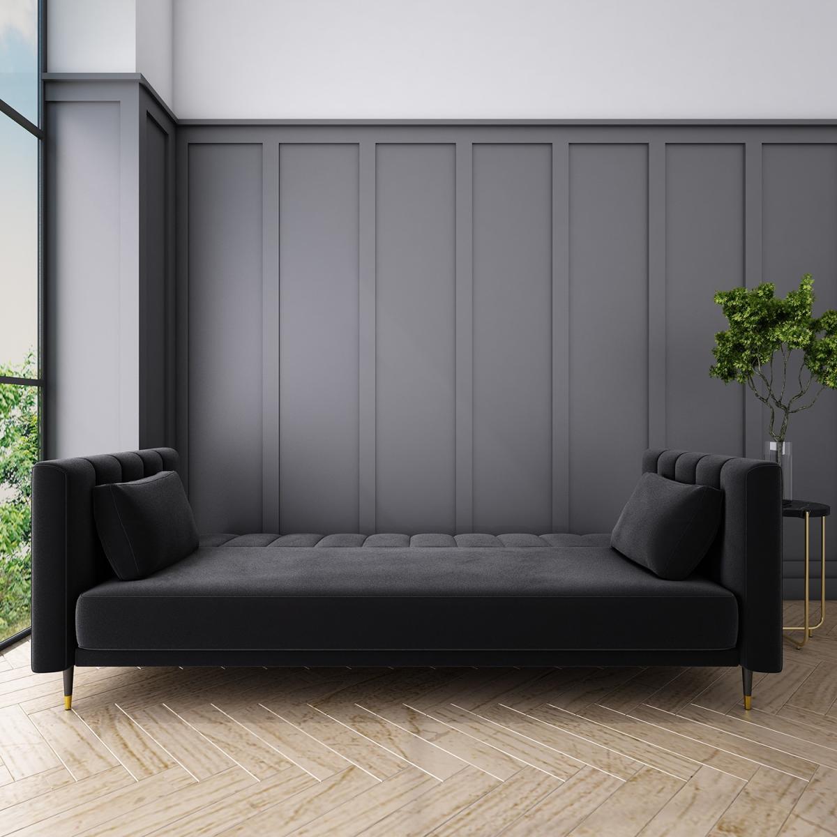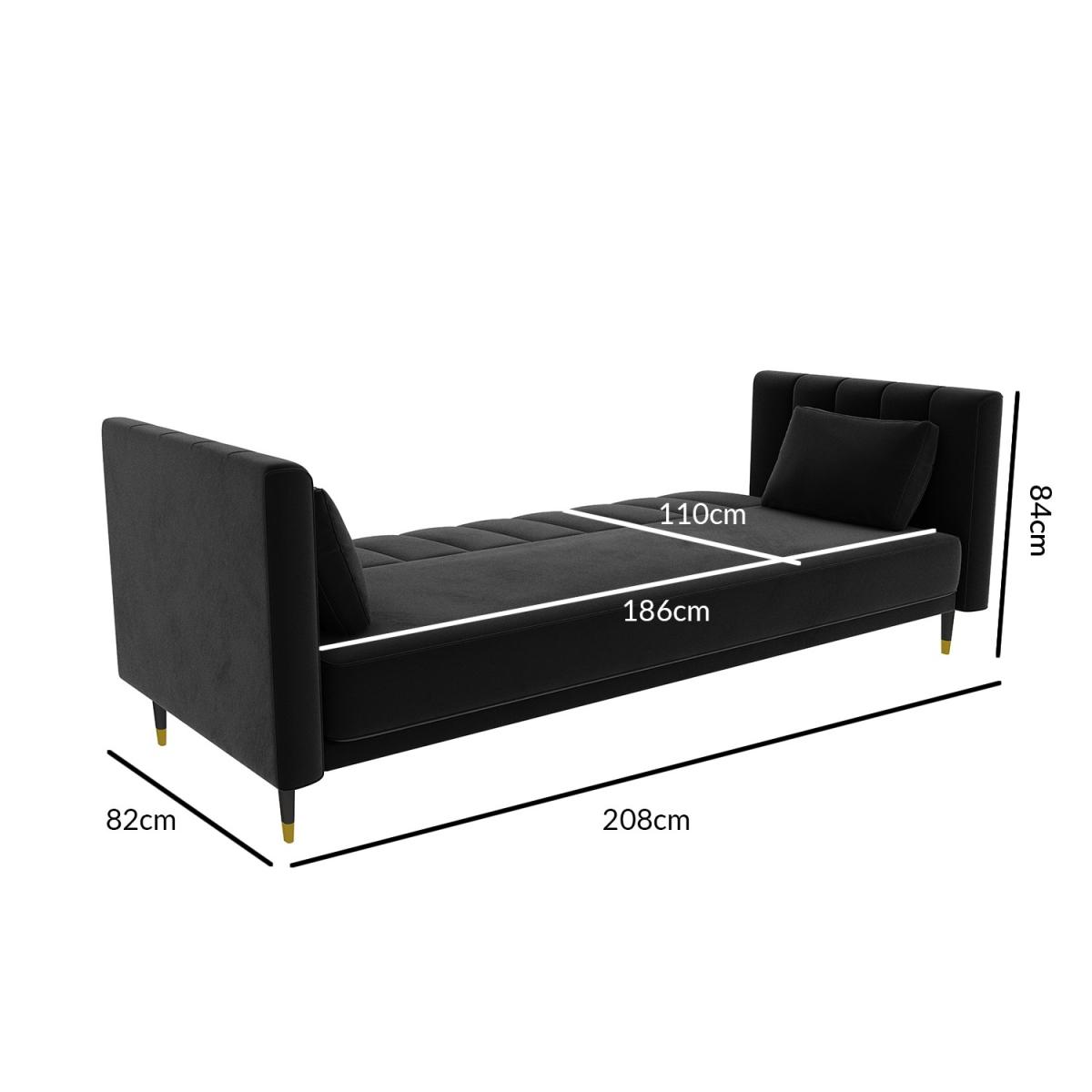 No guest room? No problem. Easily transform this sofa when you need an extra bed This sofa extends to become a spacious 110cm wide bed Click-clack mechanism for ease of use Foam filled and with a sprung base Colour: Dark Grey Two matching plump cushions included for added comfort Also available in mustard yellow or beige, there's a Mabel sofa bed to suit your room Need to know Packaging weights: Box 1: Weight 37.5g / Box 2: Weight 14kg Colour: Dark grey Finish: Velvet upholstery and metal legs Filling: Spring and foam filled Mechanism: Click-clack Assembly required: Yes