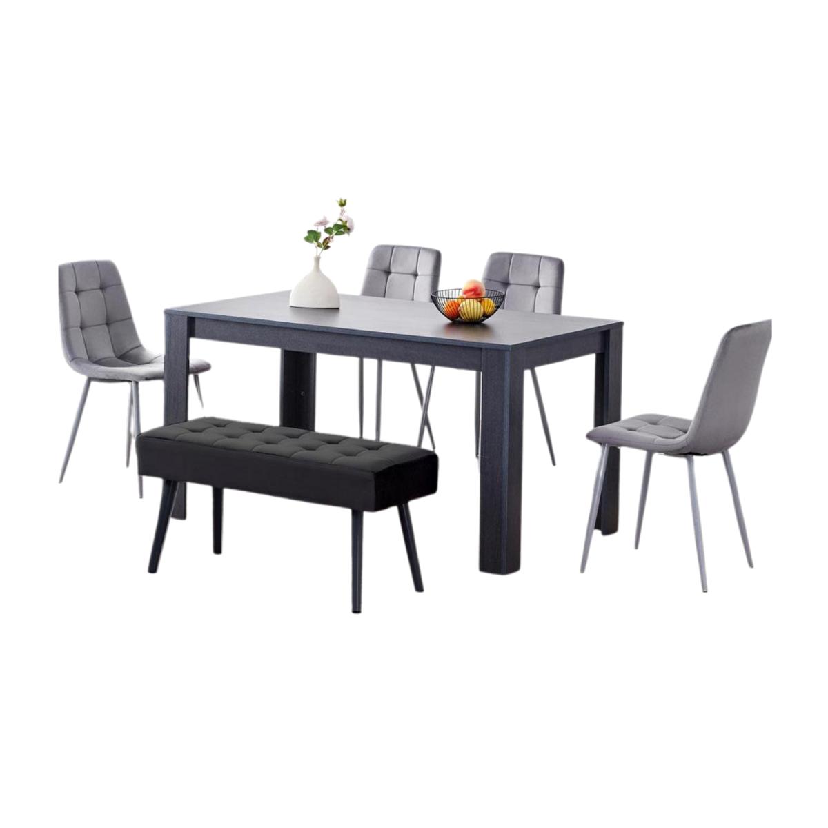 A stunning wooden dark grey arrow design dining table set includes a set of 4 tufted velvet grey rocco chairs with a slightly curved back design, and 1 bench. The chic grey black dining bench includes a soft black velvet padded seat with stylish stitching and tufting. The dining table colour is dark grey with a hint of charcoal. The dining chairs are grey with a slightly curved back design for a better fit with the body shape. The padded seat features elegant stitching and tufted details, giving it a modern yet cosy look. The dinner table is crafted with high-quality MDF and a melamine laminated finish to ensure a durable, long-lasting tabletop. The dining chairs are made of premium velvet with metal chair legs. With sturdy metal legs, this bench is built to last and blends easily with any decor. Dimensions The dining room chairs sizes are H87 x L59 x W44 cm. Dining table size is H75 x L117 x W77 cm. The seat height of the chair is 45 cm. Bench size is 90cm (L) x 36cm (W) x 47cm (H). Straightforward assembly is supported by clear instructions for our dining table set. FEATURESThe dining set includes a table, 4 high-quality chairs, and 1 bench. Dining table made of high-quality MDF and a melamine laminated finish. Chairs are made of premium velvet with metal chair legs. Legs prevent damage with the adjustable foot protection provided.