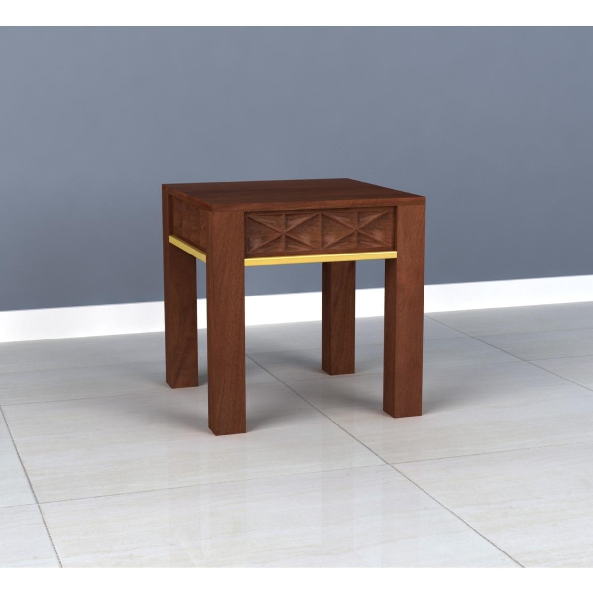 Dimensions W44 x D44 x H45 cm. The Ander range has contemporary styling to intricate traditional detailing blended together to form each stunning piece. Mango is the wood of choice stained to a rich walnut colour which enhances the handcrafted lattice design detailed on each piece. Features. Richly stained Mango wood. Intricately carved edges to table. Plain stained top. Gold framing. Assembly required..