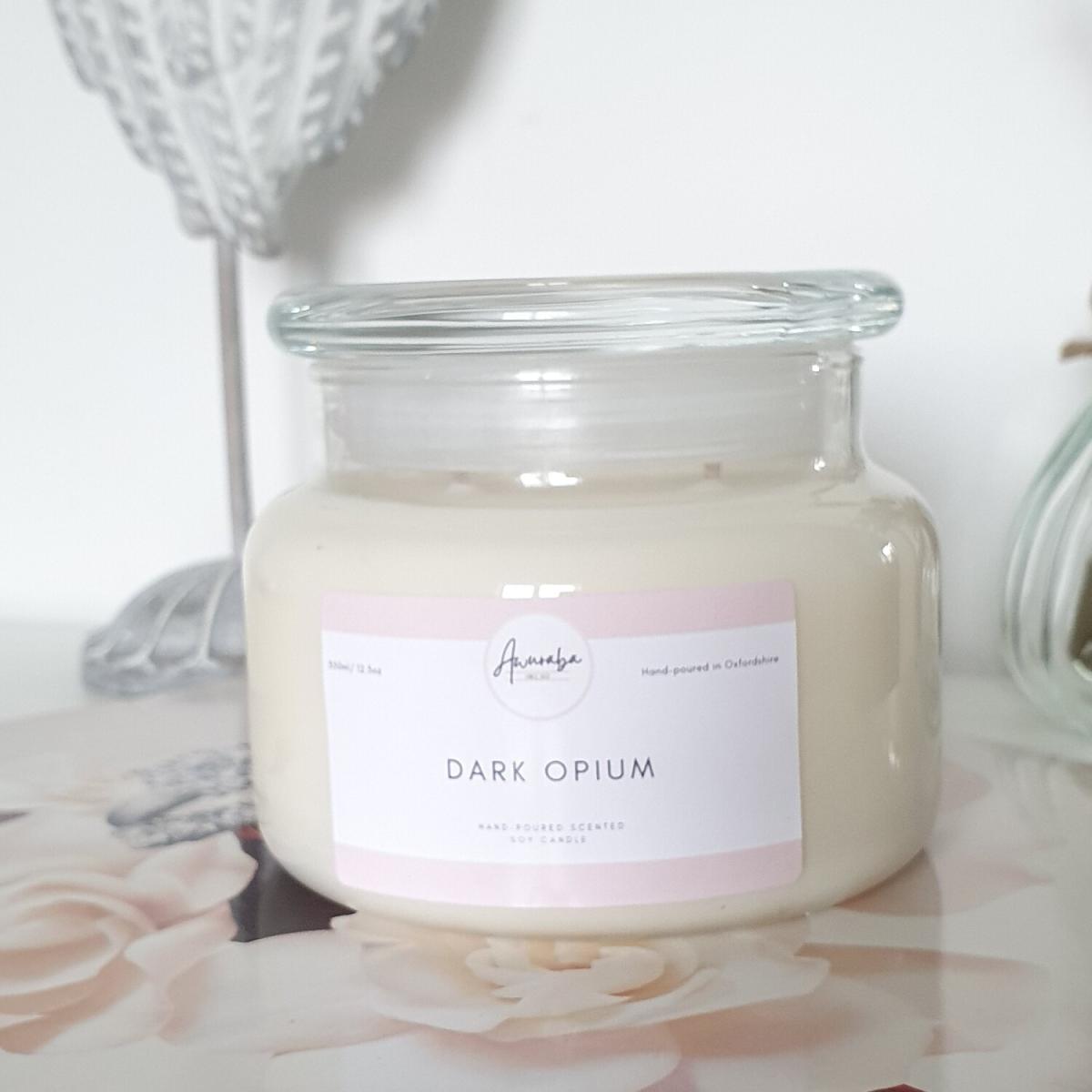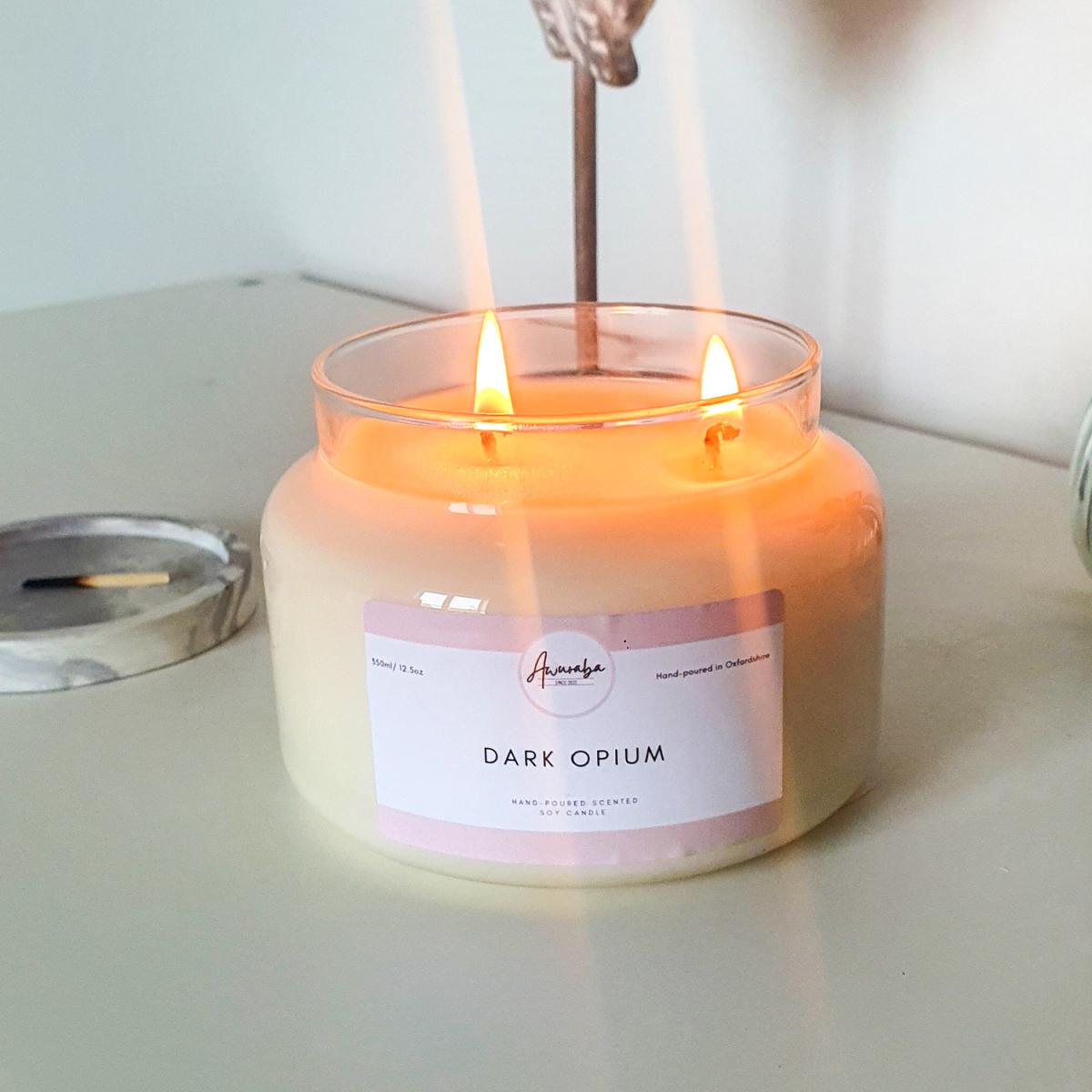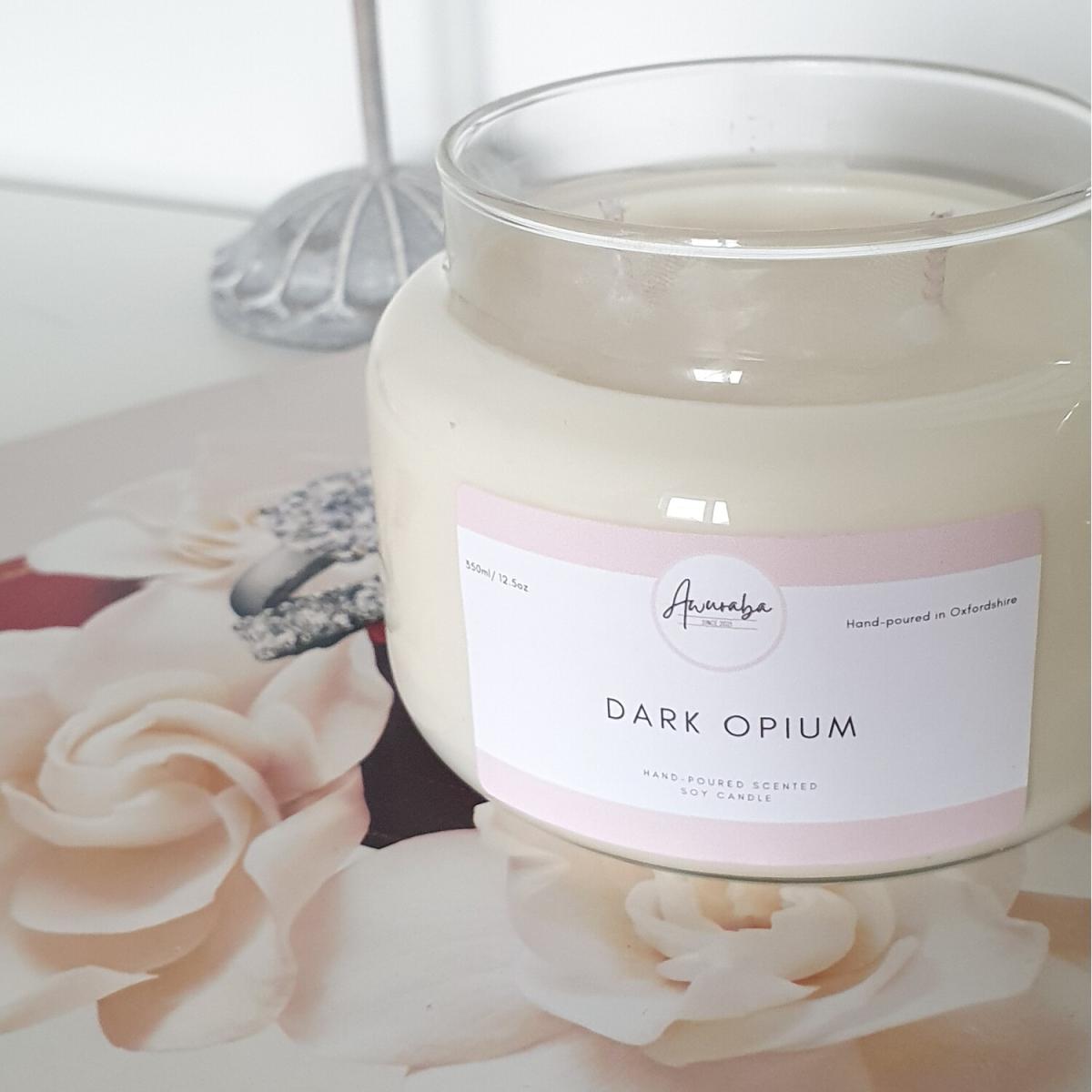 Hand-poured Soy Candle- Dark Opium Scented. Up to 40 hours burn time. Our Dark Opium scented candle is similar in scent to the famous designer fragrance. It's warm oriental spicy scent with top notes of pink pepper, orange blossom and pear leading to a heart of orchid and coffee and a sumptuous base of amber, patchouli, vanilla and cedar. All candles and melts are hand poured in the South East of England and are double wicked and made with vegan friendly soy wax for a clean, non-toxic burn. The Dark Opium scent is also available as wax melts.