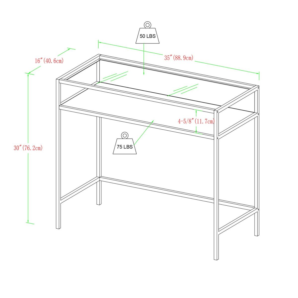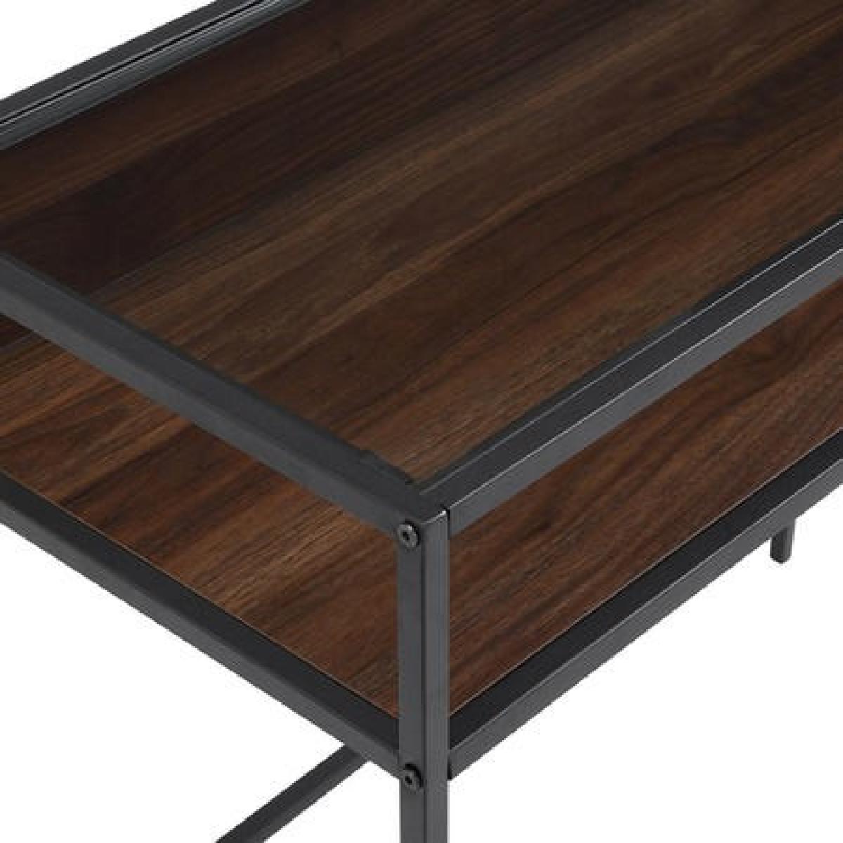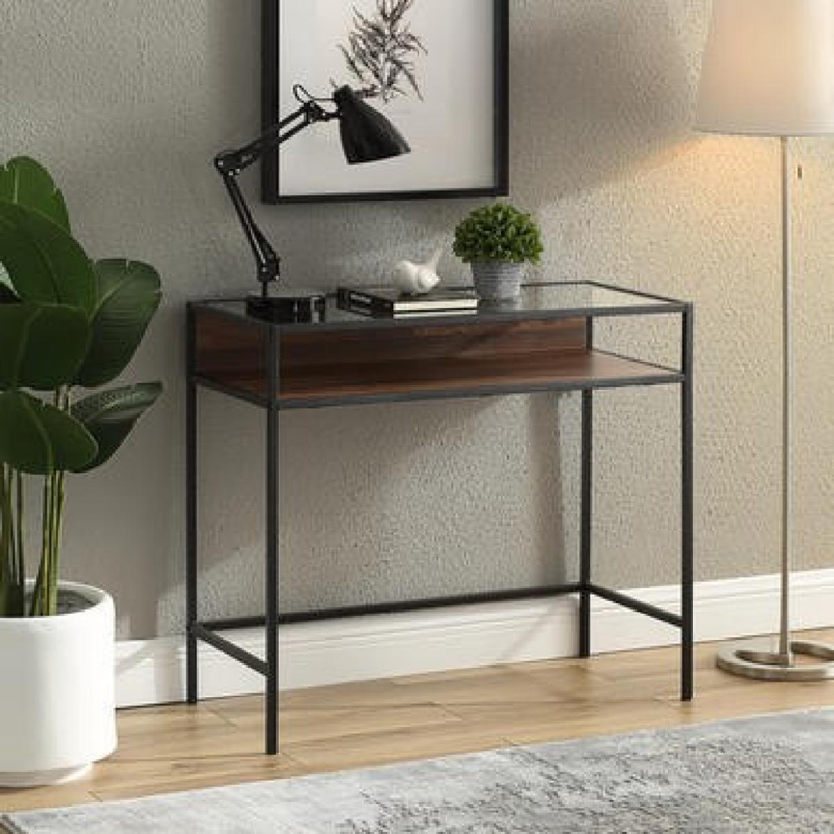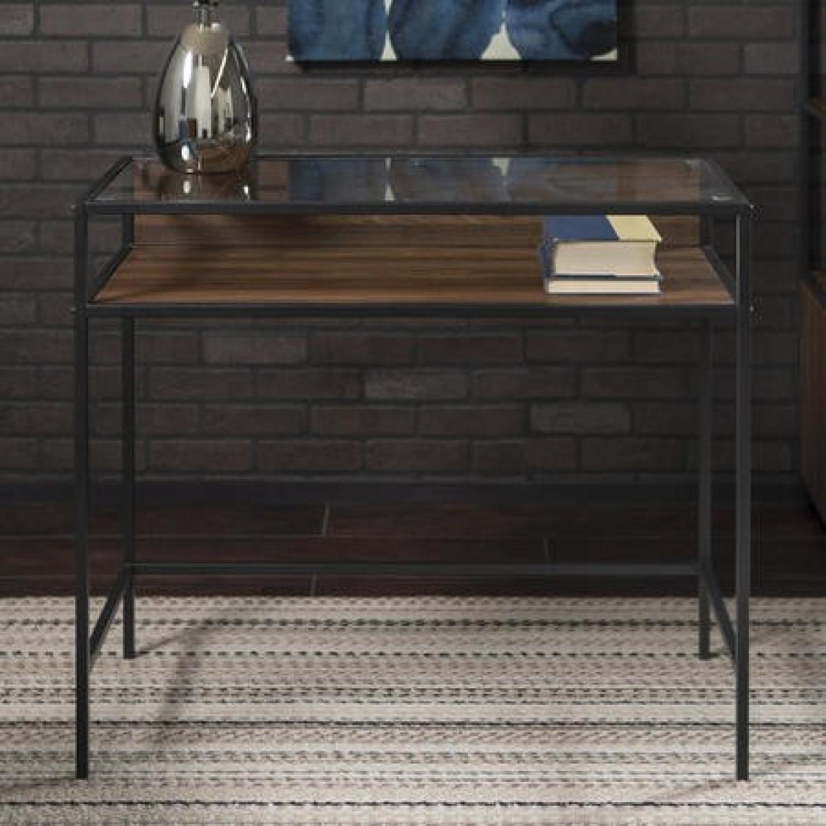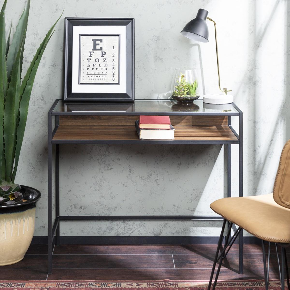 Dimensions H76 x W89 x D41 cm. Featuring a beautifully structural design that meets an urban industrial feel this computer desk will make an ideal work space to your home office. With a metal frame a beautiful laminate wood surface and a glass top to create a statement. Open side shelf for easy cable management. Use as a computer or writing desk to help with that novel or set your business goals or go unconventional with an open shelf vanity to display your favourite tools that help you get ready for a special event. The blend of materials creates contrast that accentuates the style and purpose. Features. Made with a steel metal frame for a sturdy design. This computer desk can double as a vanity in your home office or bedroom. In a mixed material design for an urban industrial style. The open shelf below a tempered safety glass table top makes space for your work supplies and books. In a dark walnut finish. Easy assembly..