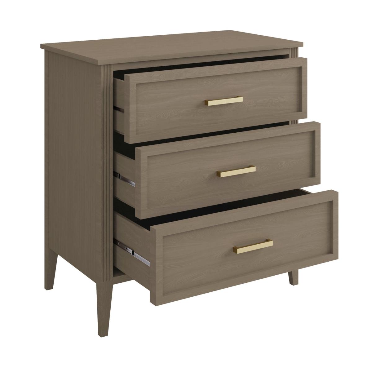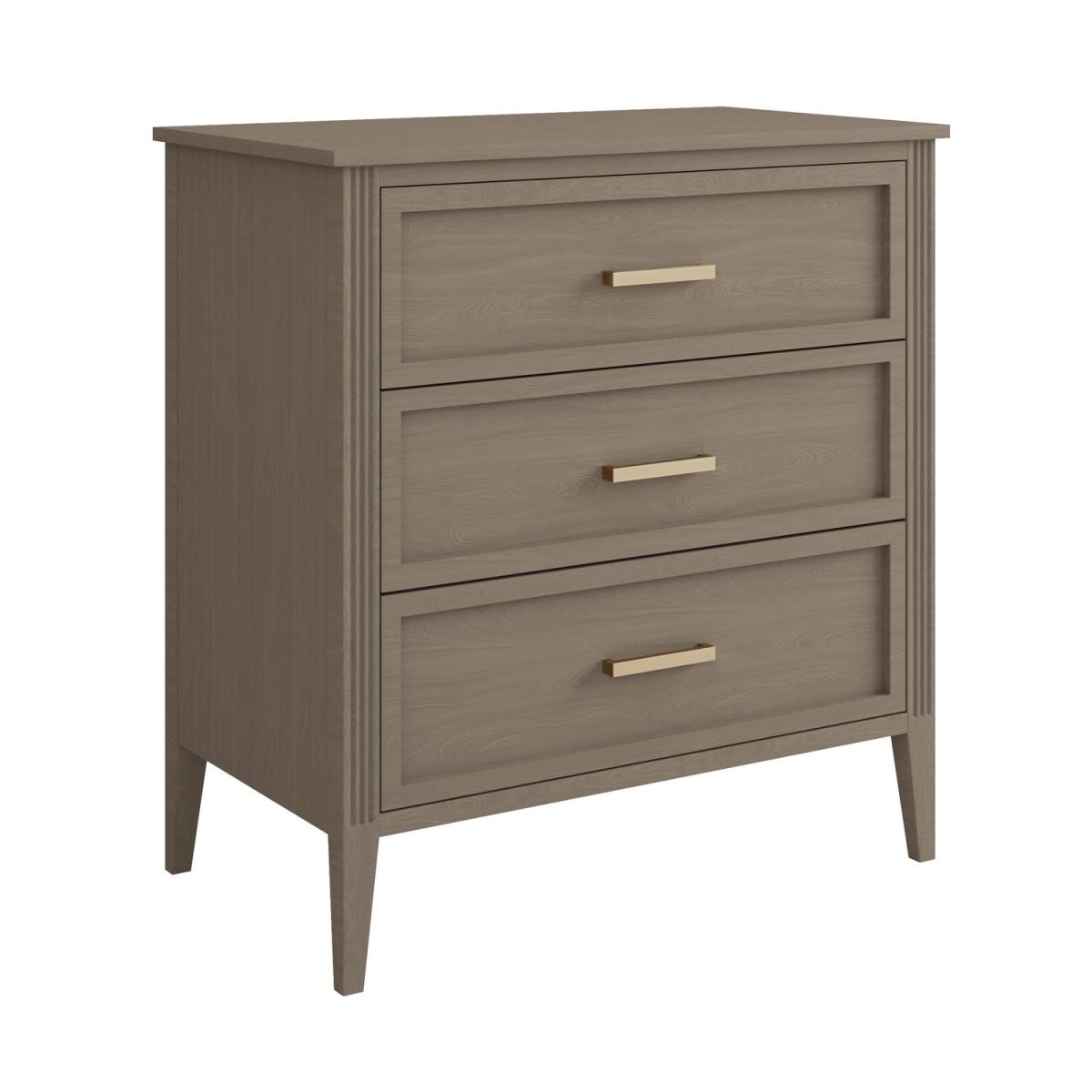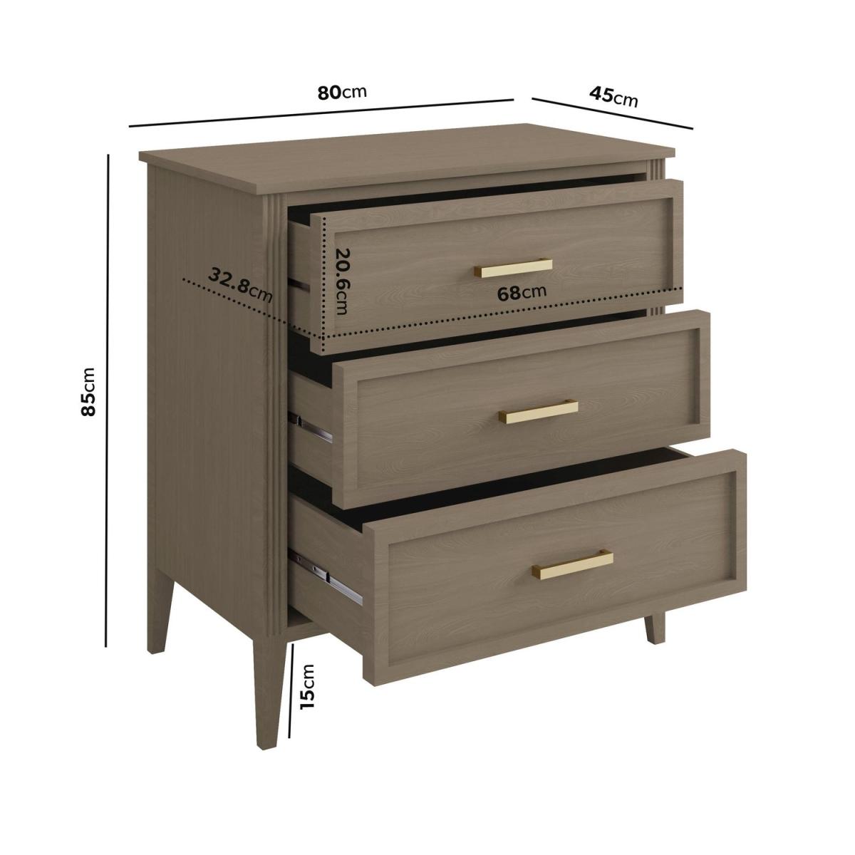 Adds luxury and warmth to your space while effortlessly blending with various colour schemes. Classic charm meets modern sophistication with fluted side details and golden accents. Offers lasting stability and elegant style while keeping the space feeling open and airy. Perfect for both traditional and contemporary interiors. Three spacious drawers to neatly store your bedside essentials. The Wide Delilah Chest of Drawers is a stylish addition to your bedroom. This timeless piece is a modern twist on a usually classic design. Providing ample storage for your clothes, this chest comes with 3 large drawers and a spacious top surface to display your favourite items. Complete with elegant brass handles and crafted with solid pine, this chest of drawers is built to last. Dimensions: W80 x D45 x H85 cm Base to floor height: 15 cm Inner drawer dimensions:W61.4 x D32.8 x H12.5 cm Weight: 28.7kg Number of drawers: 3 Colour:Dark Wood Finish: Natural Material: Solid pine & MDF Assembly required: Yes Packaging dimensions: Box 1:W56.5 x D97.4 x H22 cm
