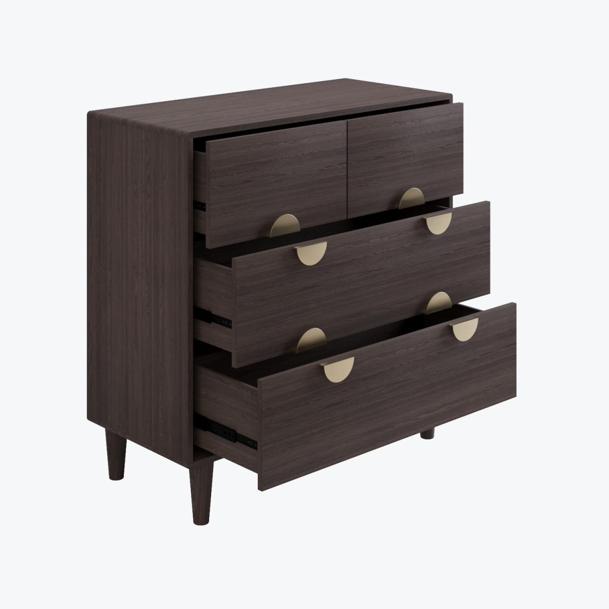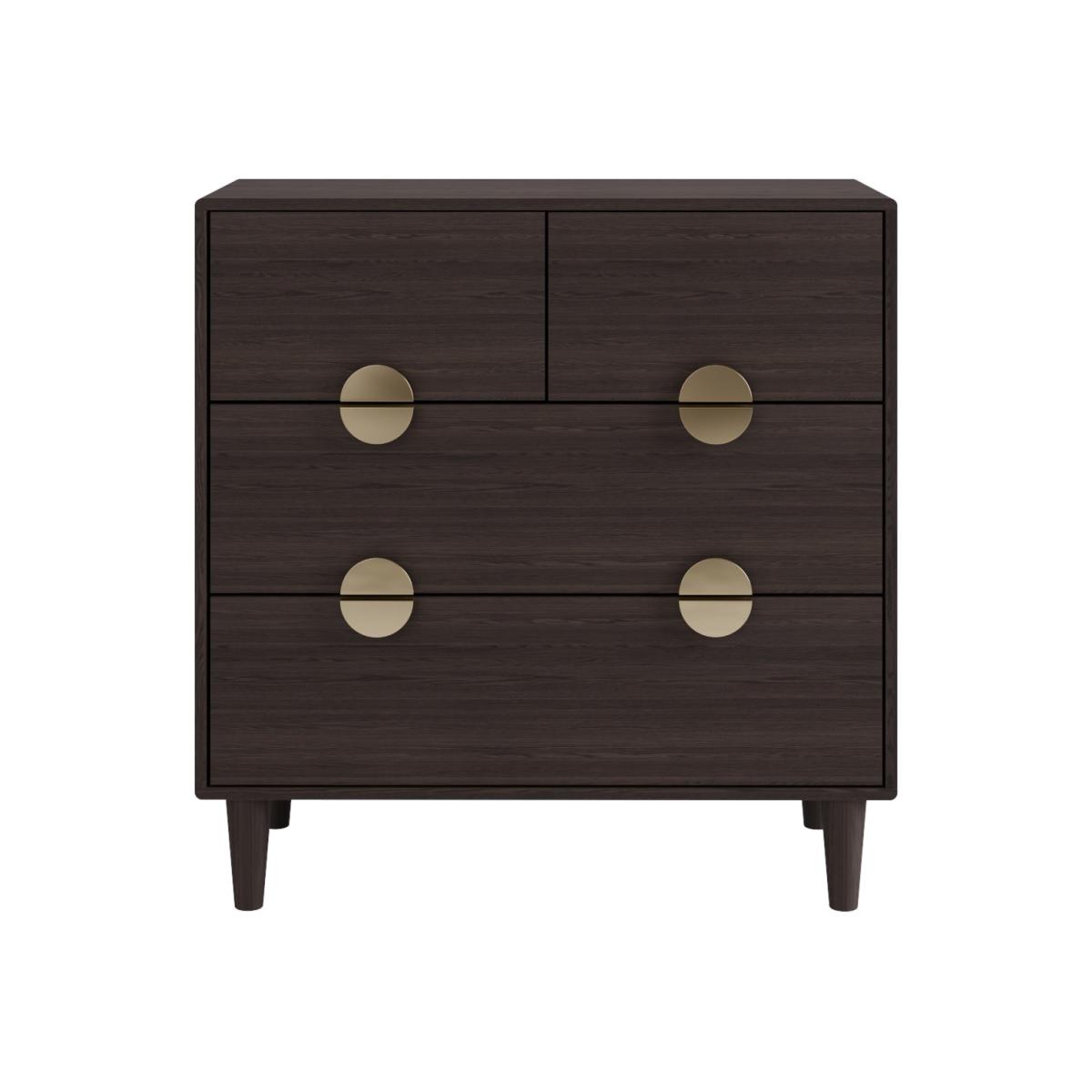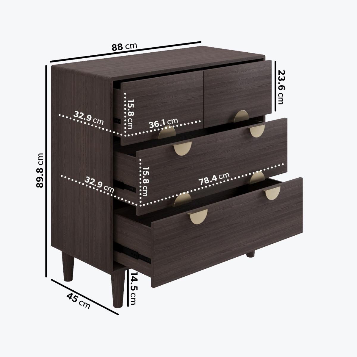 All about me Give your bedroom a stylish update with our Celeste chest of drawers. It features four spacious storage drawers for keeping items tidied away. Plus, the drawers meet to make visual circular designs, which gives this chest a unique look. The top surface is perfect for holding a mirror or even a TV. Made with solid pine wood, it's both sturdy and durable. Complete the look with other pieces from the Celeste bedroom furniture collection. Need to know Product dimensions:W88 x D45 x H89.8 cm Large inner drawer dimensions:W32.9 x D78.4 x H15.8 cm Small inner drawer dimensions:W32.9 x D36.1 x H15.8 cm Base to floor height: 14.5cm Product weight: 40kg Number of drawers: 4 Colour:Dark brown and gold (handles) Finish: Stained and matt (handles) Material: Solid pine wood and metal (handles and runners) Assembly required: Yes Packaging dimensions: W57 x D104.4 x H20 cm Packaging weights: 41kg