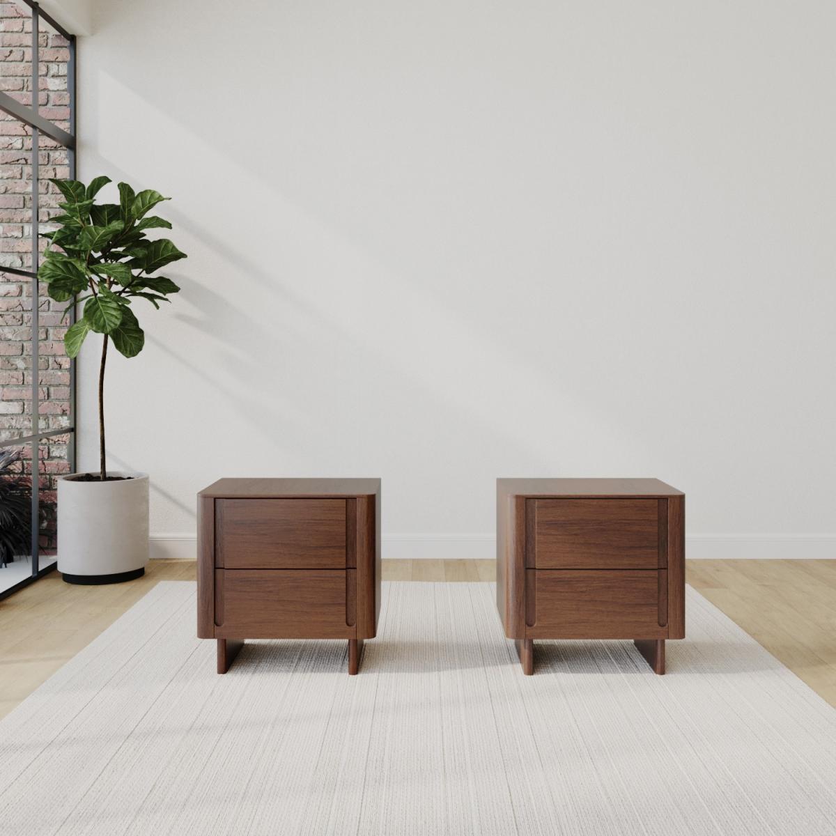This furniture set includes: 2 x Dark Wood Mid Century 2 Drawer Bedside Tables All about me Complete your bedroom with this set of two bedside tables. They feature two drawers that are great for storing all your night-time essentials. The stunning dark wooden finish pairs beautifully with any bedroom interior. Premium and environmentally conscious The Emile collection is kind to the planet as it's made from eucalyptus wood. Its fast-growing nature means it's easy to replenish tree stocks, so it's 100% sustainable. It's also made to last as eucalyptus is a durable hardwood that's highly resistant to dents and scratches. It resembles dark oak for a stunning modern finish. It arrives in FSC-Certified recycled cardboard boxes that are fully recyclable. When you buy Emile, you're helping us protect the planet while gaining a beautiful, long-lasting piece of furniture. Need to know Dimensions: W55 x D38 x H57 cm Packaging dimensions:W65.5 x D49 x H22.5 cm Weight: 17.4 kg Number of drawers: 2 Drawer dimensions:W38.8 x D30.7 x H13.1 cm Colour: Natural dark wood Finish: Water-based varnish Material: Solid eucalyptus hardwood Runners: Metal Assembly required: Yes