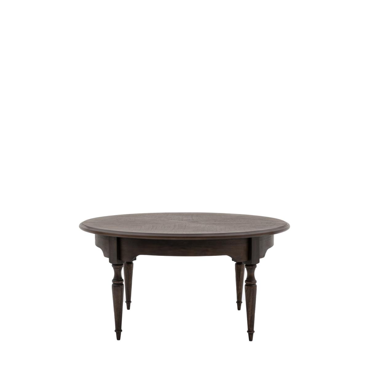 Dimensions:H:45 x W:90 x D 90cm Offering a ‘new traditional' look, with its timeless, elegant style and a modern touch. This stunning coffee table features exquisite dark salvaged coffee colour finished Mindy wood solids & veneers, with elegant inlaid marquetry details adding a final elegant touch. Features: Dark wood finish Crafted from Mindi Wood & Veneer Round Table Assembly required