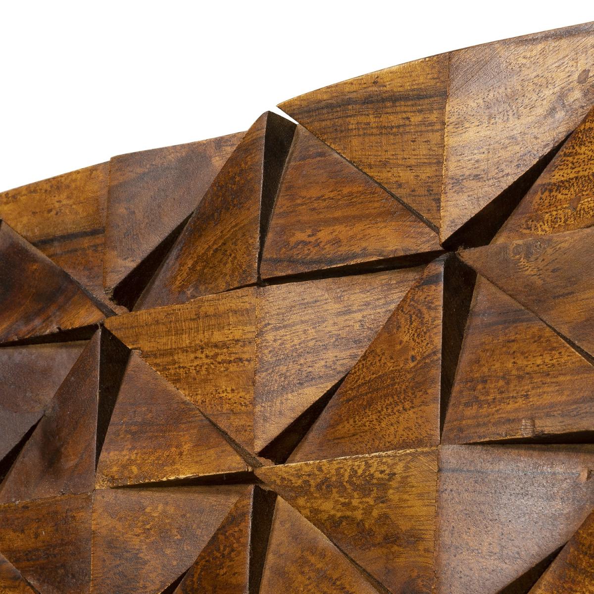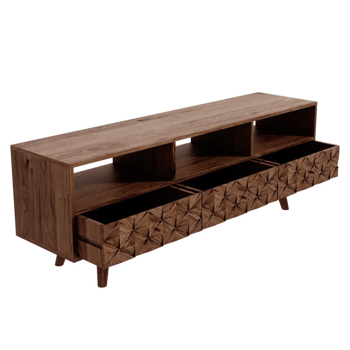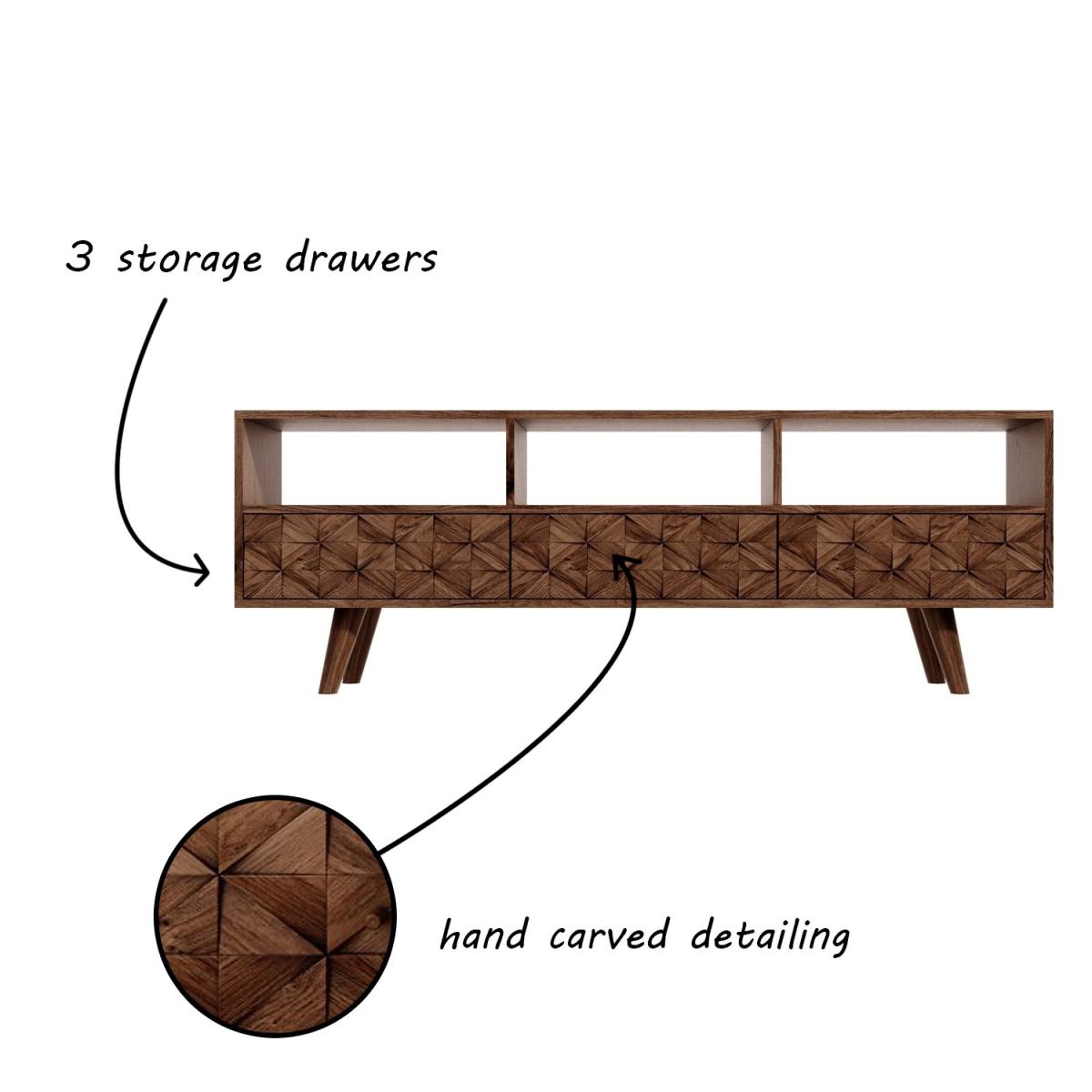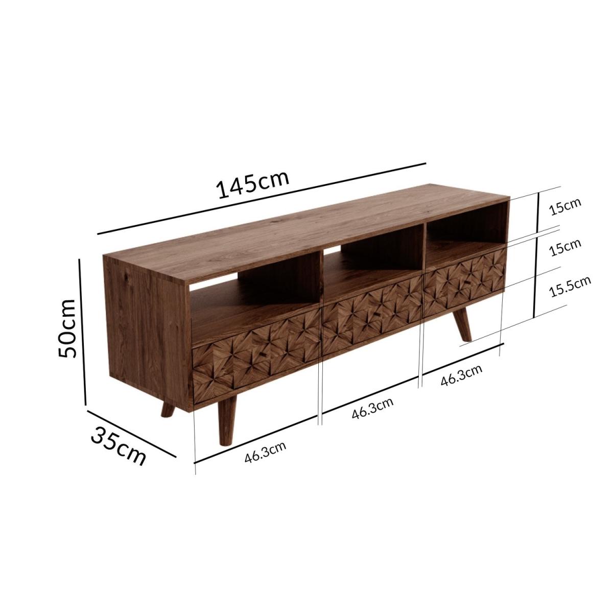 Features we love Each piece is meticulously handcrafted making it truly unique and individual to you. The eye-catching geometric-shaped woodwork on the drawers add an instant style fix to any interior Sophisticated mid-century inspired design is right on-trend. It's made from solid acacia wood which makes it highly durable Minimal assembly required you only need to attach the legs!The three open shelves and drawers provide plenty of space to organise your TV accessories. Versatile design makes a statement in any room of the home All about me. This beautifully handcrafted tv unit is a sight to behold with its striking three-dimensional geometric-shaped wooden detailing and sophisticated mid-century design. It's made from solid acacia wood and boasts a natural honey dark wood finish that helps accentuate the natural warm tones within the wood's surface. Not only is it a great looking high-end unit it features three open shelves and drawers too so it's perfect for boosting storage and organising your TV essentials. Thanks to the solid nature and quality build of this piece there's minimal assembly required which means you need to attach the legs and then you can add an instant touch of style to any room of your home as soon as it arrives. Need to know. Overall dimensions. H50 x W145 x D35 cm Open shelf dimensions. H15 x W46.3 x D35 cm Drawer dimensions. H15 x W46.3 x D35cm Material. Solid acacia wood Finish. Natural honey TV Size. Can hold TV's up to 55 inch Max Weight. This unit will hold up to 220.00 lbs Assembly required. Attach the legs.