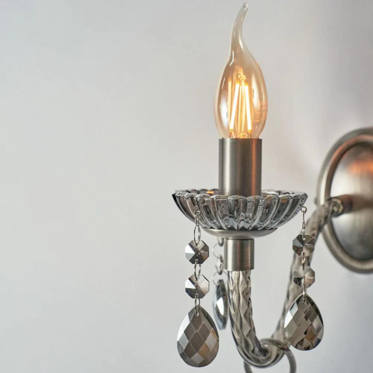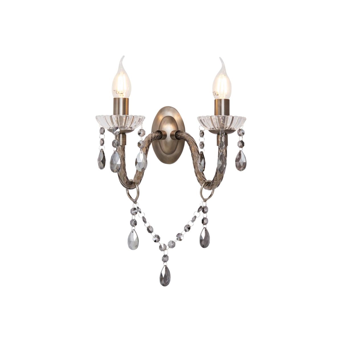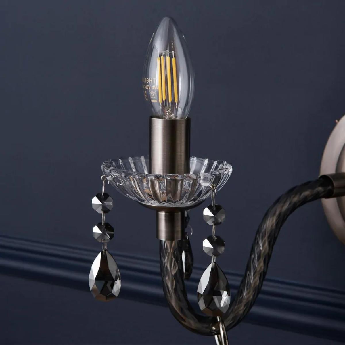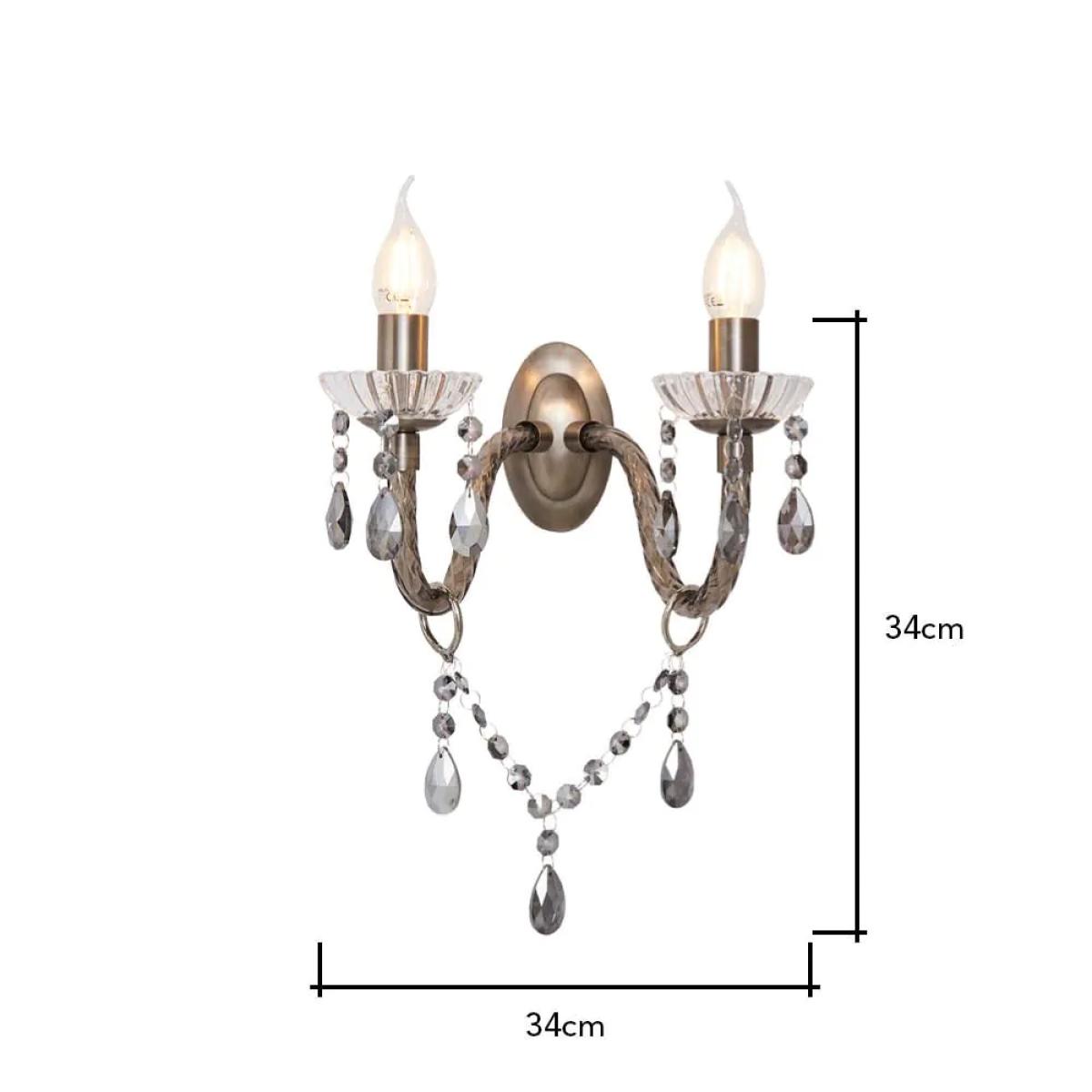 Bring a glamorous touch to your living room or bedroom with the Darlia 2 Light Wall Light. This wall lamp comes in a pewter finish for a refined sophisticated appearance and looks ideal when styled in pairs on either side of a bed, hallway, or mirror. It also comes decorated in stunning smoke tinted crystal effect droplets which sparkle as they reflect the light outwards, and features traditional style candle-like sconces for a classic elegance to your home.