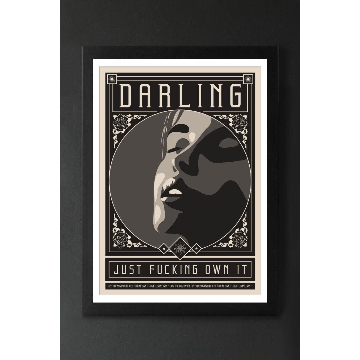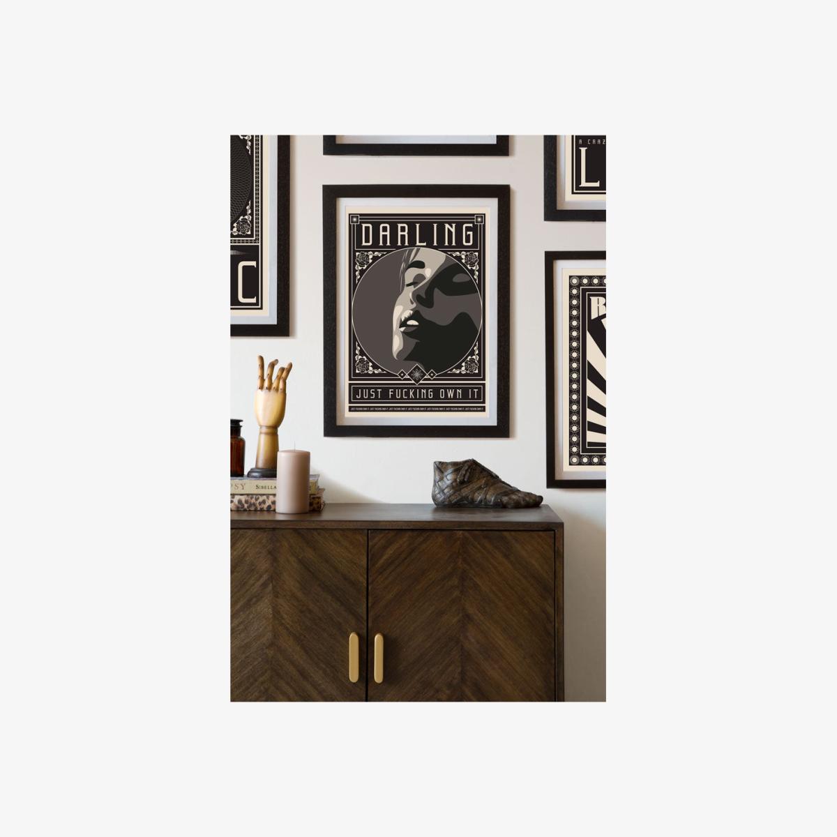 About The Darling Just Fucking Own It Art Print A piece that exudes ultimate sass and glorious style, the Darling Just Fucking Own It Art Print is a playful addition to any home interior. This high quality A2 Print is available Framed on Unframed, showcasing a marvellous monochrome design with a gorgeous female, this Pop Art Print will make a great gift idea for a special someone that loves a swear! Why We Think You’ll Love The Black And White Art Print An Abstract Art Print that dares to be different, this fabulous female will inject effortless glamour onto any wall with words that will put a smile on your face. Featuring brilliant phrase to live by, this Modern Art Print is wonderfully eccentric with beautiful decorative details on the print that encapsulates an elegant yet rock and roll style, so what’s not to love?! Where To Style Contemporary Art Print Display this Art Print in your bedroom as a gorgeous piece of unframed or framed wall art to create a sumptuously stunning corner that can be paired with a chic monochrome scheme and daring colours too. Part of a collection of statement abstract retro style prints, shop the whole range to create a quirky style spot using this Lady Face Wall Art Print along with additional framed art to create the wow factor in your space.