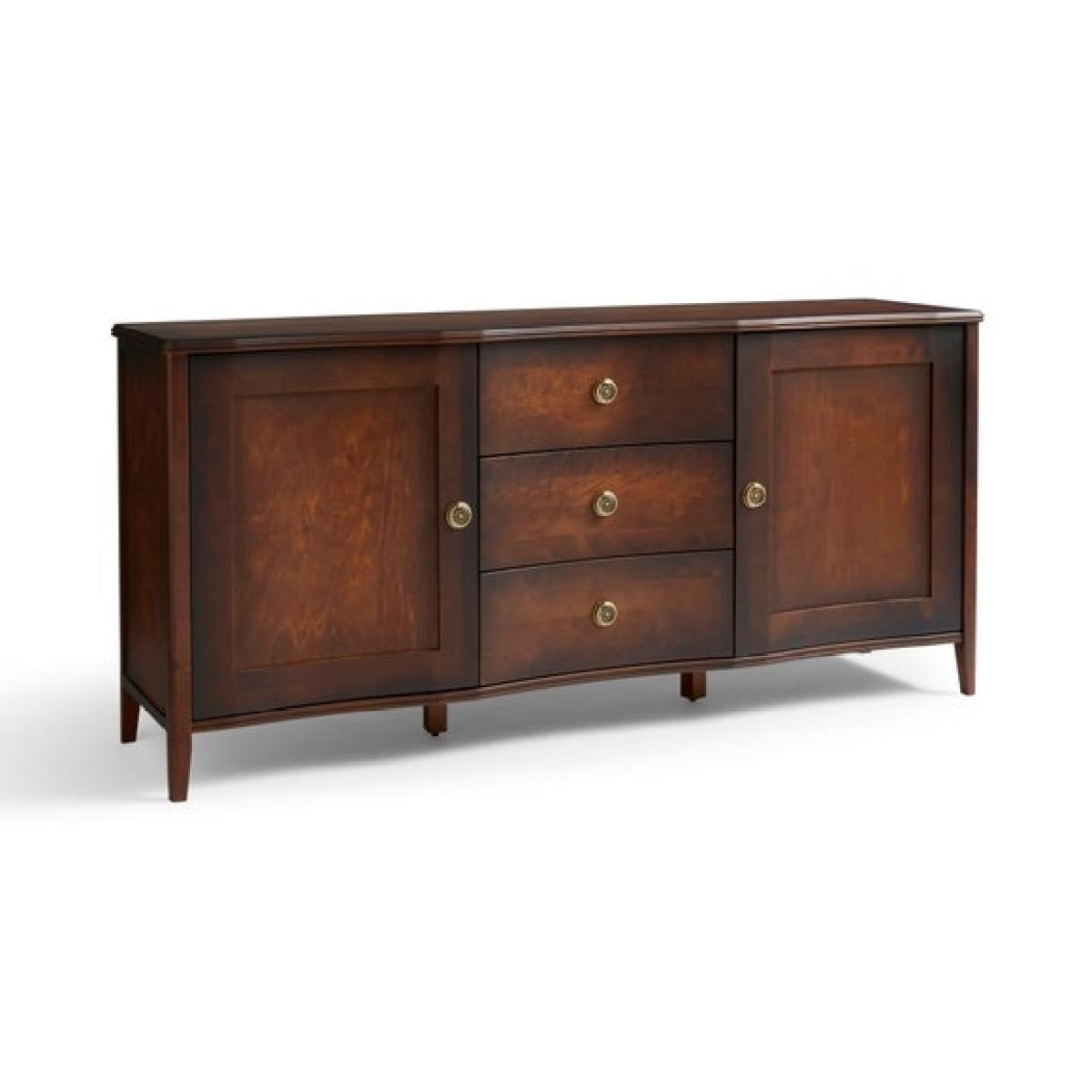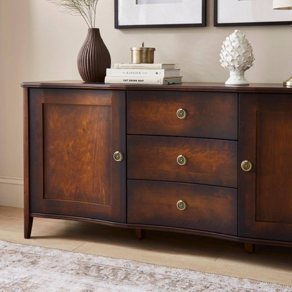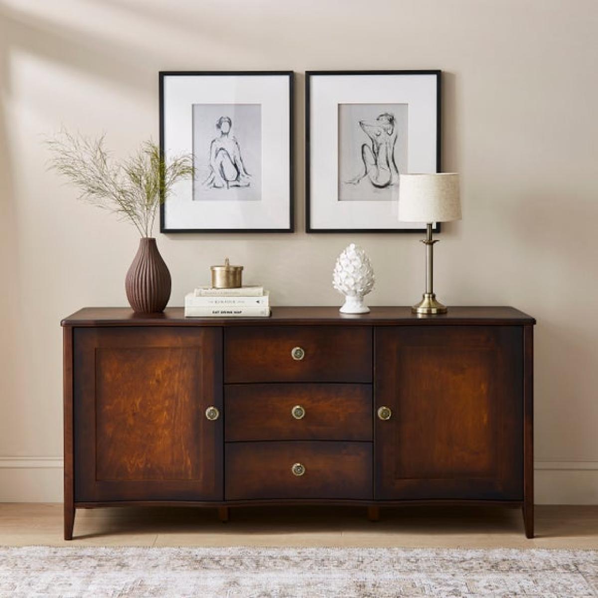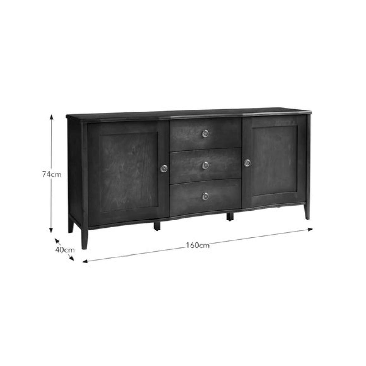 * Solid birch frame * Curved drawer fronts * Soft close drawers A sophisticated storage solution that blends traditional craftsmanship with modern functionality. This sideboard features beautifully turned legs that lend a classic touch, while the dark stained finish adds depth and elegance to any interior. Designed with soft-close drawers for a smooth and quiet experience, it also includes removable and adjustable shelving to suit your storage needs.
