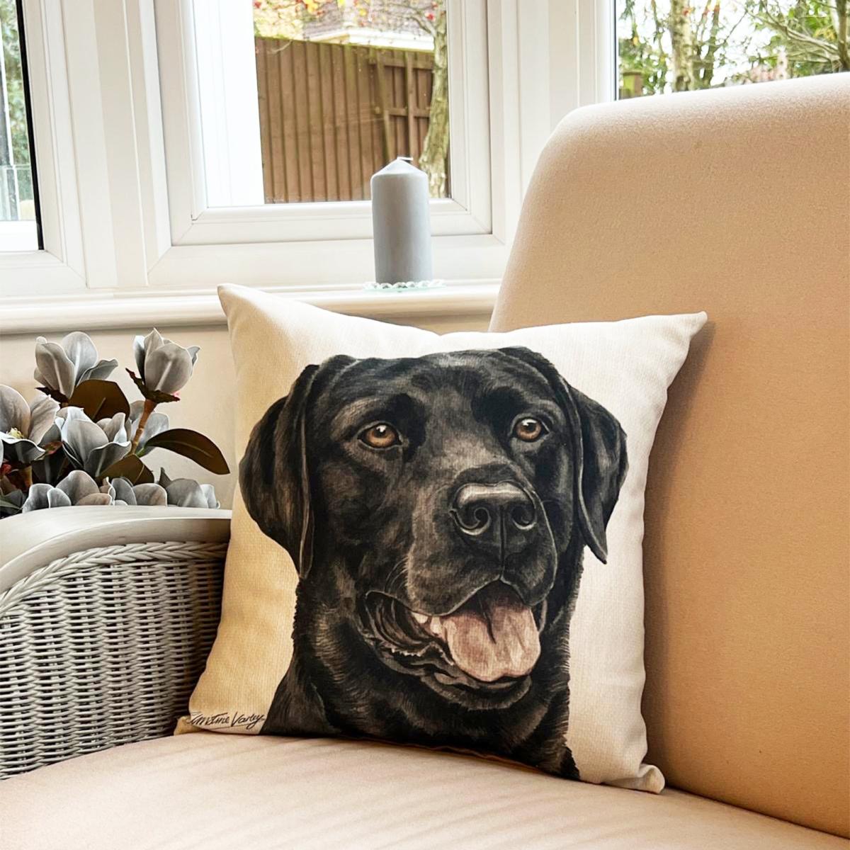 * Black labrador print by artist Christine Varley* Suede effect reverse* Removable cover* Polyester filling* Zip closure Dog lovers will go barking mad for this scatter cushion designed by artist Christine Varley. Featuring a lovable Black Labrador print with a plain suede effect reverse, this cushion has a removable cover with zip closure for easy maintenance. Simply wipe clean and line dry to keep it looking fresh. The polyester fibre filling will ensure this cushion stays fuller for longer - a great addition to a country style interior or gift for your favourite animal fan.