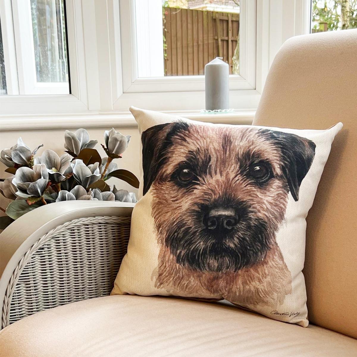 * Border Terrier print by artist Christine Varley* Suede effect reverse* Zip closure* Removable cover* Polyester filling This scatter cushion features an adorable Border Terrier dog print designed by artist Christine Varley. With a plain suede effect reverse, this cushion has a removable cover with zip closure for simple cleaning. Just wipe clean and line dry to keep it looking fresh. The polyester fibre filling will keep this cushion fuller for longer. This would make a lovely gift for an animal lover or a great addition to your own country style interior.