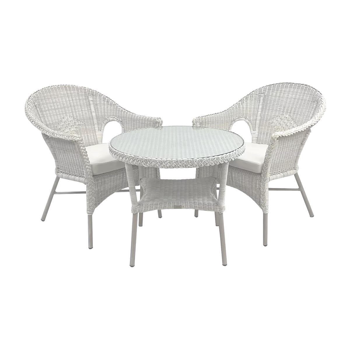 Created using a vintage French lace weave, this Cebu bistro set seats up to two people in the garden or conservatory. The bistro table offers style and practicality with a shelf and toughened glass top. Seat cushion pads made using water and UV-resistant fabrics are filled with foam and fibre inners giving you a perfect sit in the sun. The UV and frost-resistant rattan weave is hand woven onto rust-free, powder-coated aluminium frames making the set weather-resistant so it can be left outside all year round. Cushions should be stored away when not in use. The set stacks for easy storage. Key features: Two Cebu bistro chairs with base cushion pads in Oakley Canvas outdoor fabric Cebu round bistro table with shelf and toughened glass top Reversible UK-manufactured cushions 3mm round core all-weather synthetic weave UV, weather-resistant and chlorine-resistant outdoor fabrics Durable powder-coated rust-free aluminium frames Low maintenance set and no assembly required Small scatter cushions pictured are not included Set stacks for compact storage 4-year extended manufacturer's frame warranty when registered within 28 days