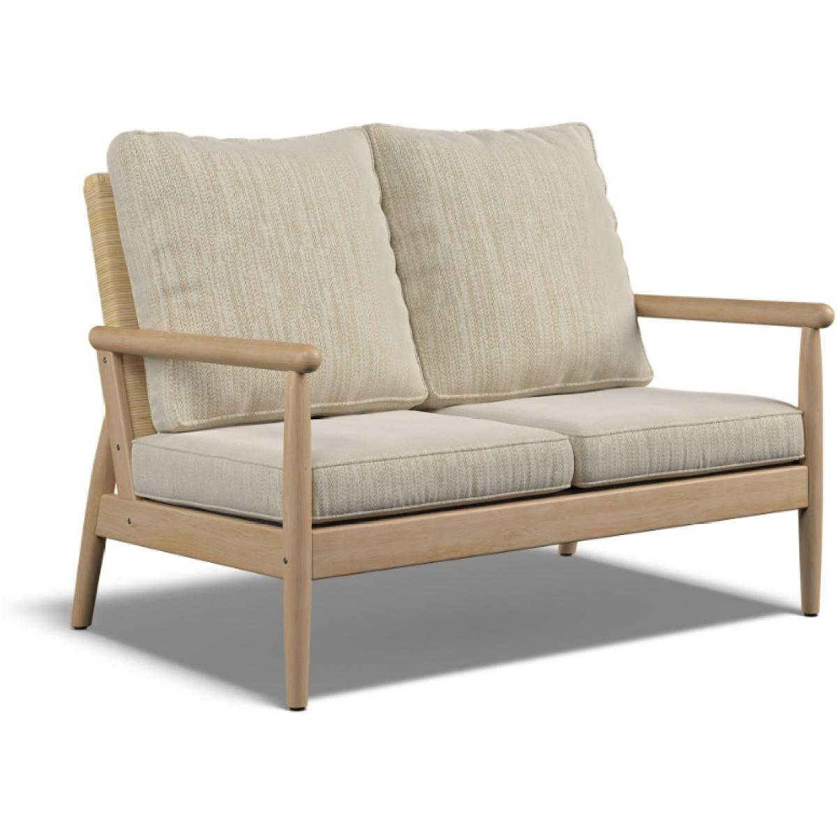 The Dorchester lounging 2 seater sofa is perfect for two of you, featuring a sleek Mindi wood frame and rounded wooden arms with a handwoven backrest in a light Oak finish. The rounded Mindi wood side and coffee tables echo the curved design on the arms. Exclusive design Hand crafted Mindi Wood Choice of fabrics, removable covers 1 Year Manufacturer's Guarantee Dimensions: Height 90cm  Width 129cm Depth 88cm  All screens vary in colour reproduction and whilst every effort has been made to display the colour as accurately as possible it is for guidance only