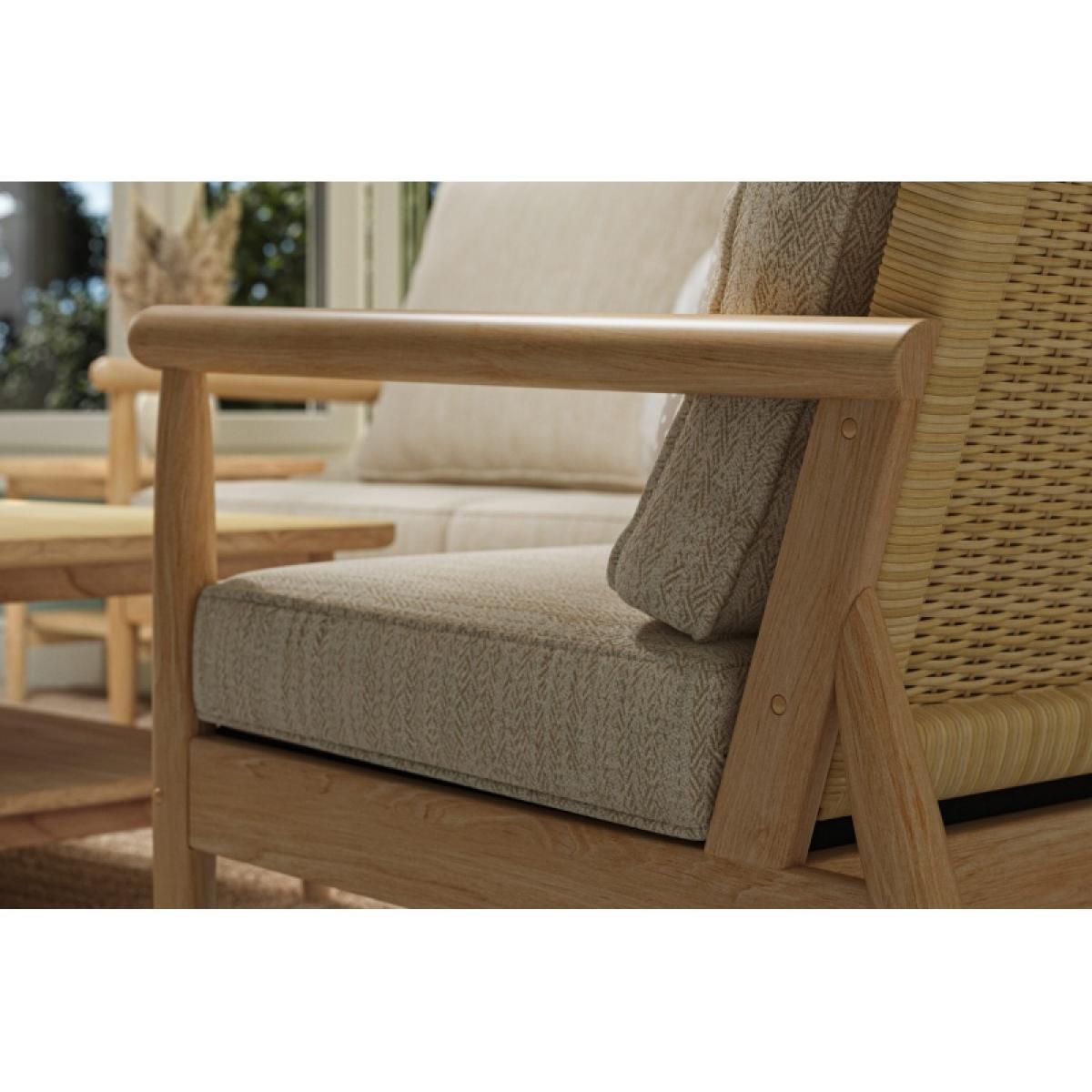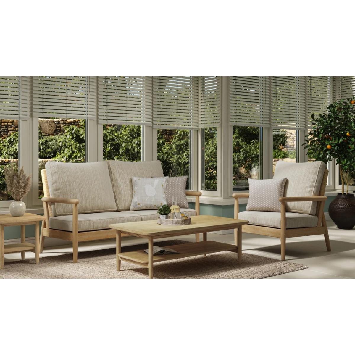 The Dorchester lounging 2 seater sofa is perfect for two of you, featuring a sleek Mindi wood frame and rounded wooden arms with a handwoven backrest in a light Oak finish. The rounded Mindi wood side and coffee tables echo the curved design on the arms. Exclusive design Hand crafted Mindi Wood Choice of fabrics, removable covers 1 Year Manufacturer's Guarantee Dimensions: Height 90cm  Width 129cm Depth 88cm  All screens vary in colour reproduction and whilst every effort has been made to display the colour as accurately as possible it is for guidance only