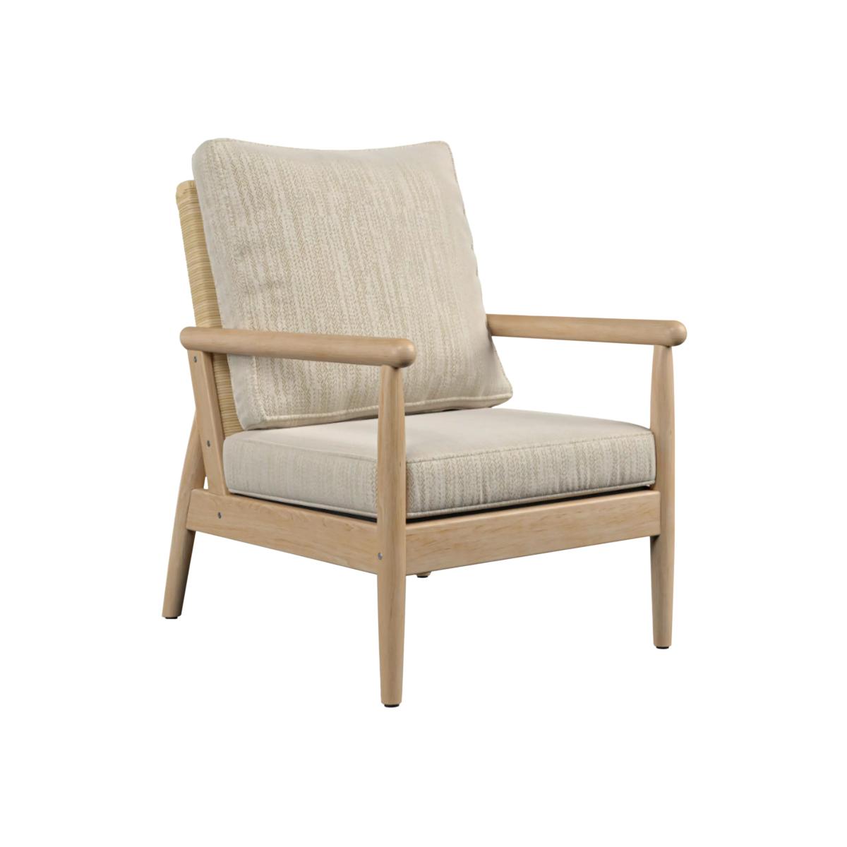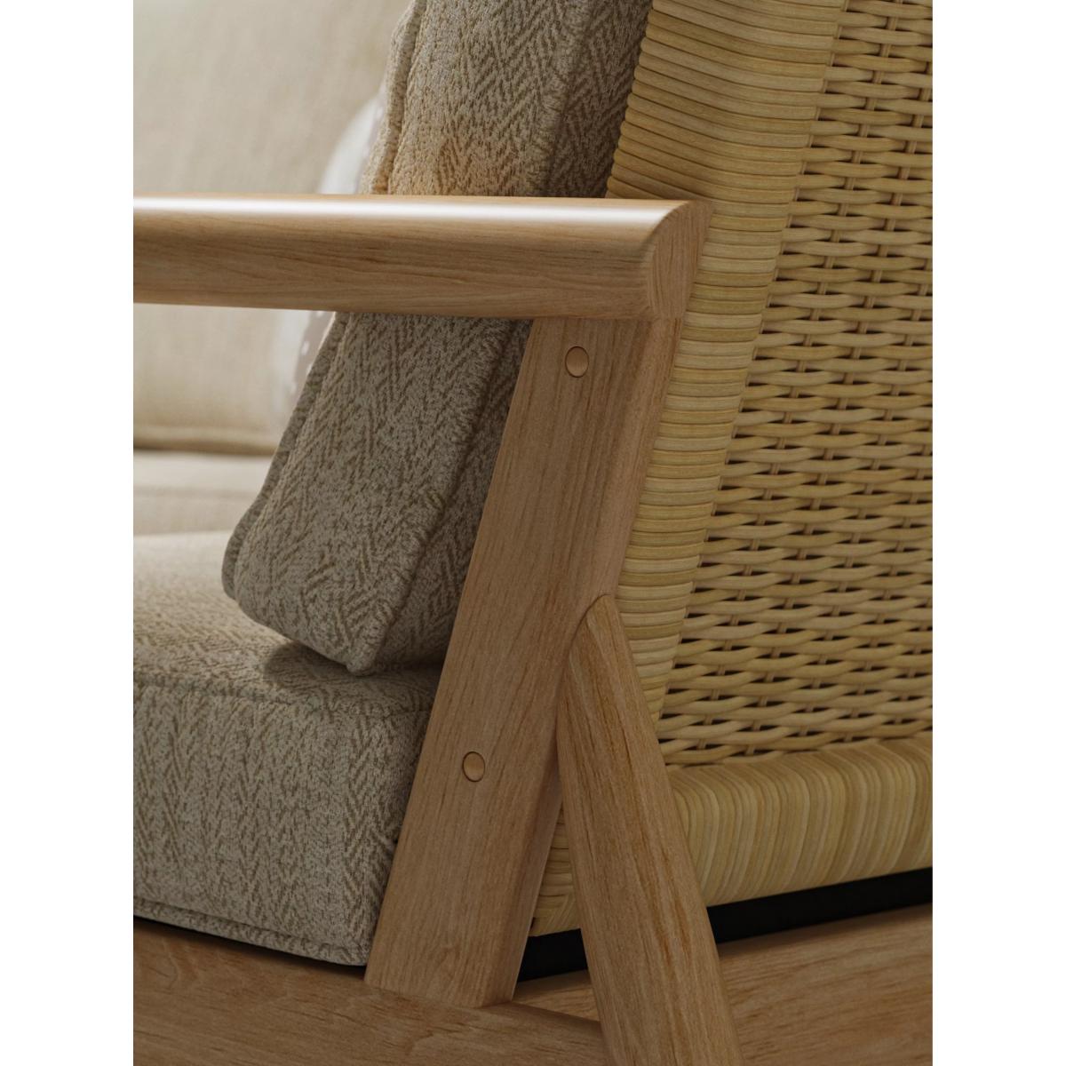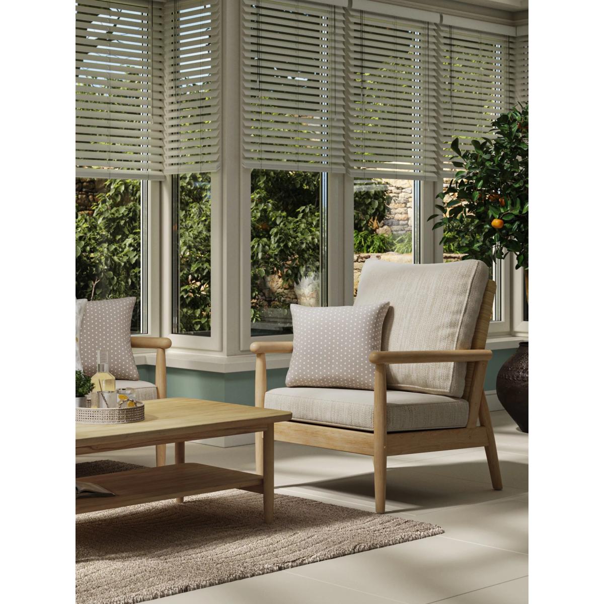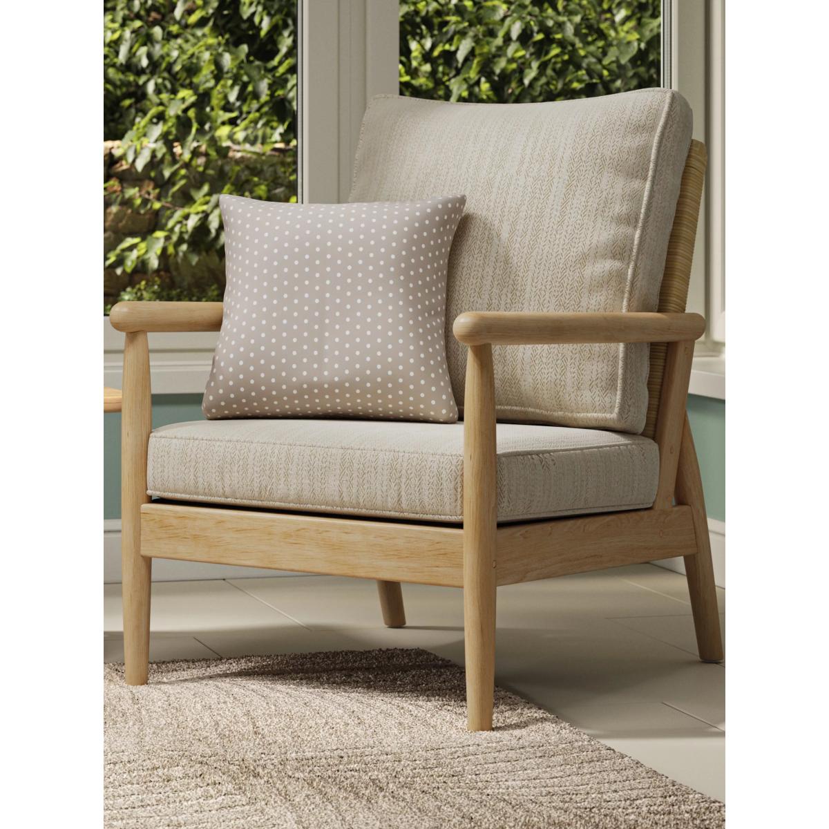 The Dorchester chair features a sleek Mindi wood frame and rounded wooden arms with a handwoven rattan backrest in a light oak finish. This contemporary lounging chair is designed to enhance any living space, whether it's a conservatory, orangery or an open-plan environment. The chair includes one base cushion and one backrest cushion. Mindi wood frame handcrafted in Indonesia Natural rattan backrest Reversible UK-manufactured cushions with quality foam bases and fibre-filled cushioning Small scatter cushions pictured are not included Low maintenance and no assembly required 2-year extended manufacturer's frame warranty when registered within 28 days
