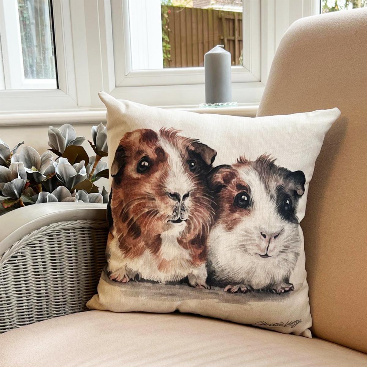 * Guinea Pigs print by artist Christine Varley* Suede effect reverse* Removable cover* Zip closure* Polyester filling This scatter cushion has been designed by artist Christine Varley and features a cute Guinea Pig print with a plain suede effect reverse. It has a removable cover with zip closure for easy cleaning - simply wipe clean and line dry to keep it looking fresh. The polyester fibre filling will ensure this cushion stays fuller for longer. This would make a lovely gift for your favourite animal lover, or a great addition to a country style interior.