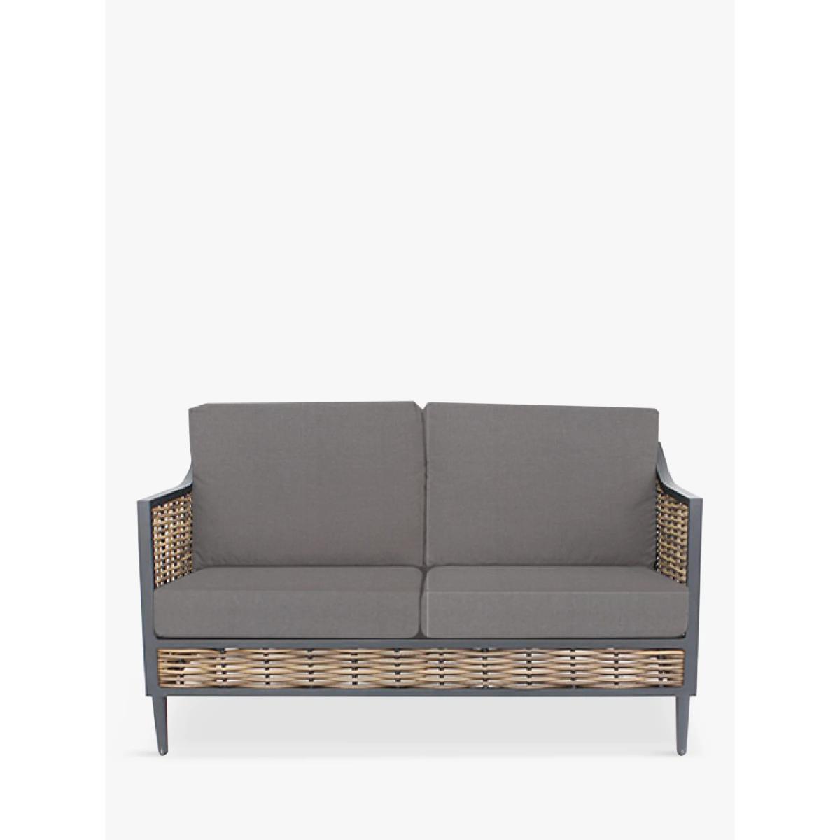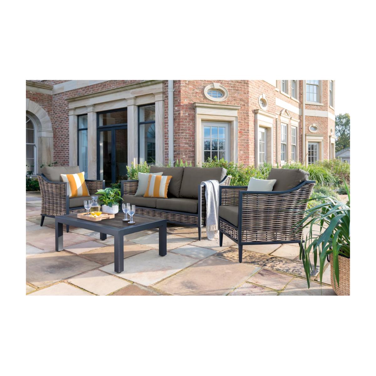The striking Langley set adds drama to any large patio with its chunky 10mm raffia weave, bordered with powder-coated all-weather aluminium frames and topped with deep-seated cushioning. This set offers comfortable lounging with two lounge chairs, a two-seater sofa and rectangular coffee table. Plush cushions made using water and UV-resistant fabrics are filled with foam and fibre inners giving you a perfect sit in the sun. The set includes two plain 40cm scatter cushions and two 40cm scatter cushions in Laura Ashley's Lille Stripe Ochre print. The UV and frost-resistant rattan weave is hand woven onto rust-free powder-coated aluminium frames making the set weather-resistant so it can be left outside all year round. Cushions should be stored away when not in use. Key features: Two Langley lounge chairs with Oakley Taupe outdoor fabric cushions Langley 2-seater sofa with Oakley Taupe outdoor fabric cushions Verde rectangular exposed aluminium coffee table Two Oakley Canvas 40cm outdoor scatter cushions Two Laura Ashley Lille Stripe Ochre 40cm outdoor scatter cushions Reversible UK-manufactured cushions with upholstery quality foam bases and fibre-filled scatter cushions 10mm round core all-weather synthetic weave in Raffia colour UV, weather-resistant and chlorine-resistant outdoor fabrics Durable powder-coated rust-free aluminium frames in Matt Black Low maintenance set and no assembly required 5-year guarantee on the frames, 1-year guarantee on the cushions