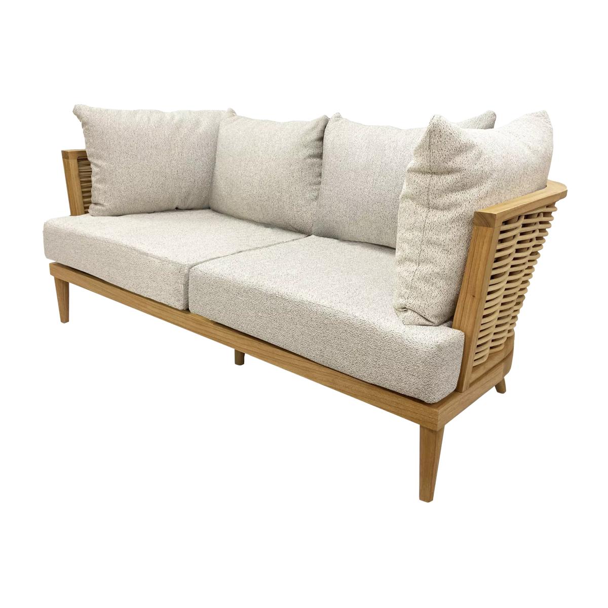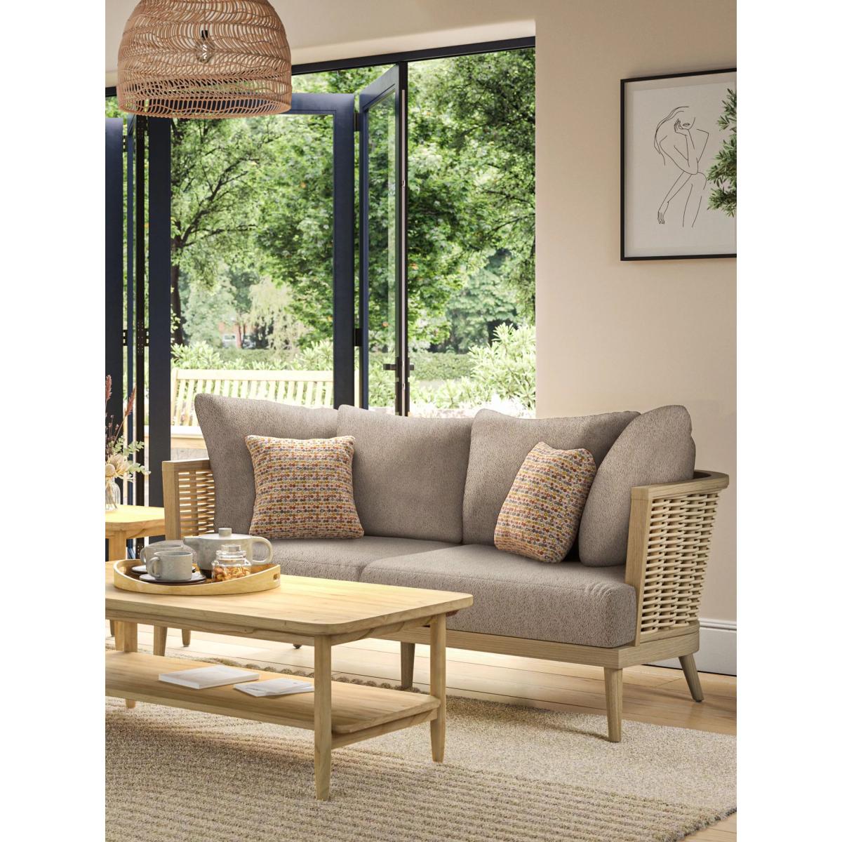 The exquisite Martinque sofa perfectly blends elegance and comfort. Crafted from premium Mindi wood and large-format natural rattan, this striking curved piece is designed to enhance any living space, whether it's a conservatory, orangery or an open-plan environment. The contemporary sofa includes two base cushions and four backrest cushions in Daro's Mindelo fabric. Curved 2.5-seater sofa with a Mindi wood frame Natural rattan handwoven in Indonesia Reversible UK-manufactured quality foam base cushions and fibre-filled backrest cushions Small scatter cushions pictured are not included Low maintenance 2-year extended manufacturer's frame warranty when registered within 28 days