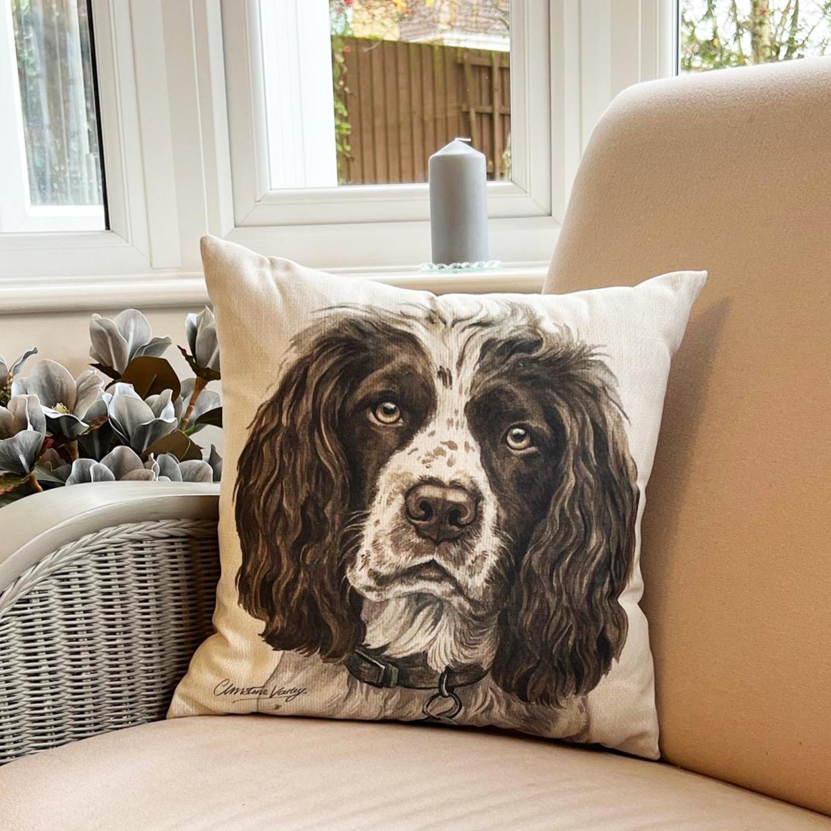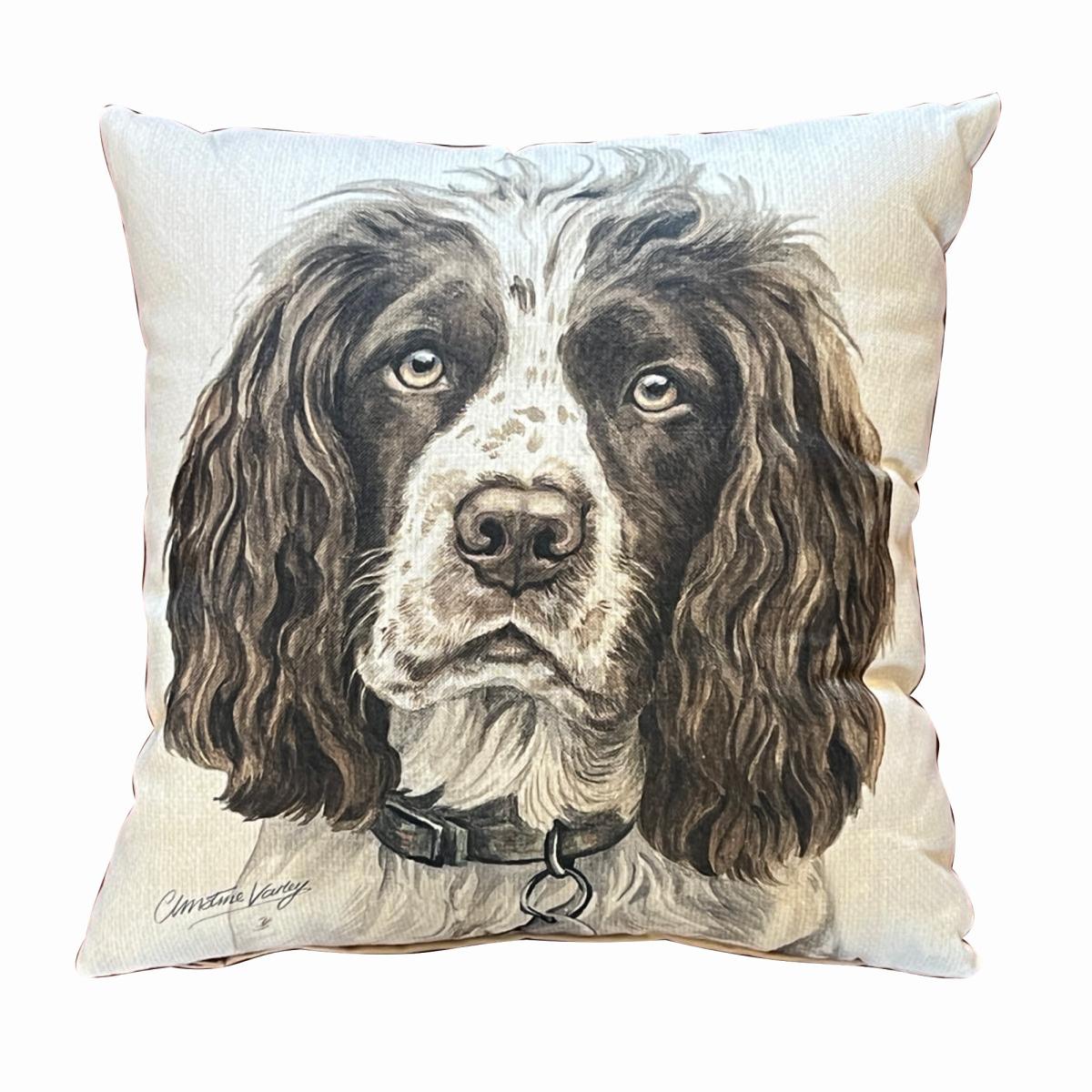 * Springer Spaniel print by artist Christine Varley* Suede effect reverse* Removable cover* Polyester filling* Zip closure Designed by artist Christine Varley, this cushion has a highly detailed Springer Spaniel print with a plain suede effect reverse. A removable cover with zip closure makes for easy cleaning - simply wipe clean and line dry to keep it looking its best. The polyester fibre filling will ensure this cushion stays fuller for longer. This would be a fabulous addition to a country style interior or the perfect gift for the dog lover in your life.