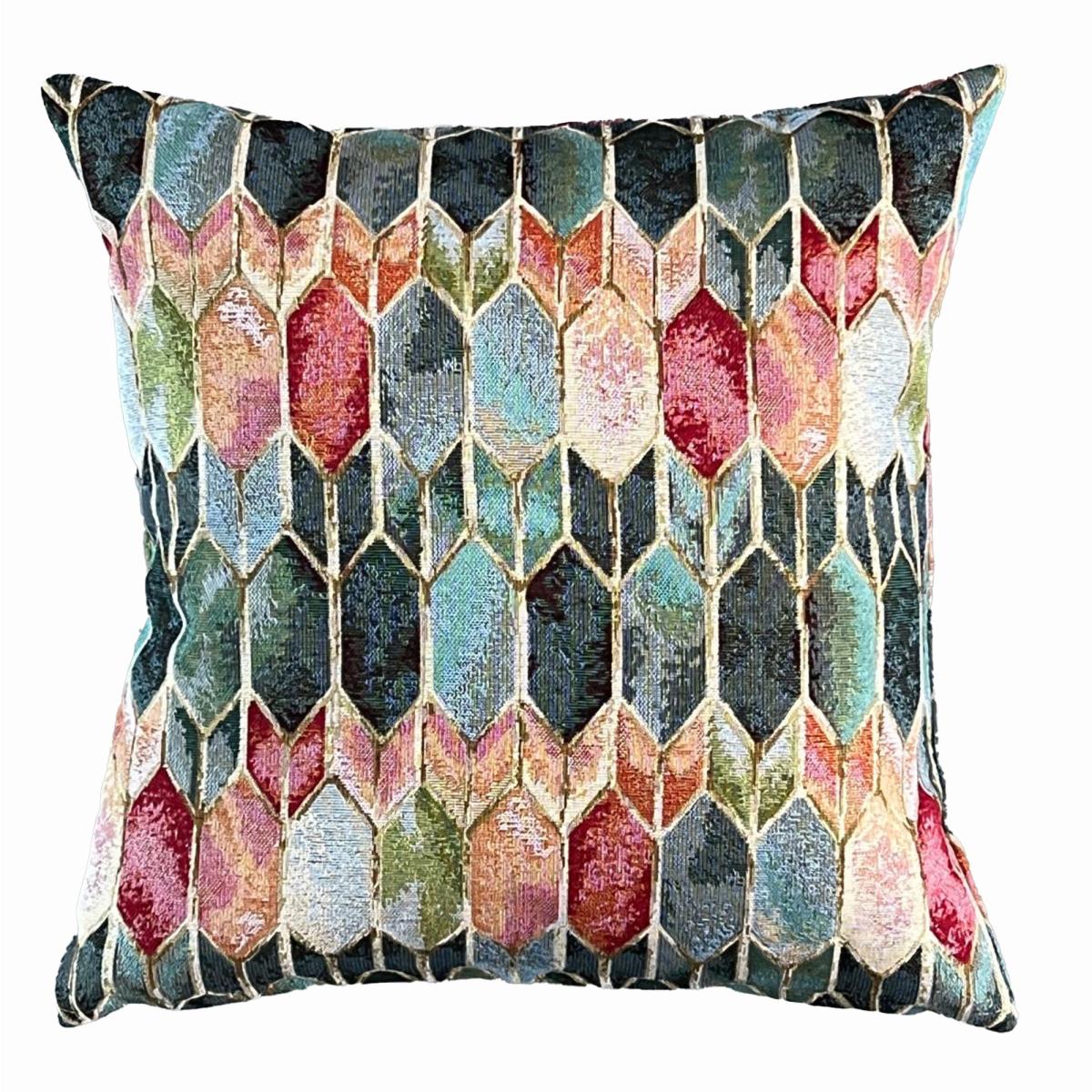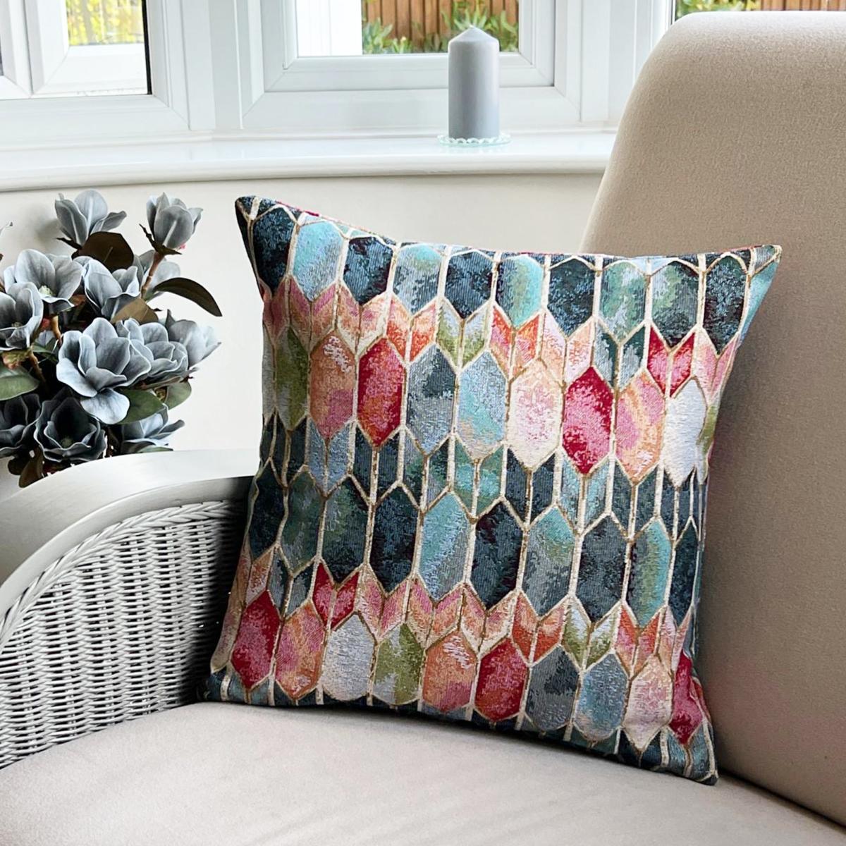 * Watercolour effect* Multicoloured 'Stained Glass' pattern* Lovely addition to art deco themes* Choice of fillings, or cover only Add a lovely splash of colour to an art deco or retro theme with this Mullion patterned square cushion from Daro. The cover is removable with a zip closure, and is available with either feather or polyester fibre fillings, or as cover only for use with your own cushion insert. It's also available in a rectangular shape to suit different styles.