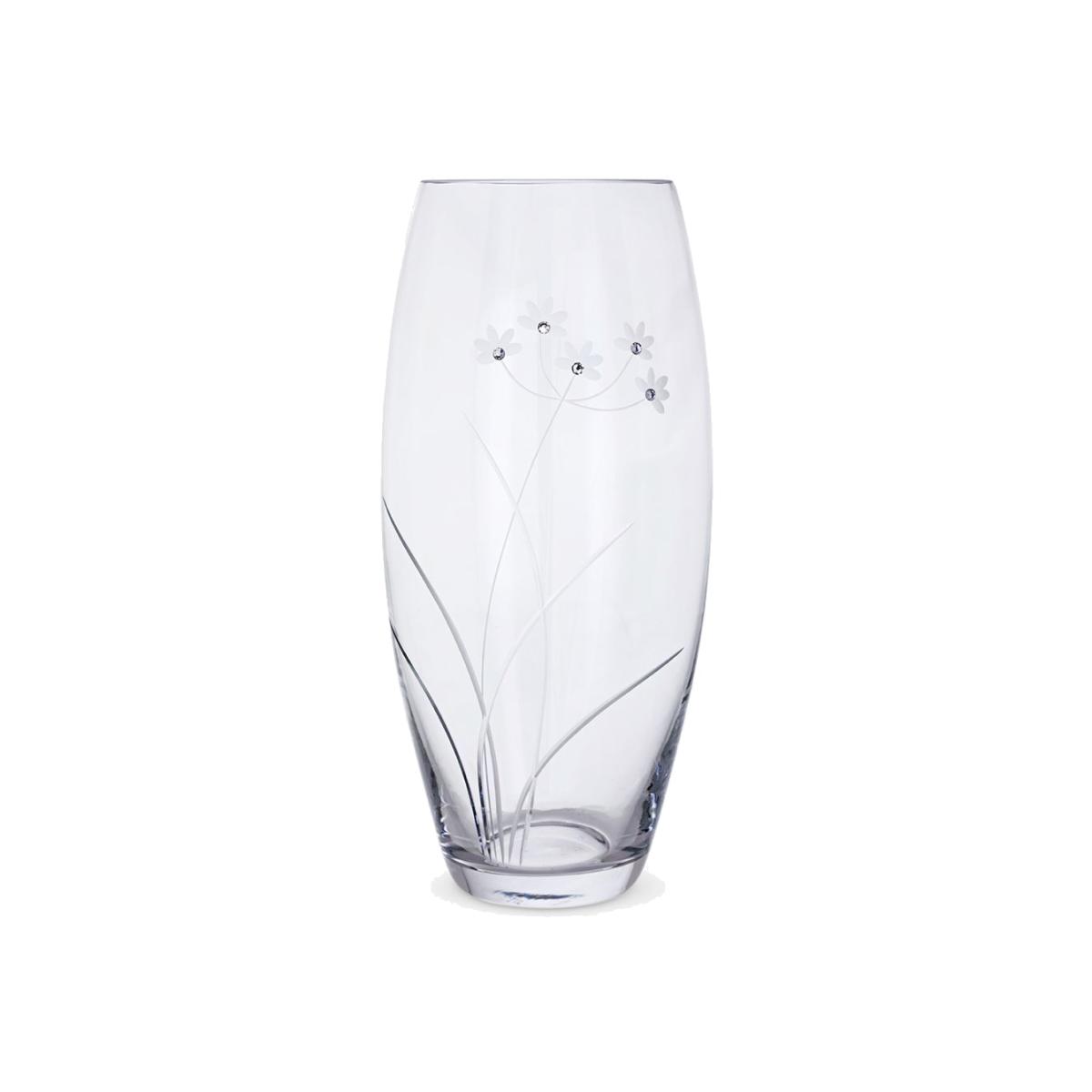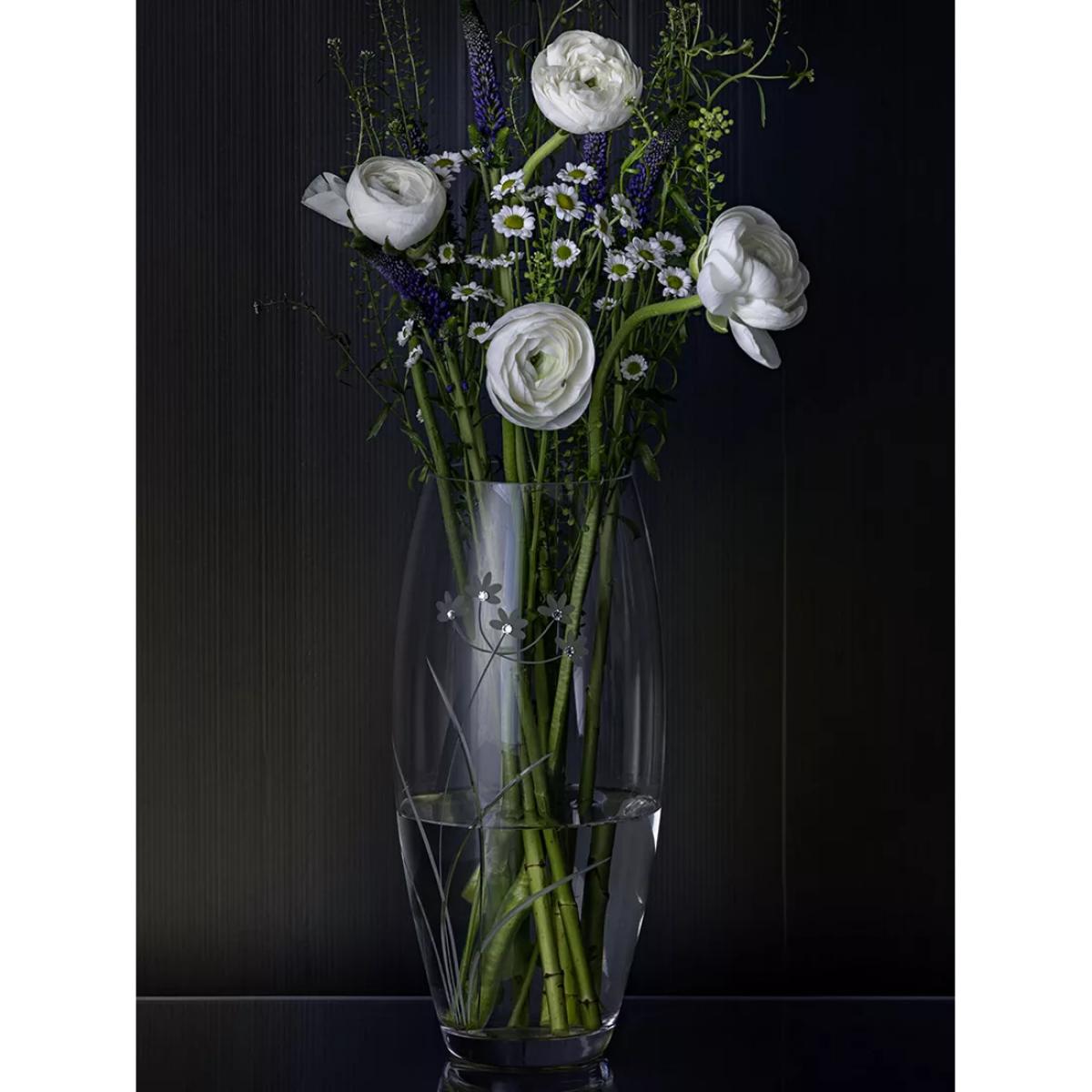 From Dartington Crystal's Glitz collection, this glass vase has a graceful lily design and standout sparkle accents. Intricate floral etchings circle the vase while glittering elements lend an eye-catching touch of glamour. Showcase this vase in the heart of your dining room or as part of an ornamental display.