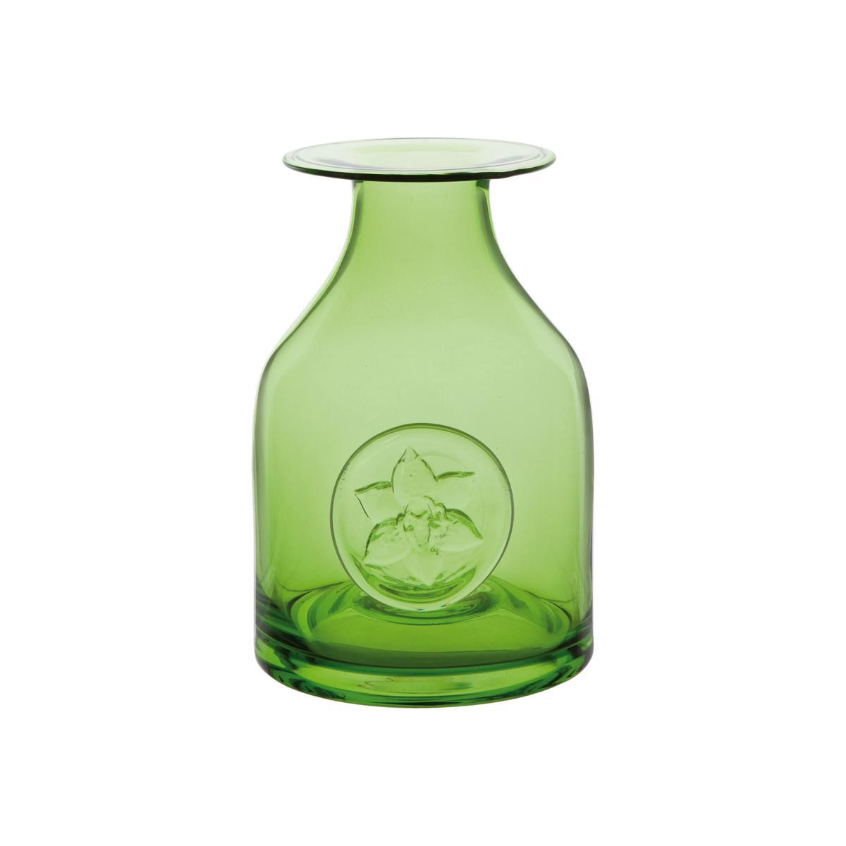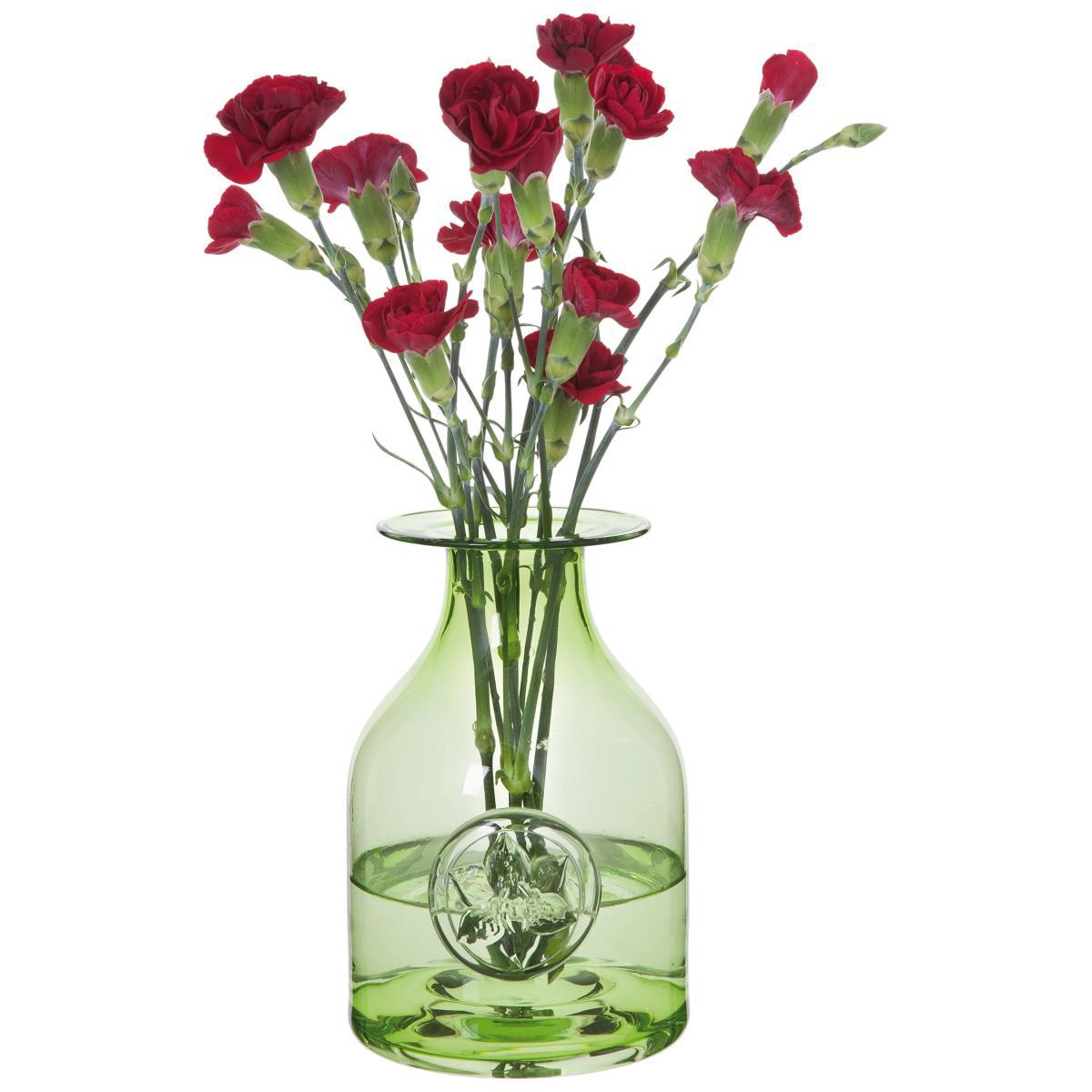 These mouth-blown, handcrafted bottle vases are ideal for displaying single stems and small bouquets, although the raised floral decoration at the front means they look great even when empty.