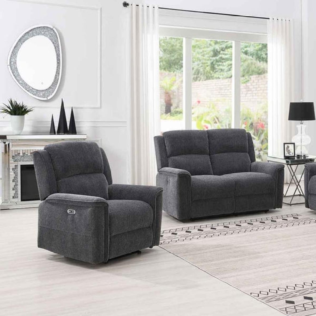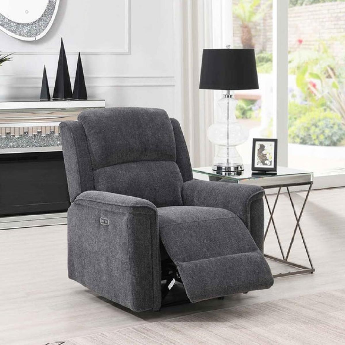 * Power recliner * Chenille fabric * Choice of colours * Medium support * Foam and fibre fillings Indulge in ultimate relaxation with this classic power recliner chair. Its supportive cushions, filled with a blend of foam and fibre, offer medium support for a comfortable seat. With a smooth power recline function, you can effortlessly find your perfect position, and the premium chenille fabric, available in a choice of light grey or dark grey, adds a luxurious touch.