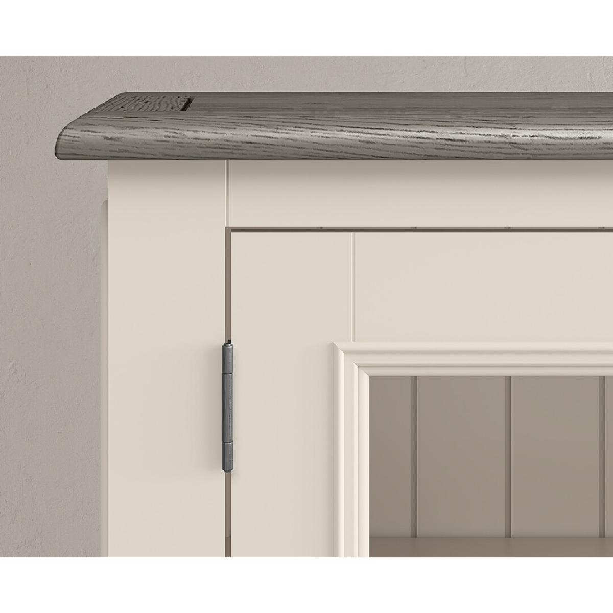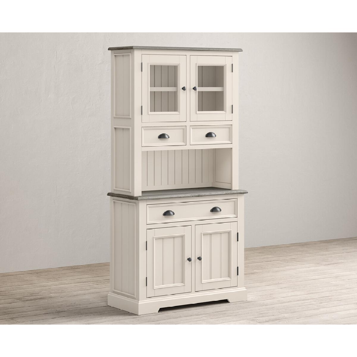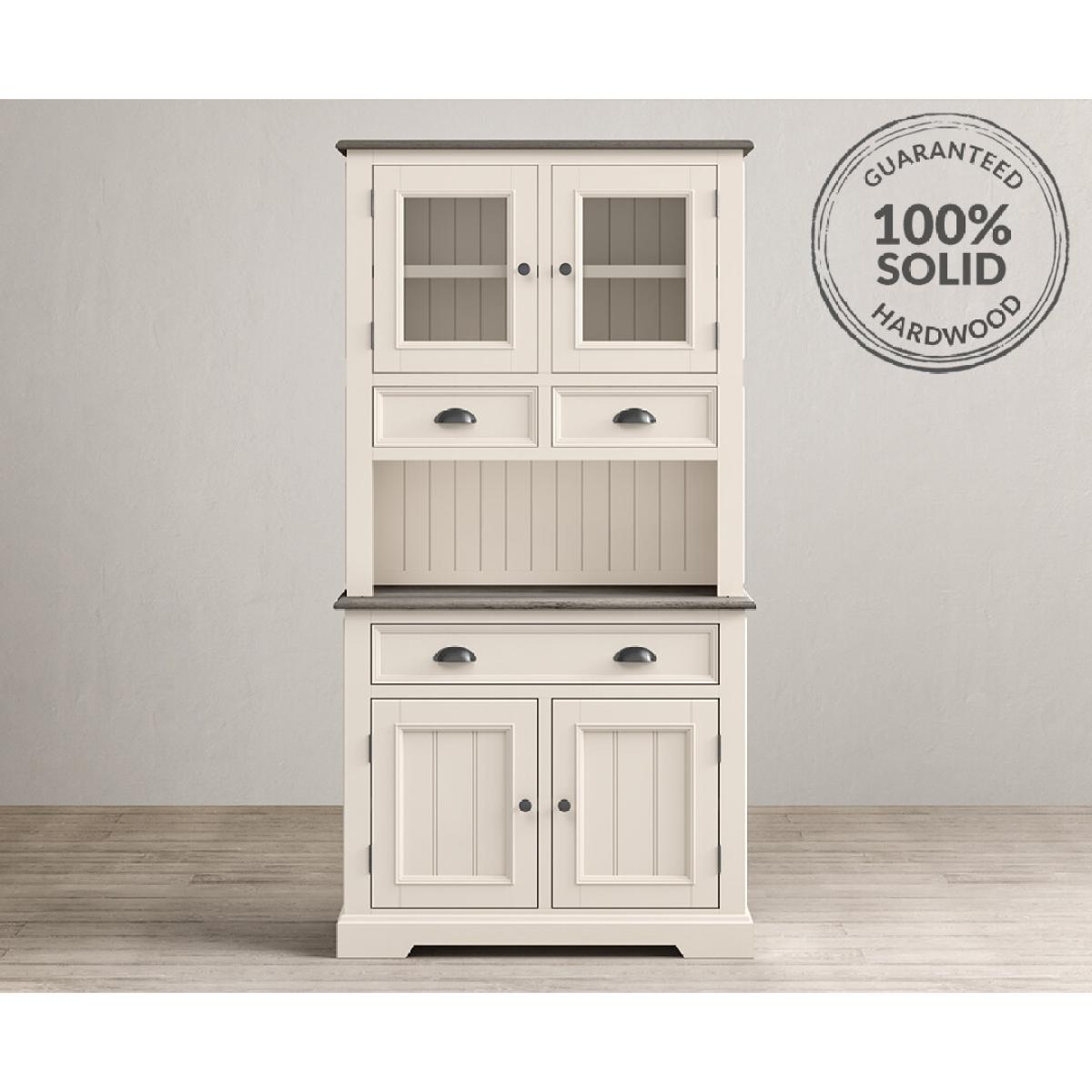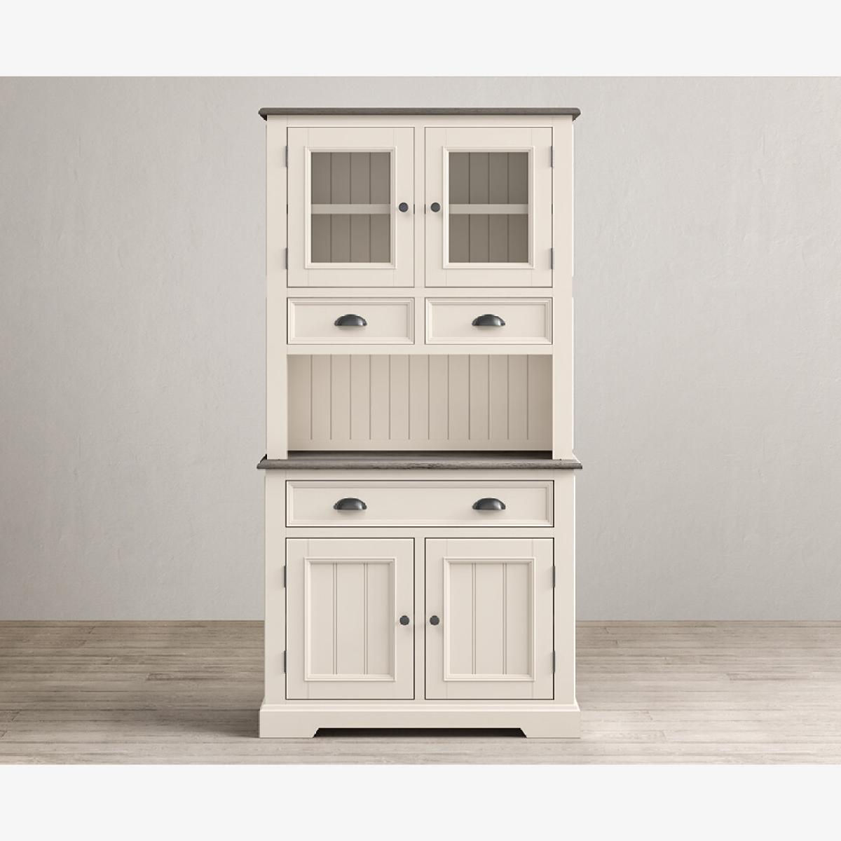 The Dartmouth Oak and Soft White Large Sideboard and Dresser Top feature solid hardwood frames with a white painted finish and 100% solid oak grey painted tops, with shelves, cupboards and Dovetail drawers.