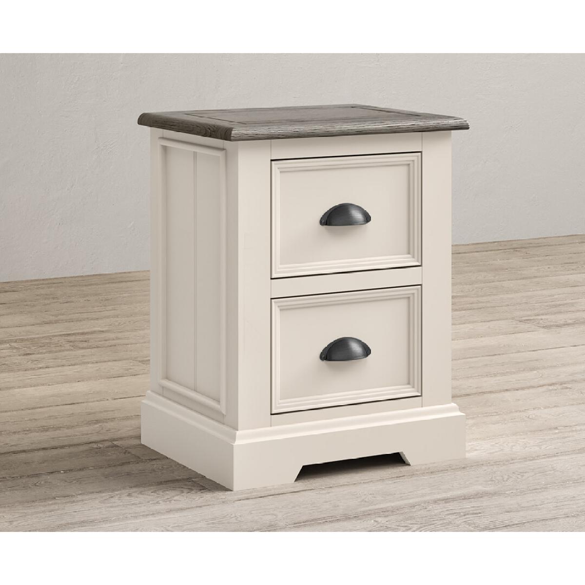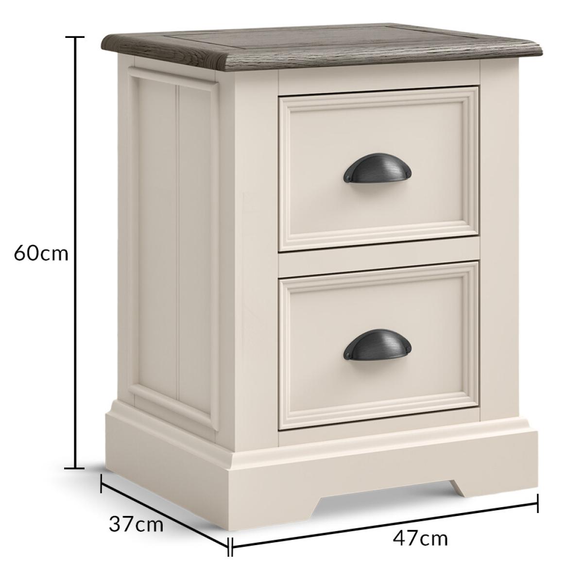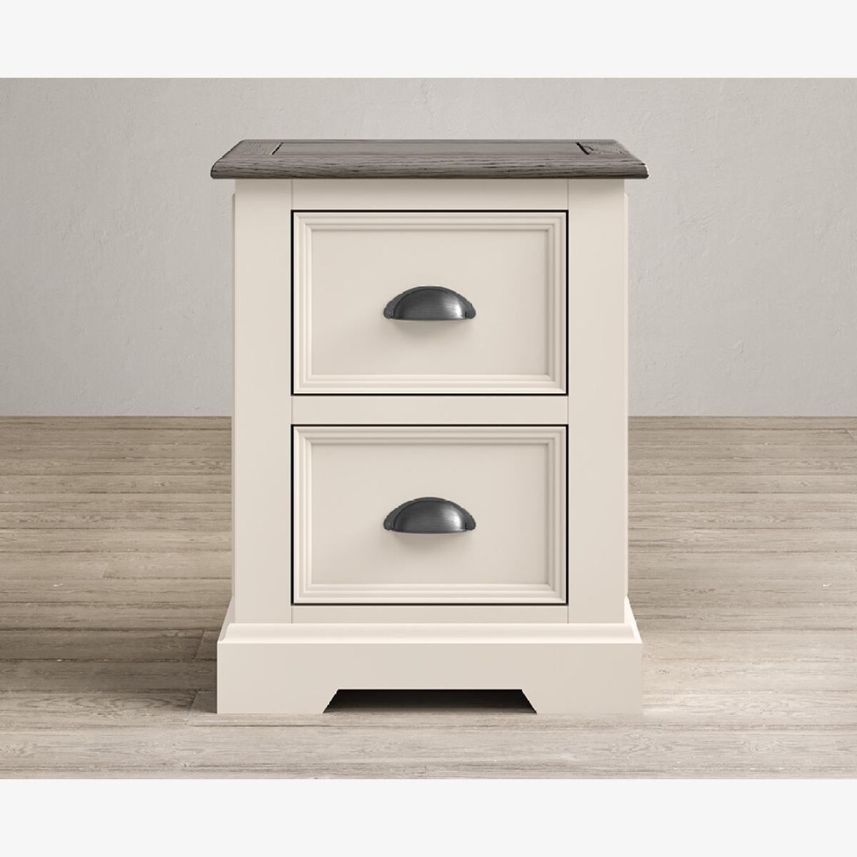 The Dartmouth Oak and Soft White 2 Drawer Bedside Chest is crafted from white painted solid hardwood, with a 100% solid oak top and two dovetail drawers on wooden runners.
