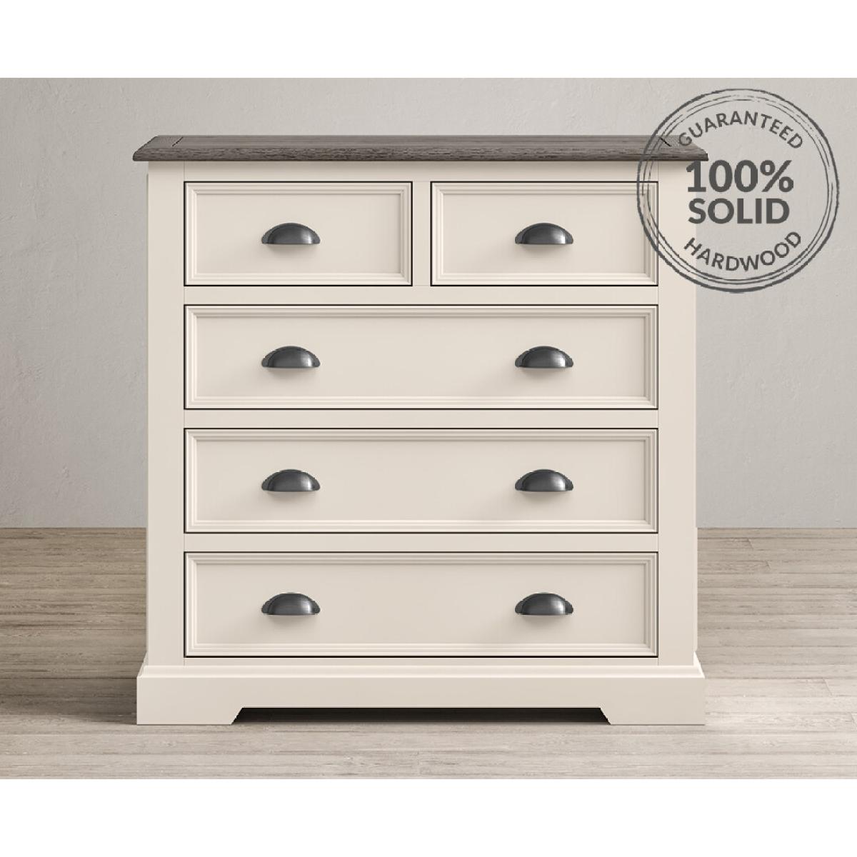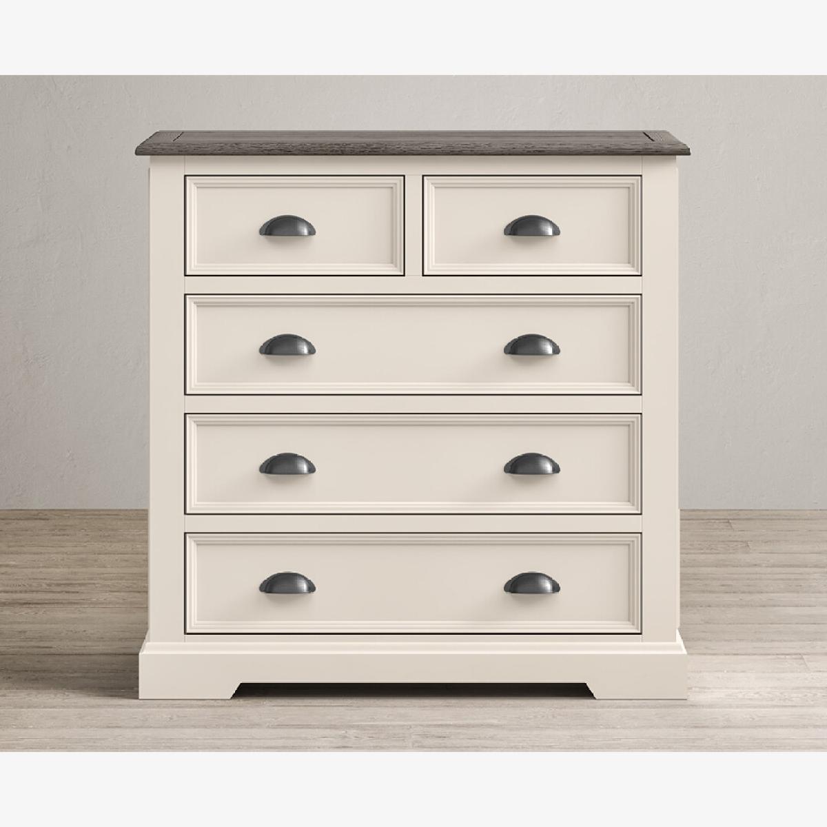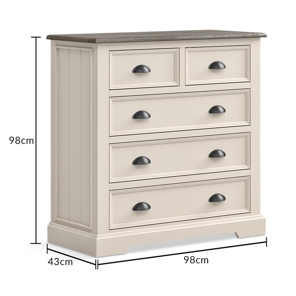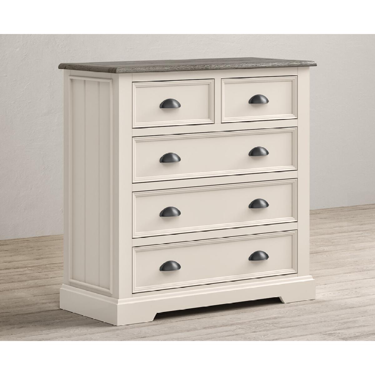 The Dartmouth Oak and Soft White 2 Over 3 Chest of drawers is crafted from solid hardwood with a soft white painted finish, topped with solid oak and featuring five dovetail drawers.