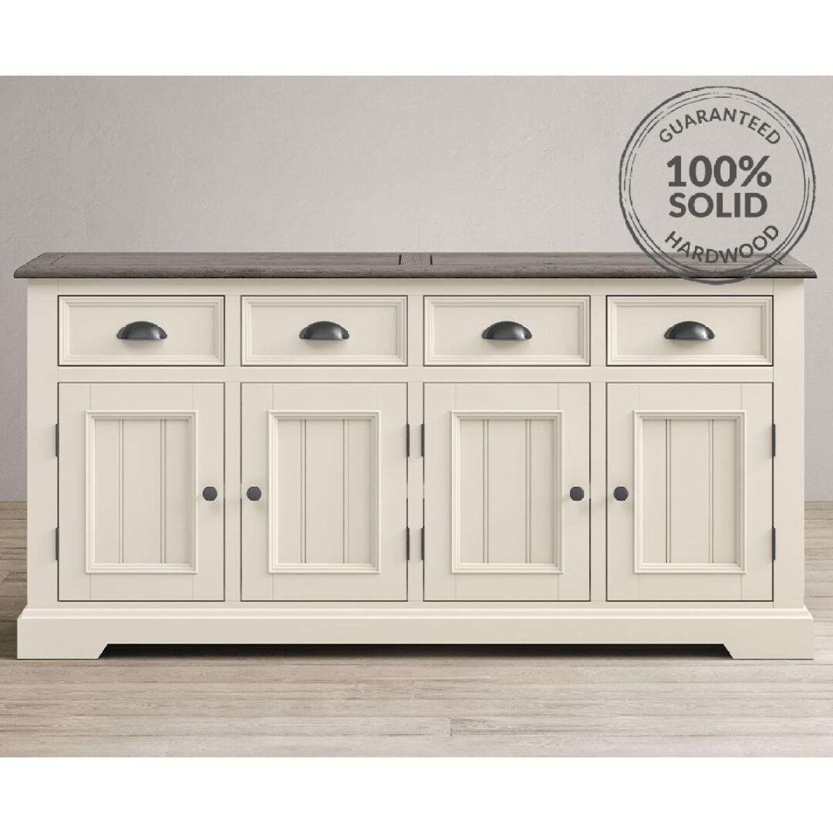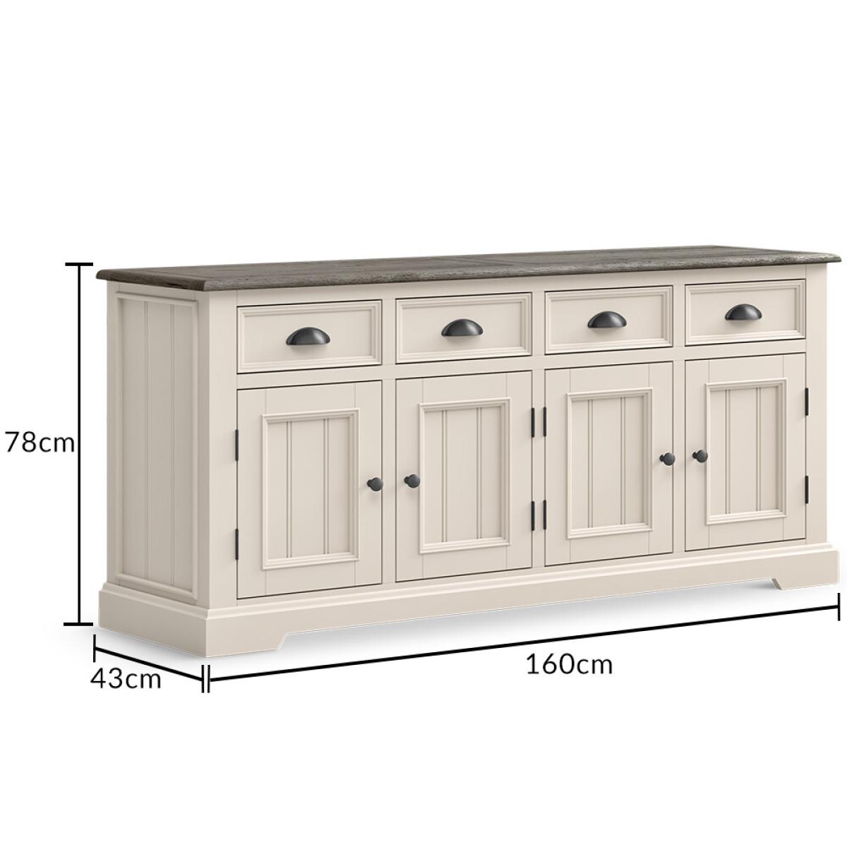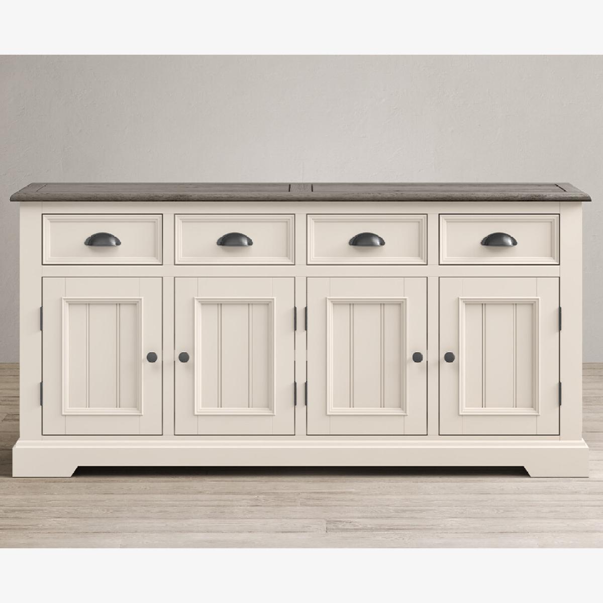 The Dartmouth Oak and Soft White Extra Large Sideboard features a white painted solid hardwood frame, with a 100% solid oak top. Cupboards and Dovetail drawers offer plenty of storage space.