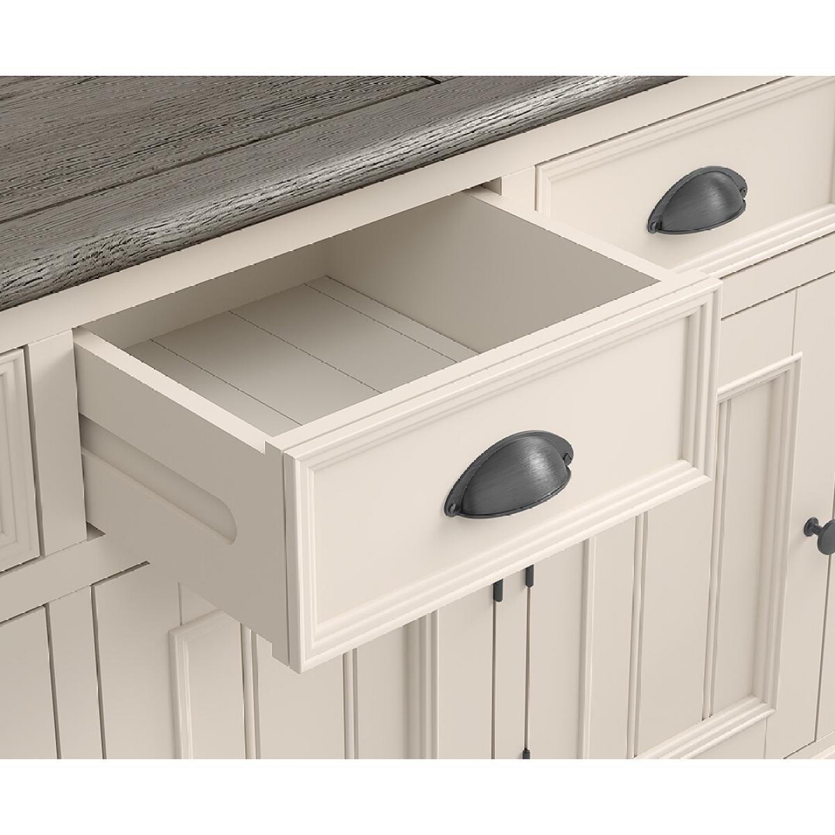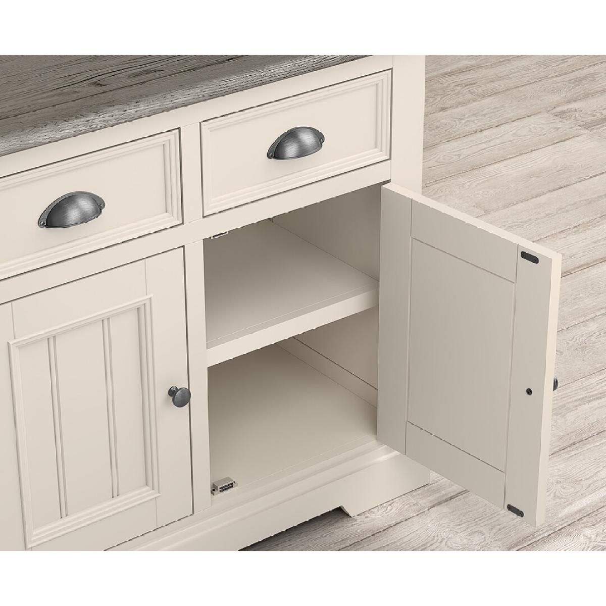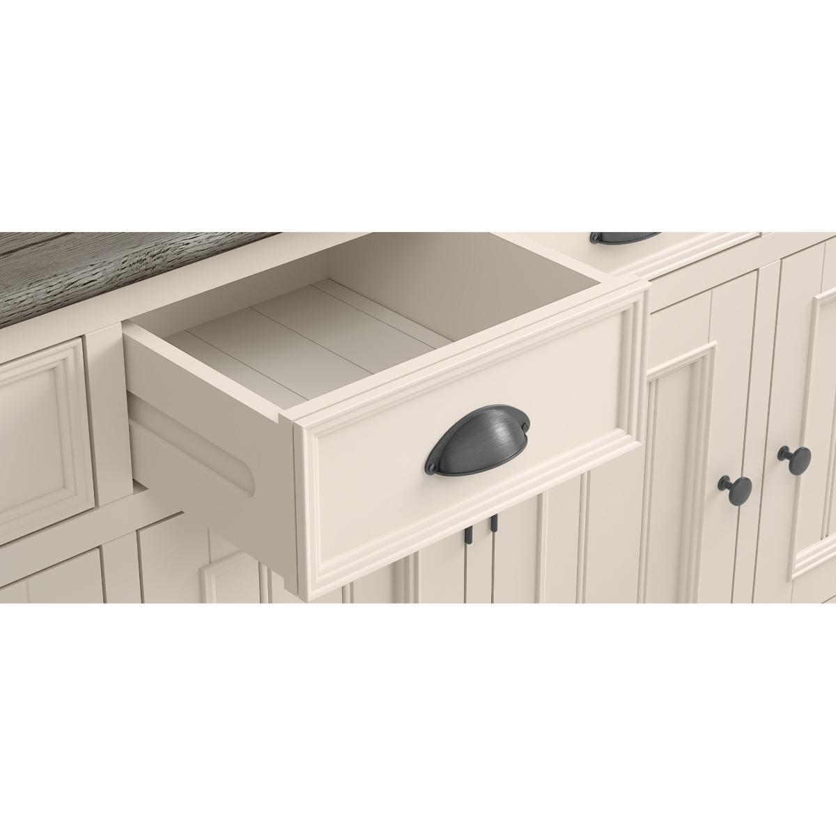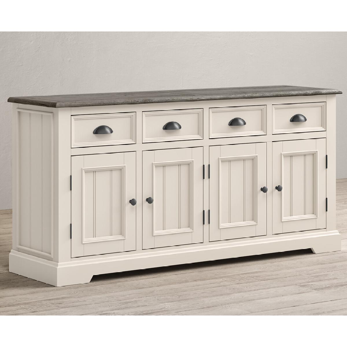 The Dartmouth Oak and Soft White Extra Large Sideboard features a white painted solid hardwood frame, with a 100% solid oak top. Cupboards and Dovetail drawers offer plenty of storage space.