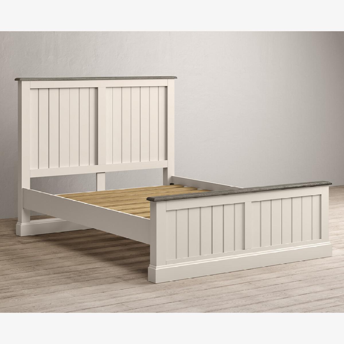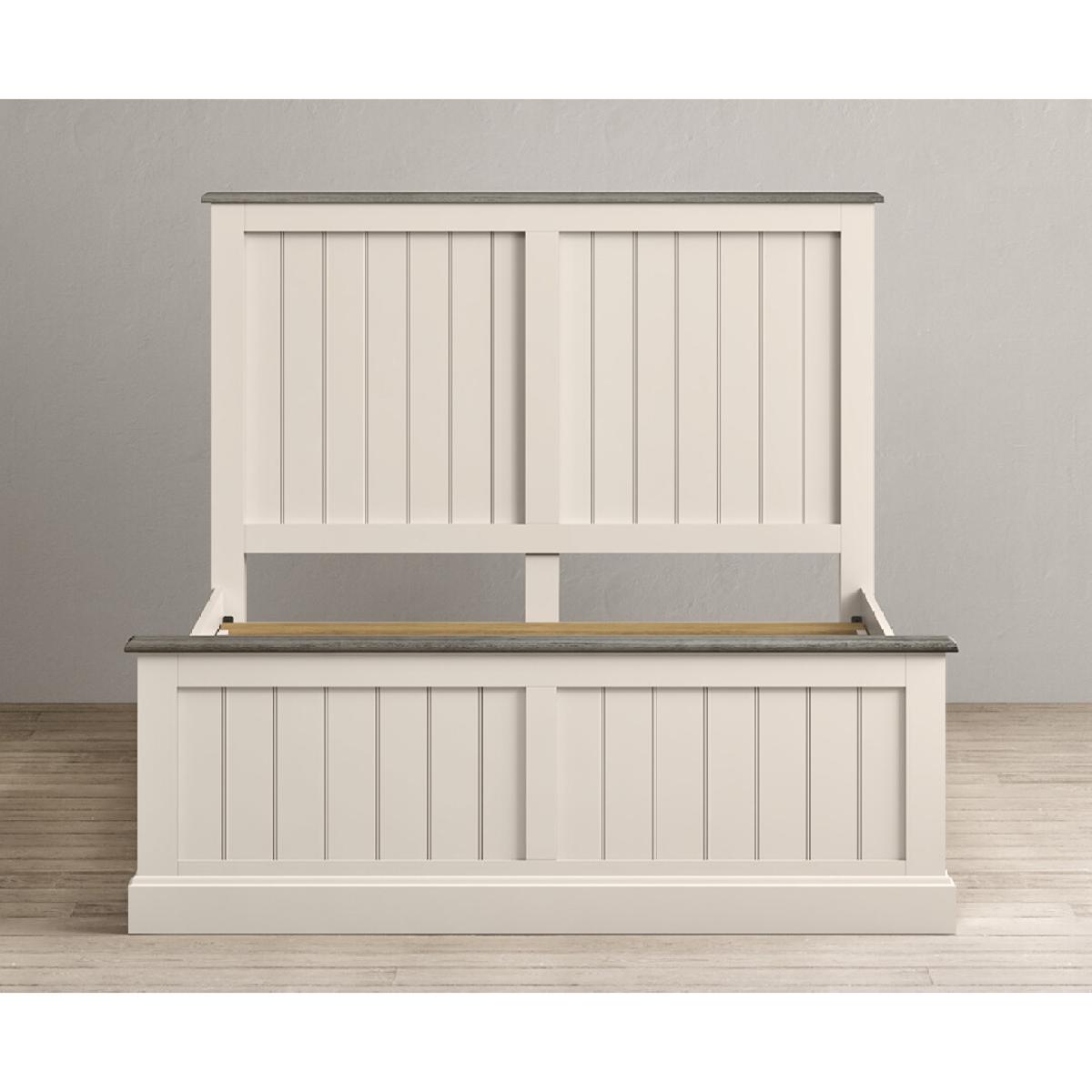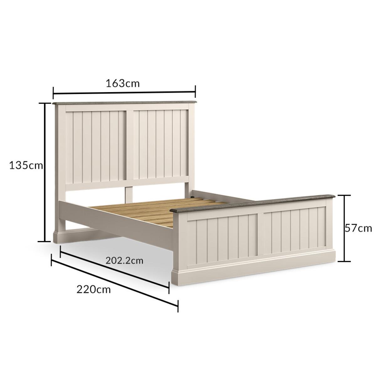 The Dartmouth Oak and Soft White King Size Bed is crafted from white painted solid hardwood, with a panelled high headboard design, solid oak grey painted tops on the headboard and footboard and sturdy slats.