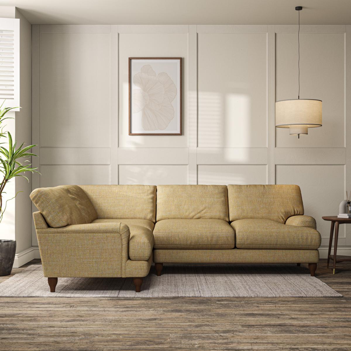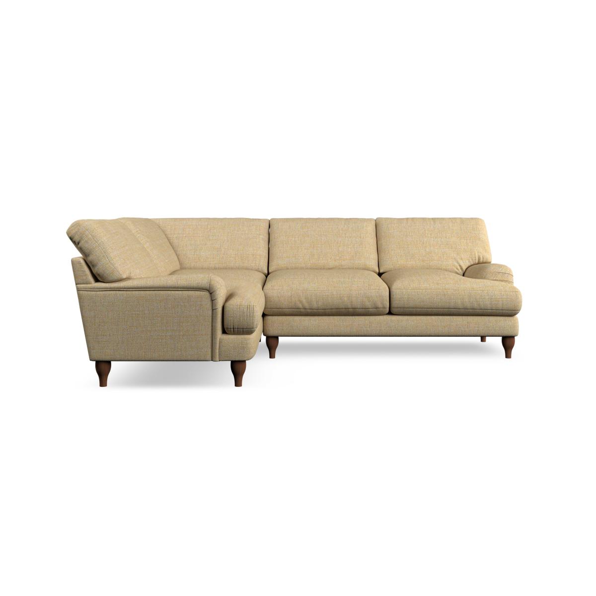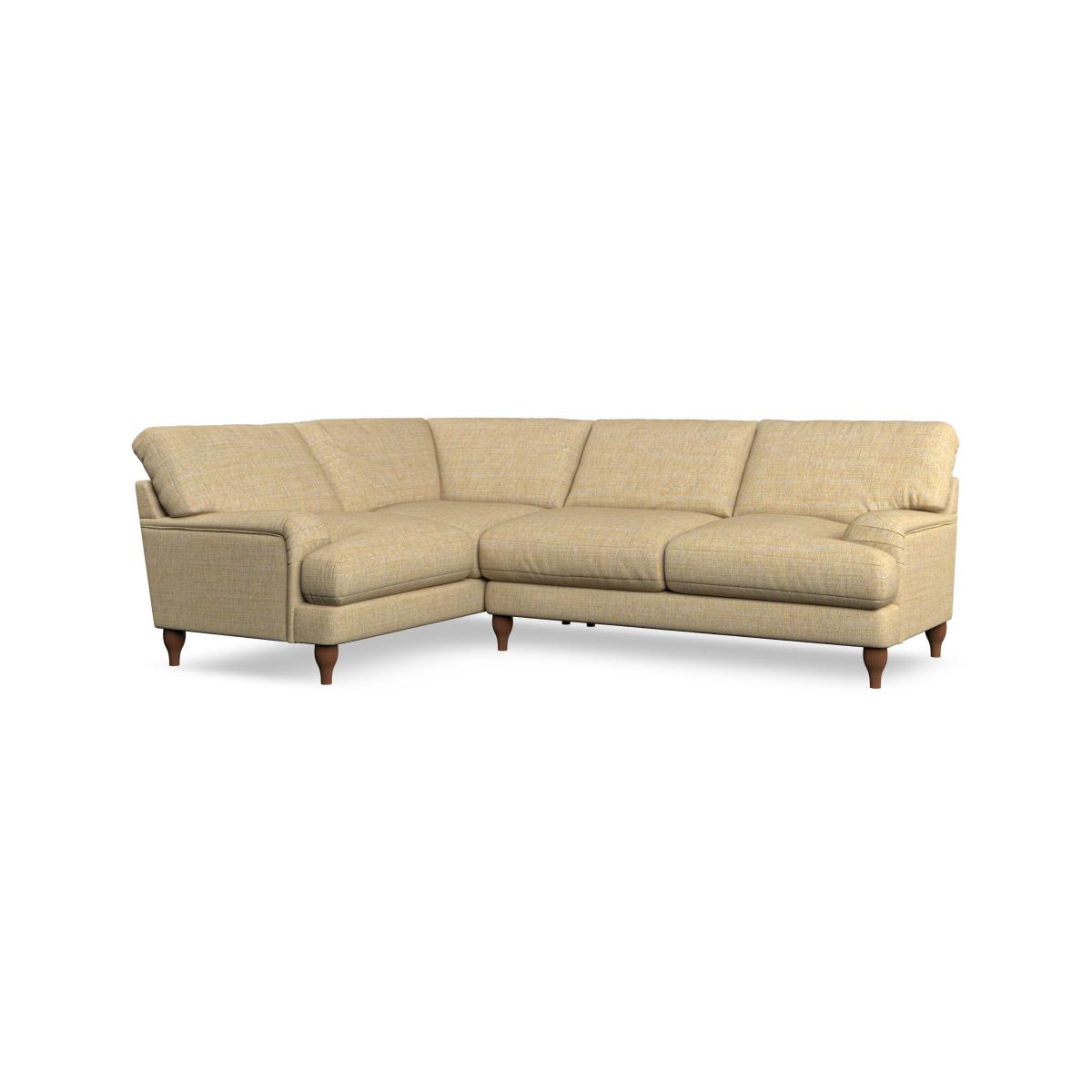 * Classic style* Bandaged Arms* Pleated details* Serpentine seat springs* Choose your orientation, support, fabric and leg colour This sofa features bandaged arms with pleat details and a lugged seat, offering a unique and stylish look. Built for longevity and comfort, it includes serpentine seat springs and deep fibre-filled back cushions for excellent support. You can customise your comfort by choosing between a low-maintenance foam seat or the inviting ‘Qualofill Blue’ fibre seat, made from 100% recycled polyester. The ‘T’ cushion seat and arm design ensure a compact and contemporary feel, complemented by self-sewn seat and back cushions. Choose from a right hand or left hand facing corner to fit your space perfectly. Additionally, you can select your preferred fabric and leg colour to perfectly match your living space.