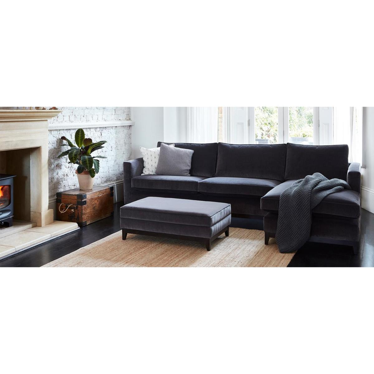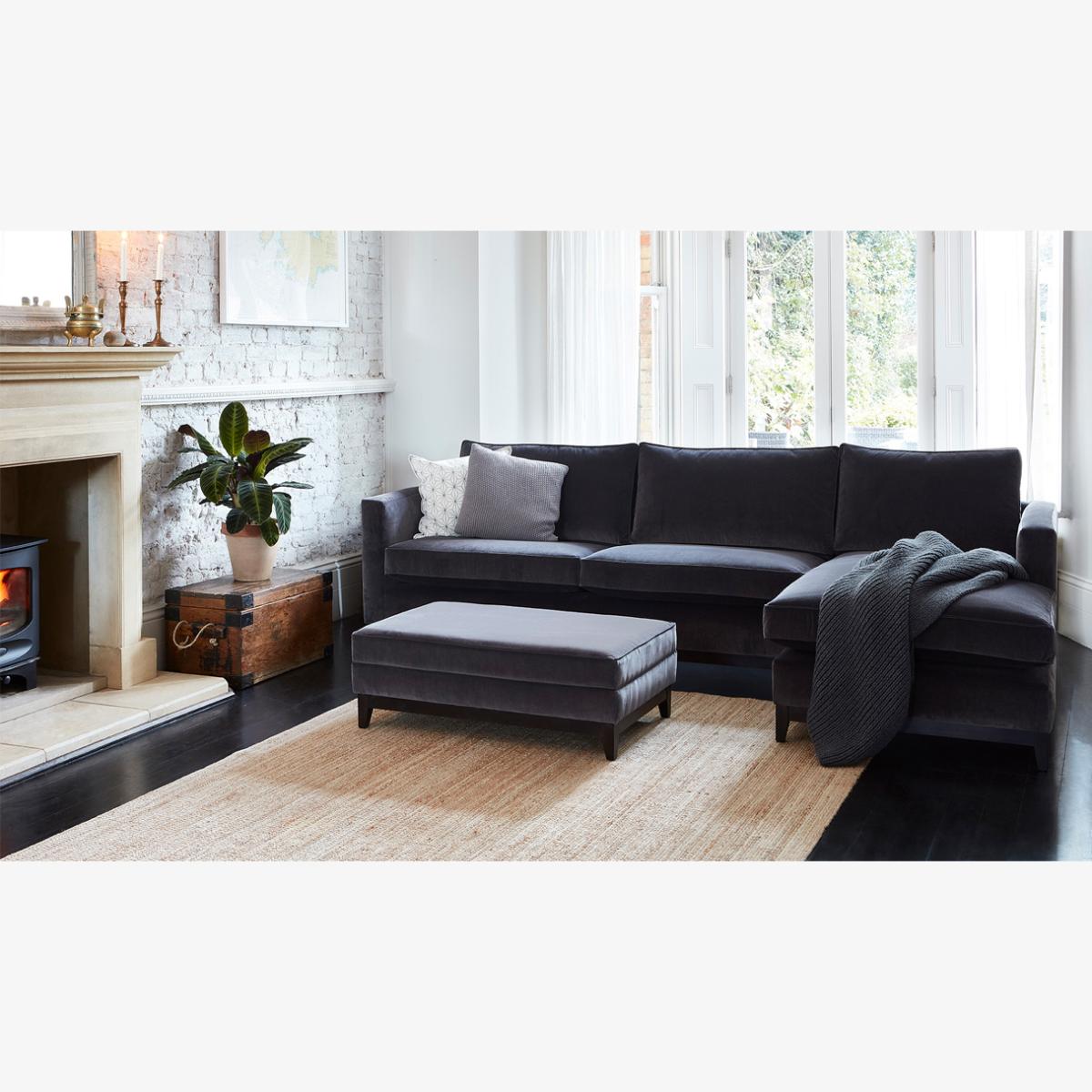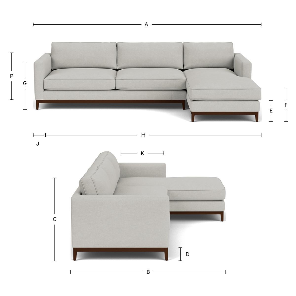 The Darwin is an elegant contemporary sofa with a simple, classic square arm design, and its right-hand chaise provides room to stretch out and relax in style. Whether it's a decadent velvet, a traditional tweed or a soft wool, we have an extensive collection of over 170 fabrics and leathers for you to choose from. Make this sofa bespoke to you by choosing the right leg finish, contrast piping and scatter cushions to complement your interior. Handmade in the UK by expert craftspeople, our chaise sofas are made using a hardwood frame and the finest materials to guarantee a sofa that will last for years to come. External (cm): - Width (A) = 290 - Depth (B) = 176 - Height (C) = 86 Seat (cm): - Width (H) = 260 - Depth (K) = 65 - Height (F) = 48 Arm (cm): - Width (J) = 15 - Height (G) = 70 Legs (cm): - Height (D) = 13 Frame Height (without Feet): - Height (P) = 57