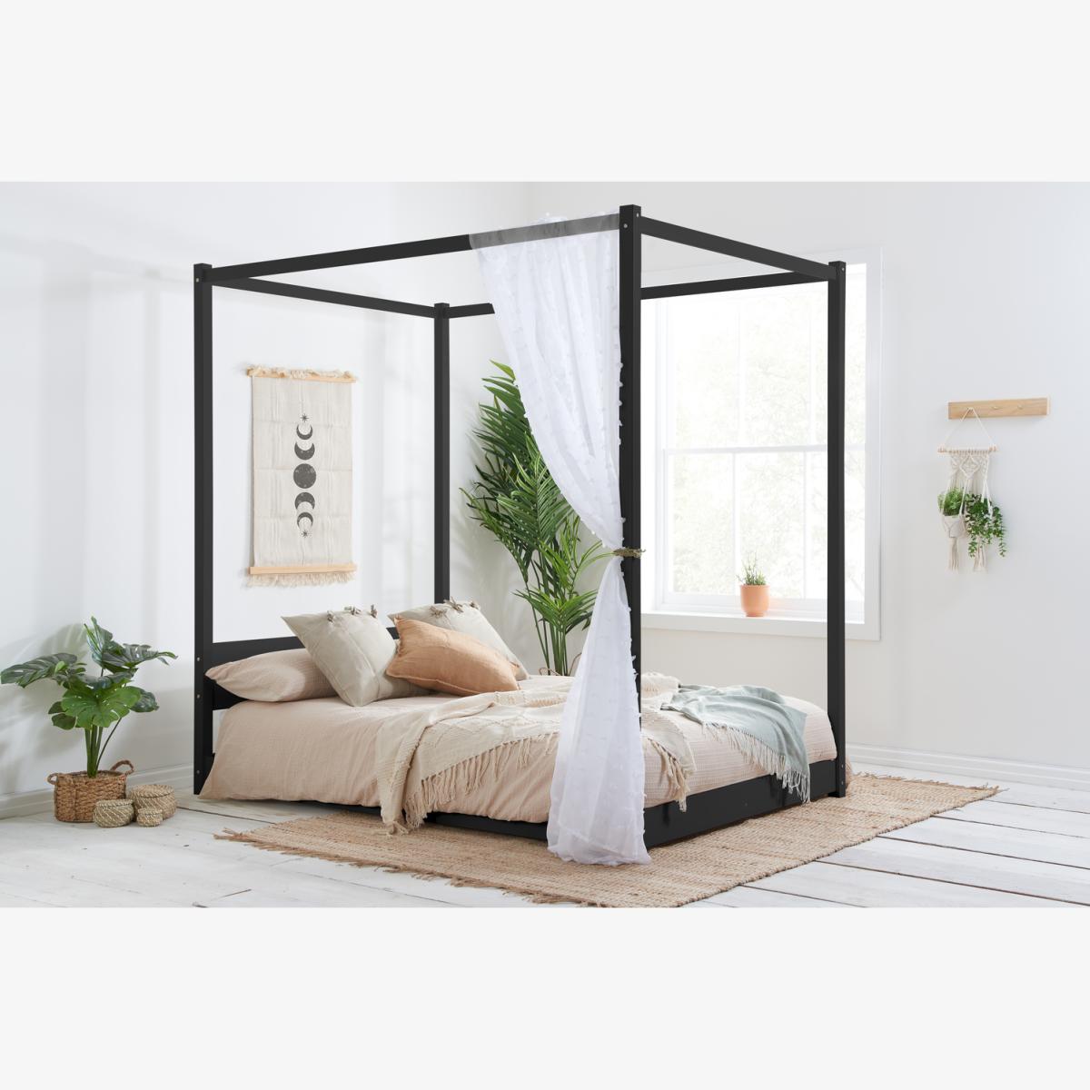 The Darwin four poster in black is a versatile piece that lends itself well to a range of interior styles, from modern minimalist to eclectic boho. Its clean, bold lines make it an eye-catching focal point, perfect for creating a statement in the bedroom. I love pairing it with crisp, neutral bedding for a sleek look, or adding textured throws and cushions to soften the aesthetic. Practical styling tips include placing the bed in a well-lit corner to emphasise its silhouette and using sheer or patterned drapes for privacy or visual interest. It works particularly well in spaces that embrace contrast - think light walls with dark furniture - as this enhances its striking appearance and allows you to incorporate vivid accent colours in textiles or accessories.
