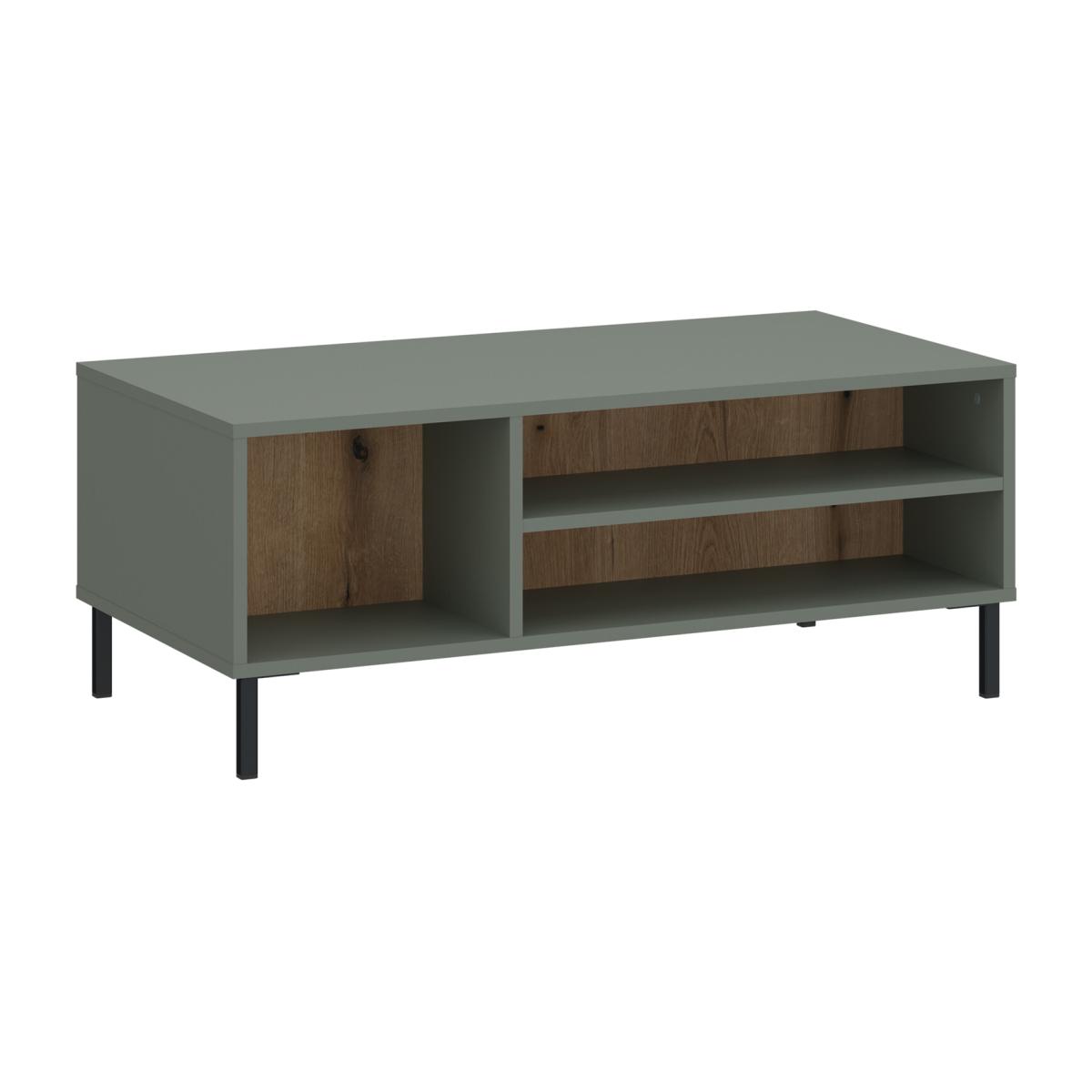 Enhance your living space with this Darwin Open Storage Coffee Table. This piece beautifully combines a chic grey-green finish with natural oak highlights, making it an eye-catching addition that is both practical and stylish. Constructed from laminated chipboard and supported by sleek, high metal legs, it is designed for durability and stability. The unit boasts three generous shelves, perfect for displaying books, decorative items, and more. Minimalistic and stylish, it effortlessly blends with a variety of interior styles, including vintage, eclectic, modern, loft, and bohemian. This coffee table pairs perfectly with other items from the Darwin collection, allowing you to create a cohesive and inviting atmosphere in your home.