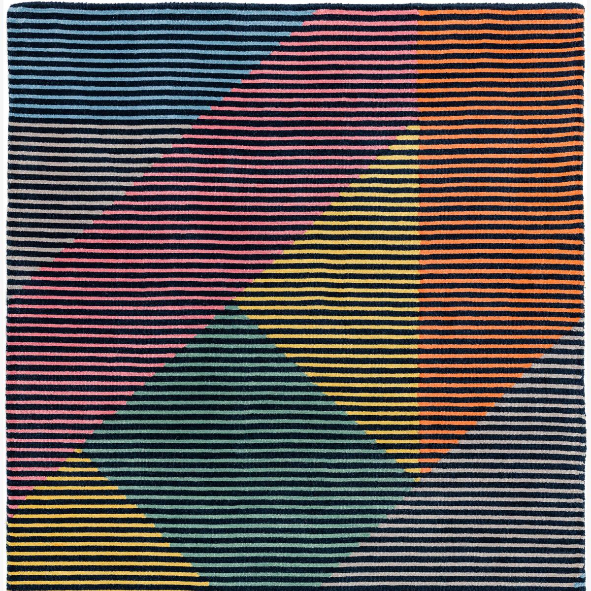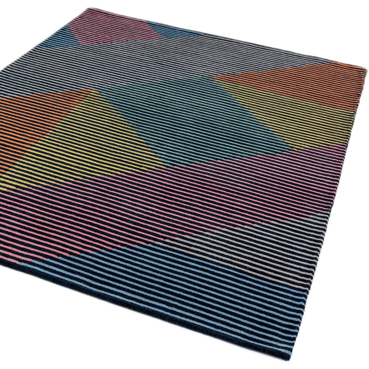 This rug is a multi-coloured contemporary rug, with linear geometric designs. Handmade using pure wool, this rug features a dense loop pile which is suitable for high traffic areas.