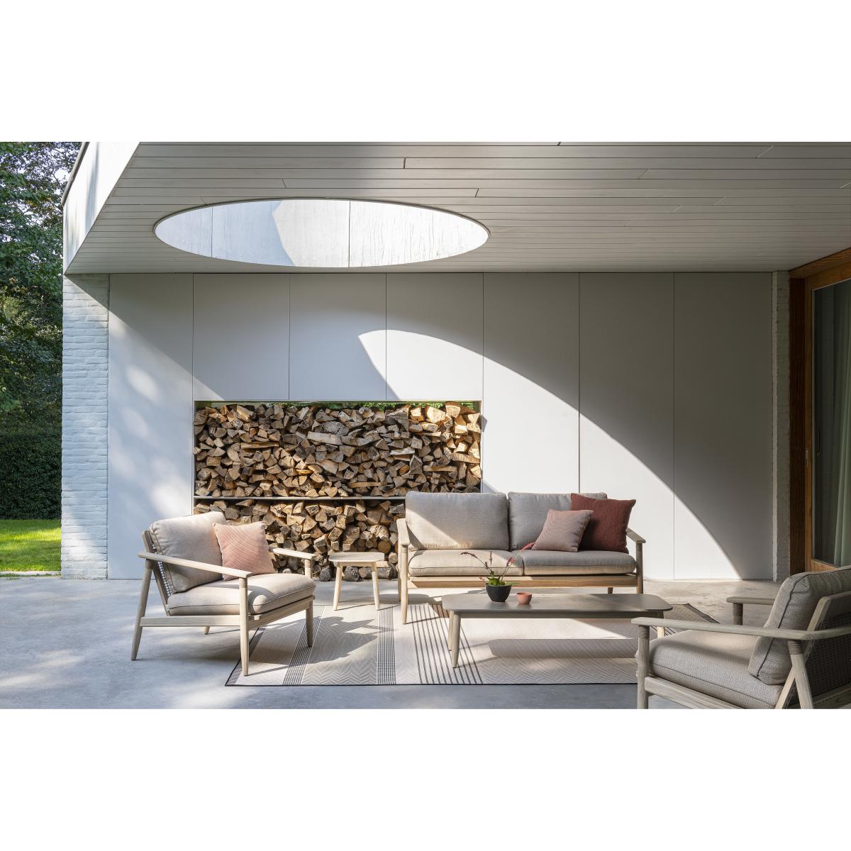 With the David collection, Vincent Sheppard reinterprets classic teak furniture. This collection shines the spotlight on aged teak with flecks of silver-grey. With its pale tones, the teak assumes a modern personality. The David sofa is characterised by ultra-elegant details: the woven backrest and the tops of legs, which are decorated with cord details. The soft, earthy tones of the cord harmonise perfectly with the frame made from solid aged teak, providing a warm and authentic aspect for the collection. The superb weave of the backrest is hand-crafted with polypropylene cord: water- and UV-resistant, this material gives you the ability to reproduce an artisanal and cosy style, perfectly represented with natural fibres. The elegant silhouette of the David sofa is emphasised by inviting cushions, offering optimal comfort. Plus, the quick-dry foam padding means that the cushion dries very quickly. Ultra-comfortable, the David sofa has a deep seat, meaning you truly can sit back and relax. Care: Outdoors, the colour of the non-treated teak will become an attractive grey tone, maintained only by occasional washing with warm, soapy water in order to prevent moss. Synonymous with high quality and durable materials, the Vincent Sheppard collection places craftsmanship at the heart of its DNA. Each piece designed by Vincent Sheppard is hand-made in Indonesia by the most highly qualified craftsmen. The knowledge and skills of local artisans elevate these creations to the rank of works of art.