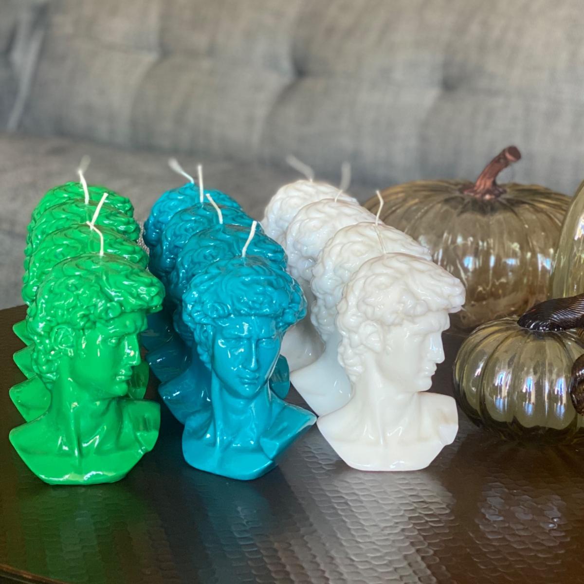 David is a masterpiece of Italian Renaissance sculpture, created from 1501 to 1504 by Michelangelo. Our David candle is 6 inches tall and 5 inches wide, sculpted from natural soy wax blend.