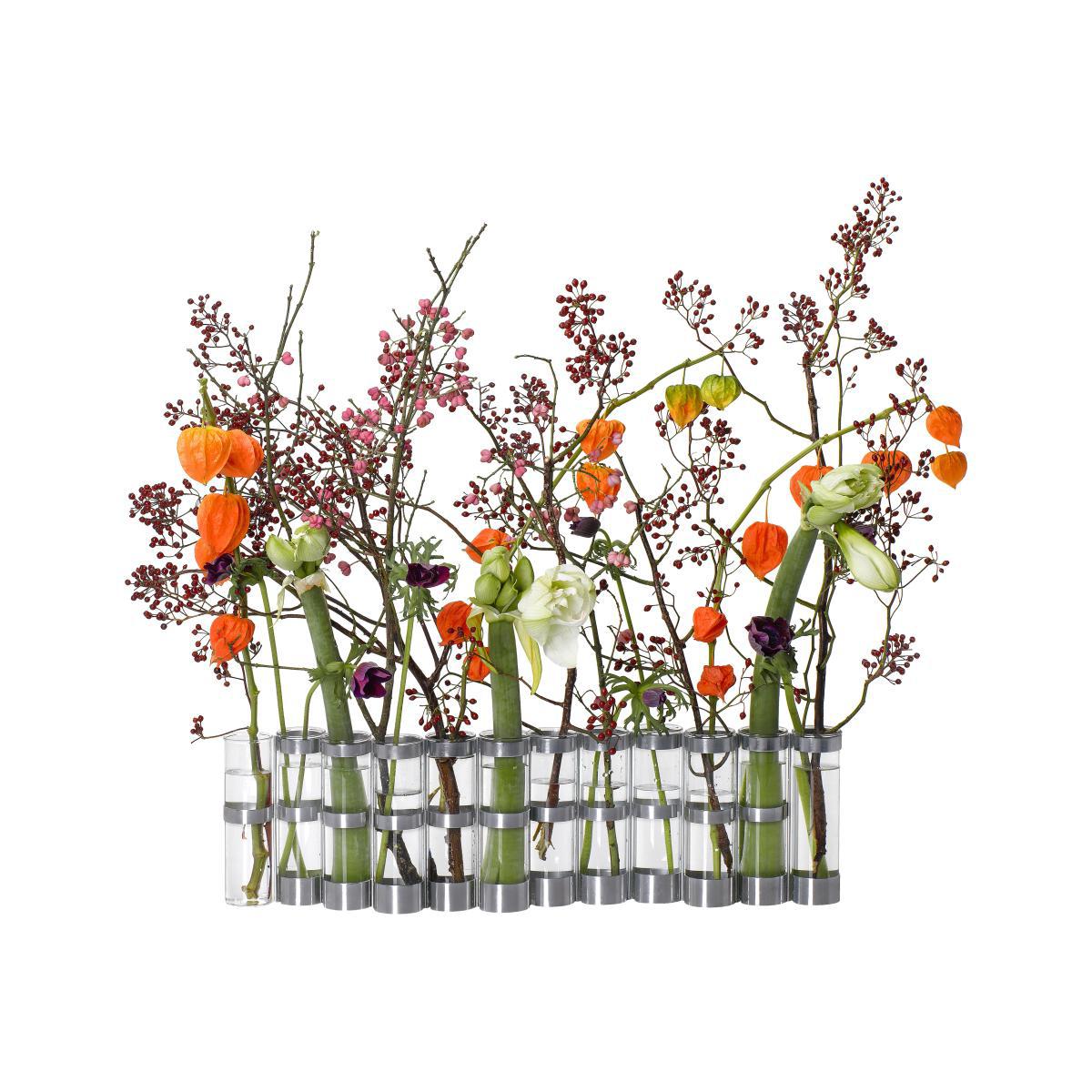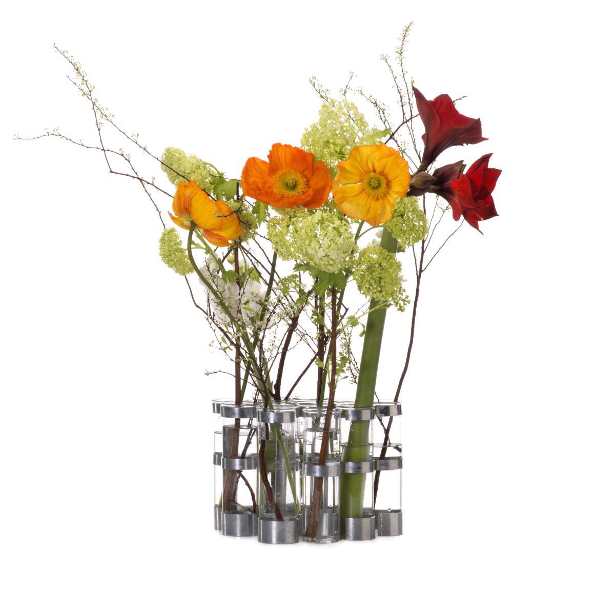 This April vase is one of Tsetse's symbolic creations: it is made up of twelve glass tubes with metal fixtures which interlock. When the components are assembled, you can arrange them into various shapes and forms. You are able to rearrange the vase into diverse positions. As a contrast in forms, after removing one of the tubes from the chain, the two tail-ends can be joined to create a ring. The tubes may be independently detached from the suite in order to create autonomous segments. In this fashion, the vase can be shortened, or, by easily attaching two or more vases together, any extended length can be achieved. To transport the vase from sink to mantelpiece, and/or to arrange your bouquet, it is best to firmly bundle the vase wholly assembled with both hands. The April vase is made of glass and steel coated with zinc. After using it in water, the metal gets oxidised: a white rust veil appears. It comes with a handy spare glass tube.