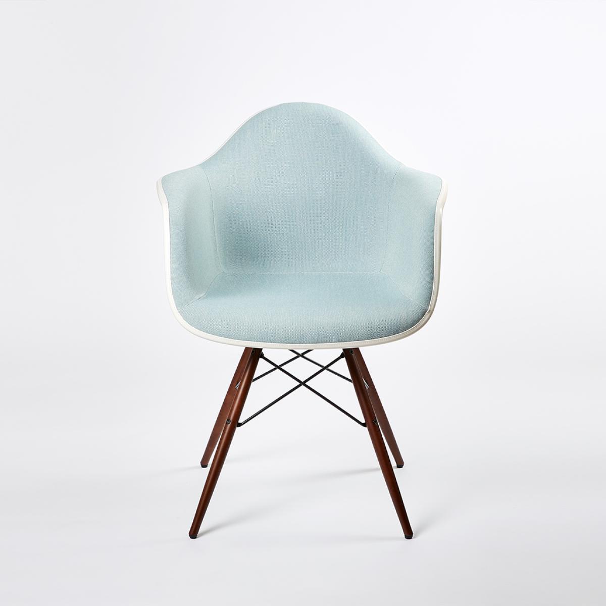 Designed in 1950 by iconic duo Charles and Ray Eames for Vitra, the blue Hopsak-upholstered DAW Plastic Armchair in ice grey showcases the signature 'Eiffel' base between dark maple legs and a refreshed colour palette for 2019, paying homage to the model's original colour history while acknowledging future aspirations. Crafted from recyclable dyed-through polypropylene for greater comfort, the seat comes fully upholstered in Hopsak fabric and sits on a striking base with black steel cross struts and elegant dark maple legs. Durable and robust, Hopsak is a flat-plain weave fabric crafted from polyamide, making it ideal for private as well as public settings. The first industrially produced plastic chair, the DAW has a simple and organic shape that has led to its legendary status and universal appeal. Updated in 2016, Vitra added 2cm to the height of the chair and revised the geometry of the seat for optimum ergonomics and comfort.