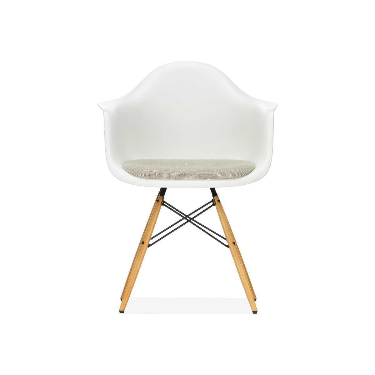 Designed in 1950 by iconic duo Charles and Ray Eames for Vitra, the DAW Plastic Armchair showcases the signature 'Eiffel' base between black maple legs and a refreshed colour palette since 2019, paying homage to the model's original colour history while acknowledging future aspirations. Crafted from recyclable dyed-through polypropylene for greater comfort, the seat sits on a striking base with black steel cross struts and elegant black maple legs. The first industrially produced plastic chair, the DAW has a simple and organic shape that has led to its legendary status and universal appeal. Updated in 2016, Vitra added 2cm to the height of the chair and revised the geometry of the seat for optimum ergonomics and comfort. Vitra Home Stories 2021: Receive a complimentary seat upholstery upgrade for a limited time.