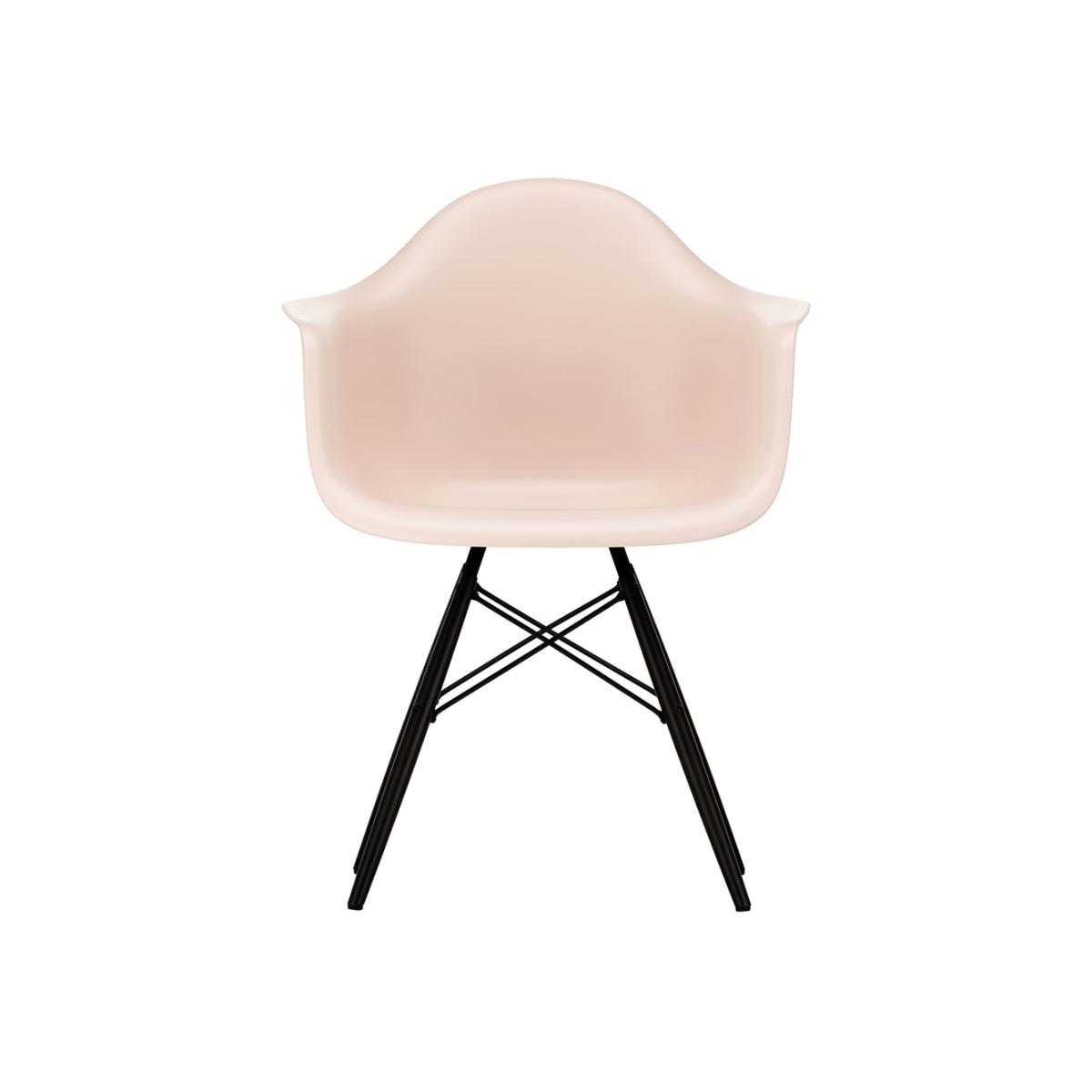 Designed in 1950 by iconic duo Charles and Ray Eames for Vitra, the DAW Plastic Armchair in a pale rose hue showcases the signature 'Eiffel' base between black maple legs and a refreshed colour palette for 2019, paying homage to the model's original colour history while acknowledging future aspirations. Crafted from recyclable dyed-through polypropylene for greater comfort, the seat sits on a striking base with black steel cross struts and elegant black maple legs. The first industrially produced plastic chair, the DAW has a simple and organic shape that has led to its legendary status and universal appeal. Updated in 2016, Vitra added 2cm to the height of the chair and revised the geometry of the seat for optimum ergonomics and comfort. An elegant and distinctive design, the DAW Plastic Armchair is instantly recognisable as an authentic Eames piece and is crafted to exacting standards by prestigious collective Vitra.