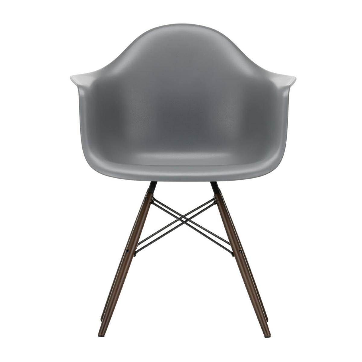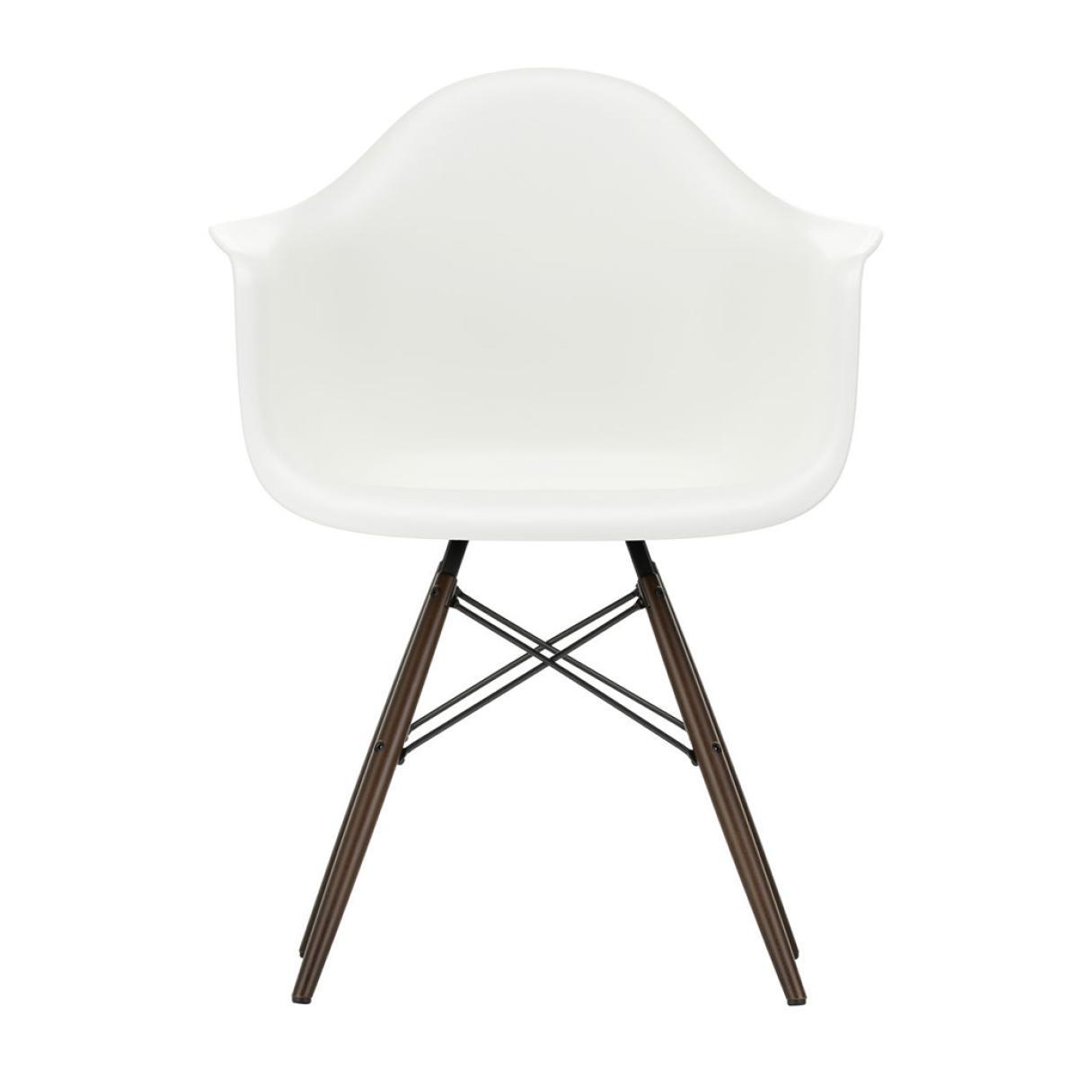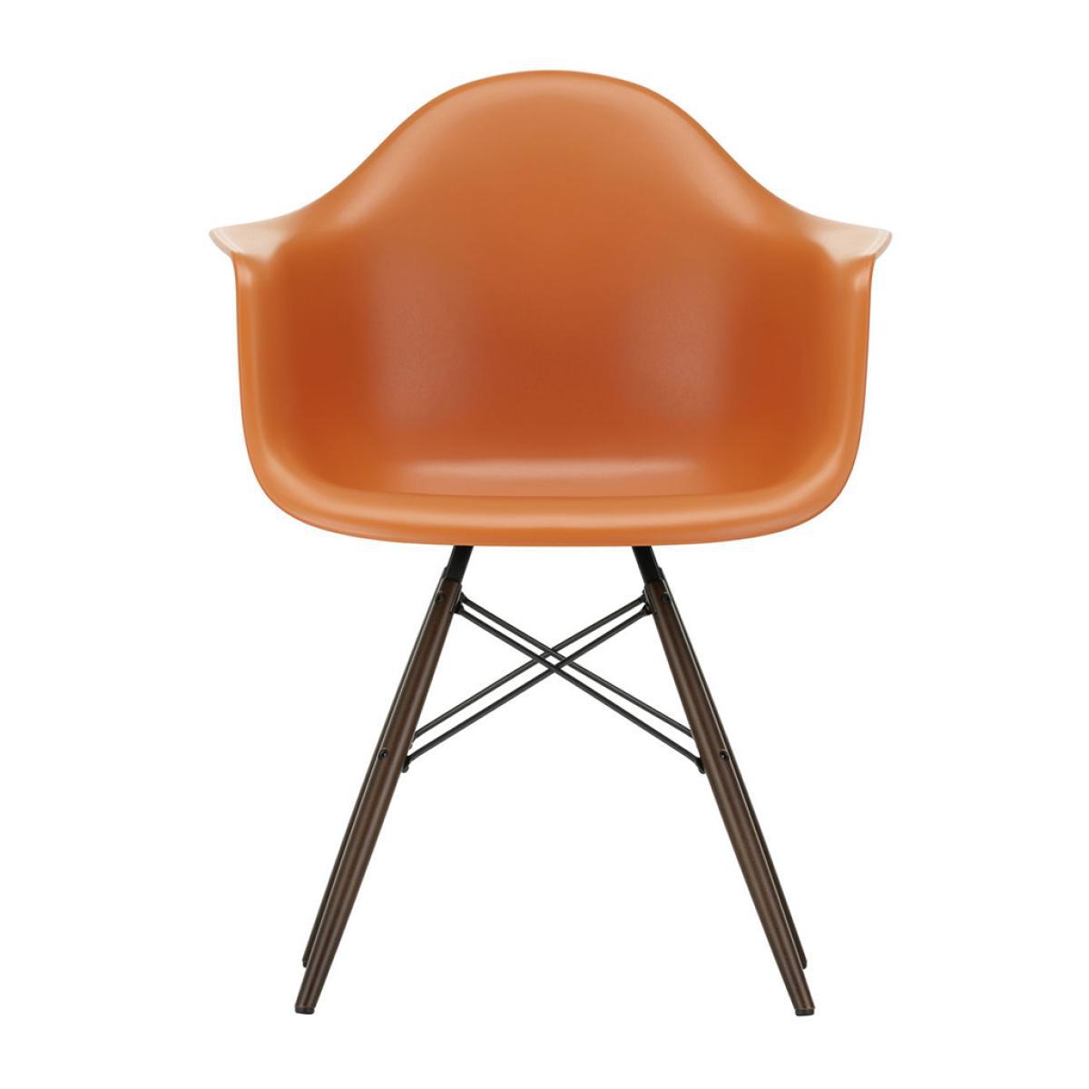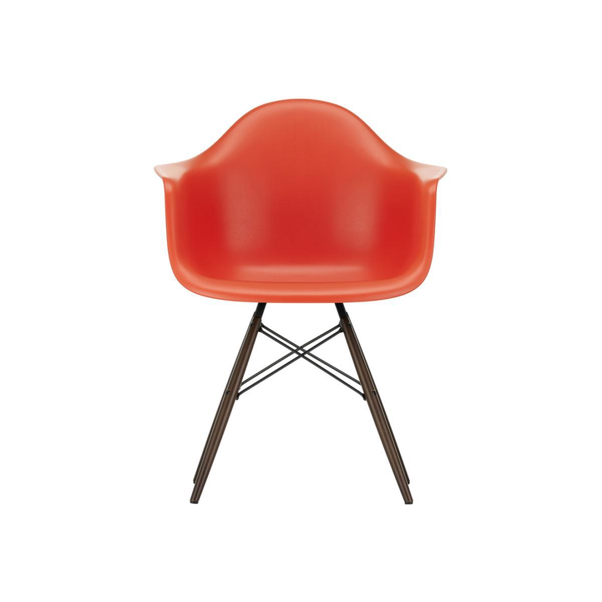 Designed in 1950 by iconic duo Charles and Ray Eames for Vitra, the DAW Plastic Armchair in a poppy red hue showcases the signature 'Eiffel' base between dark maple legs and a refreshed colour palette for 2019, paying homage to the model's original colour history while acknowledging future aspirations. Crafted from recyclable dyed-through polypropylene for greater comfort, the seat sits on a striking base with black steel cross struts and elegant dark maple legs. The first industrially produced plastic chair, the DAW has a simple and organic shape that has led to its legendary status and universal appeal. Updated in 2016, Vitra added 2cm to the height of the chair and revised the geometry of the seat for optimum ergonomics and comfort. An elegant and distinctive design, the DAW Plastic Armchair is instantly recognisable as an authentic Eames piece and is crafted to exacting standards by prestigious collective Vitra.