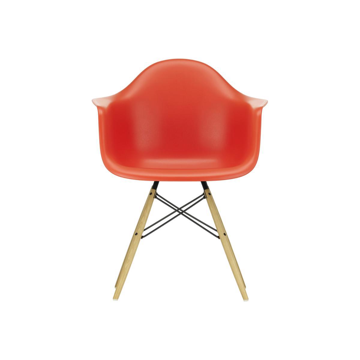 Designed in 1950 by iconic duo Charles and Ray Eames, the DAW Plastic Armchair is an instantly recognisable piece, showcasing the signature 'Eiffel' base, maple legs and a vibrant poppy red seat. Crafted from recyclable dyed-through polypropylene for greater comfort, the seat sits on a striking base with black steel cross struts and elegant maple legs. The first industrially produced plastic chair, the DAW Chair has a simple and organic shape that has led to its legendary status and universal appeal. Updated in 2016, Vitra added 2cm to the height of the chair and revised the geometry of the seat for optimum ergonomics and comfort.