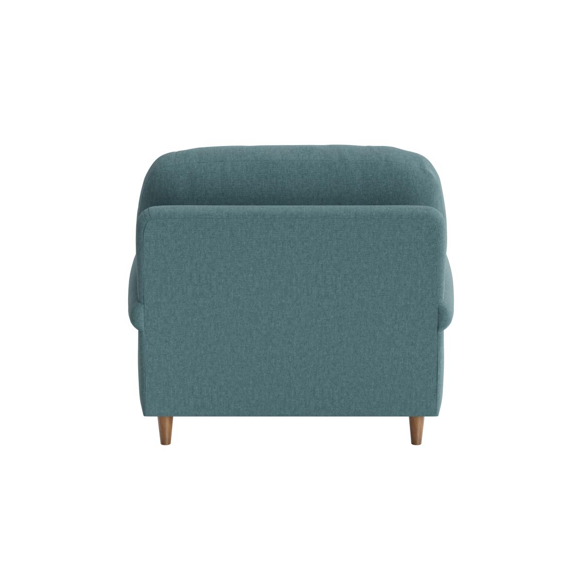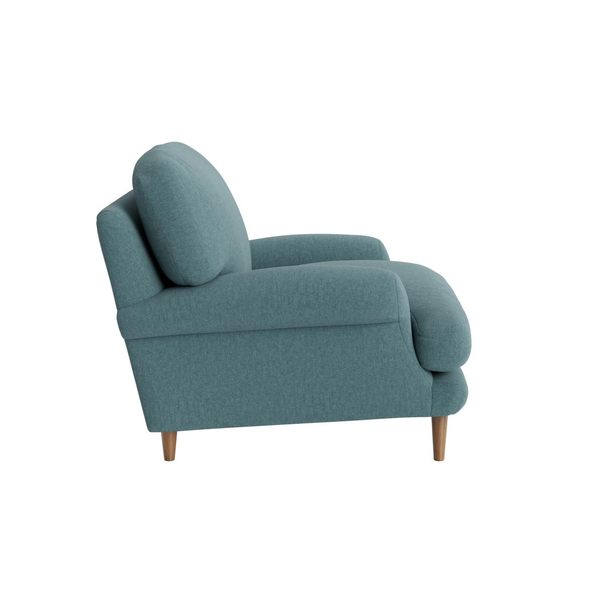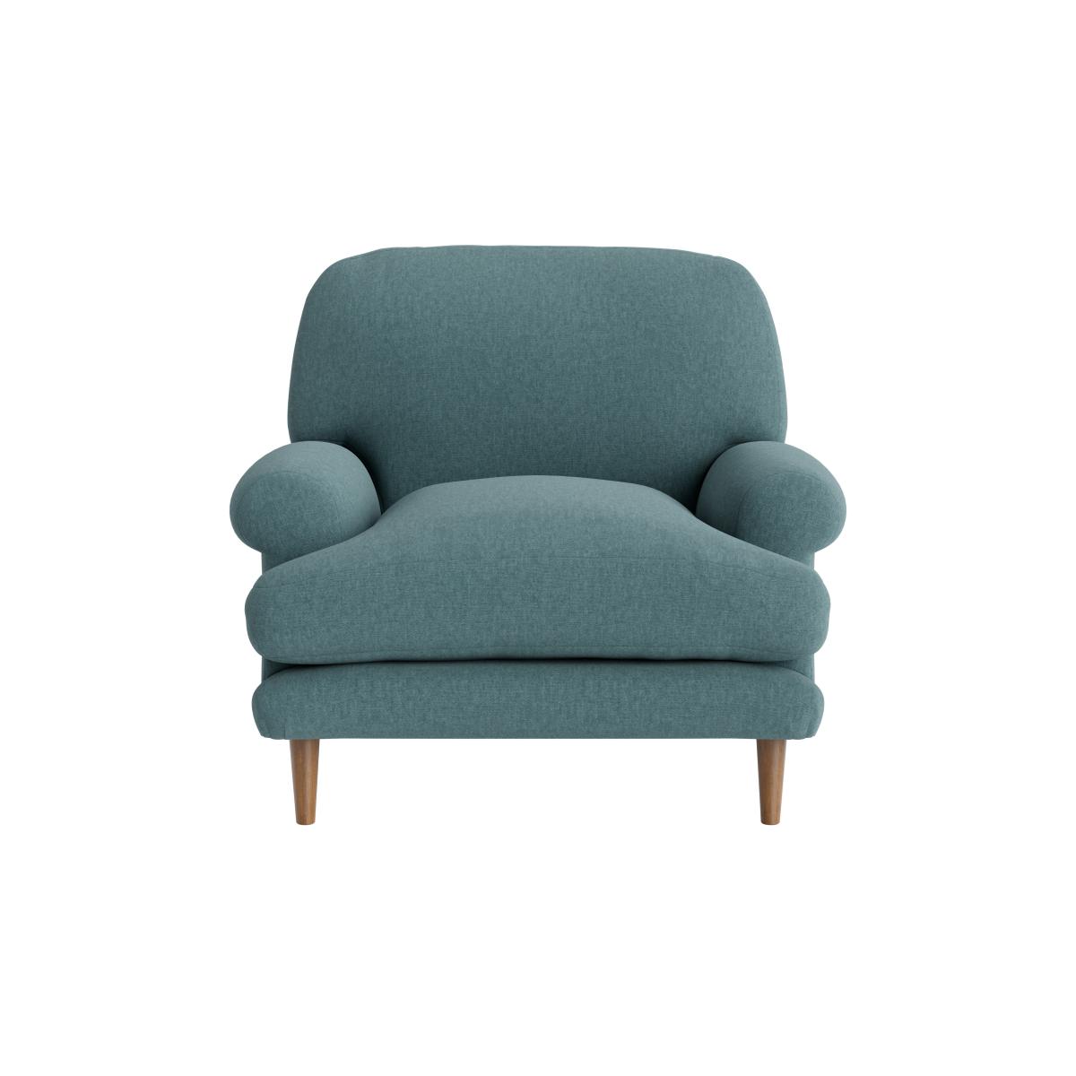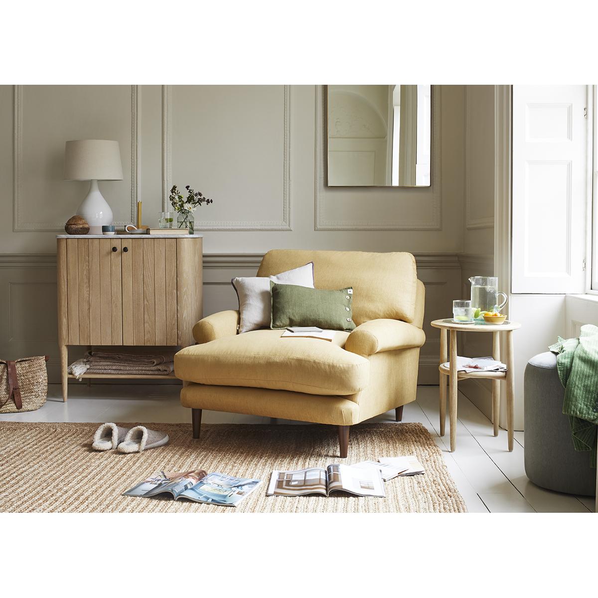 I really like this armchair for its retro-inspired shape and inviting curves, making it a versatile addition to both classic and contemporary interiors. Its soft, muted colour pairs beautifully with neutral palettes or can be complemented with patterned cushions for added visual interest. This chair works well in living rooms, reading nooks, or even bedrooms as a cosy spot to relax. Practical styling tips include placing it near a side table with a good reading lamp or layering with textured throws and cushions to create a welcoming, lived-in feel. Its sturdy wooden legs also add a subtle touch of warmth, grounding the look without overpowering other design elements.