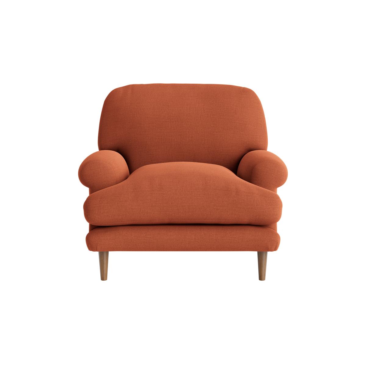 I love this armchair for its inviting, yet understated silhouette, making it versatile for various interior styles. Its warm terracotta tone works particularly well in cosy, Mediterranean-inspired spaces or as a vibrant accent in minimalist or Scandinavian interiors. When styling, consider pairing it with textured cushions or a soft throw to add depth. Practical tips include placing it near a reading nook or within a lounge area to maximise comfort, and pairing it with natural wood or brass accents to enhance its welcoming character. It’s a great statement piece that combines comfort and style effortlessly.