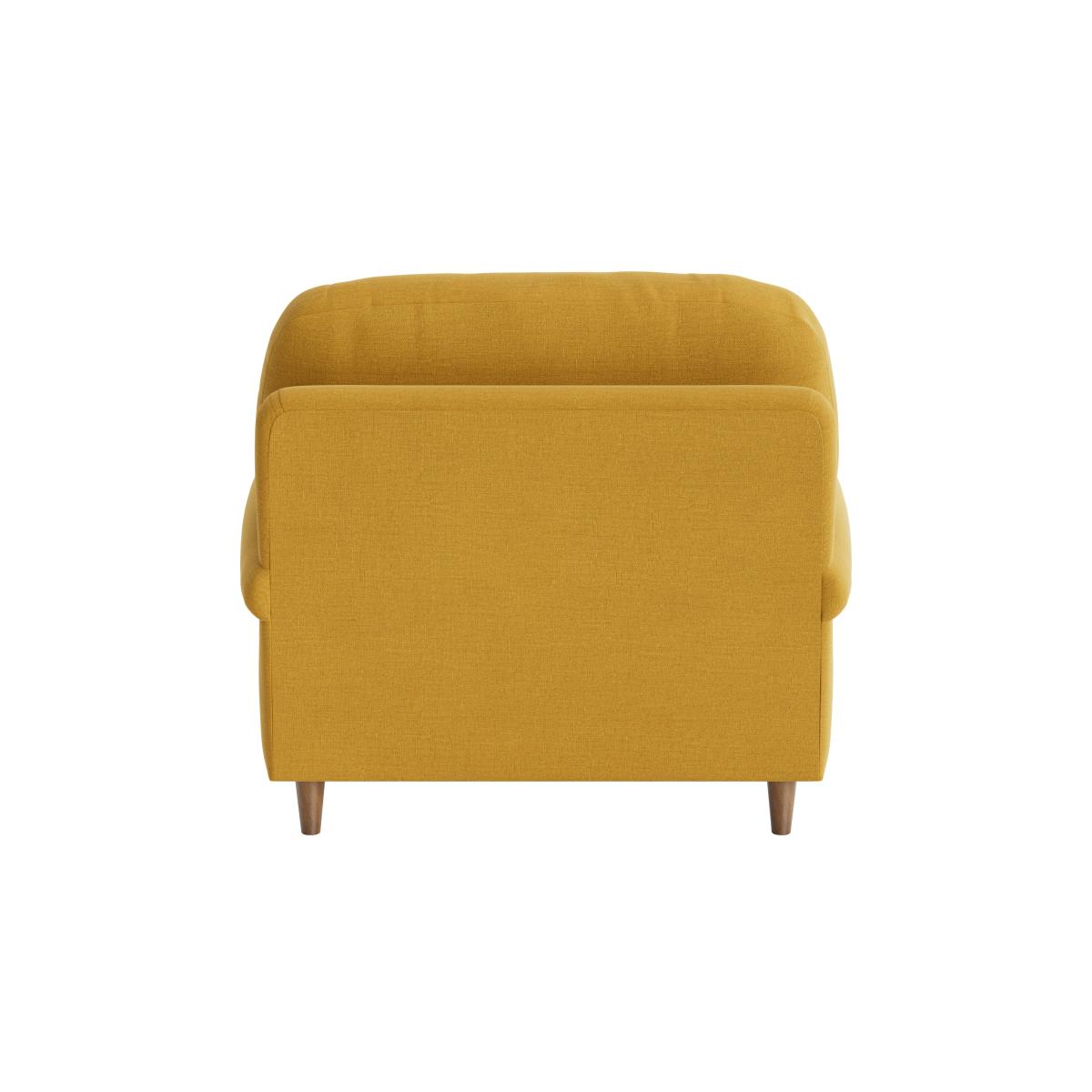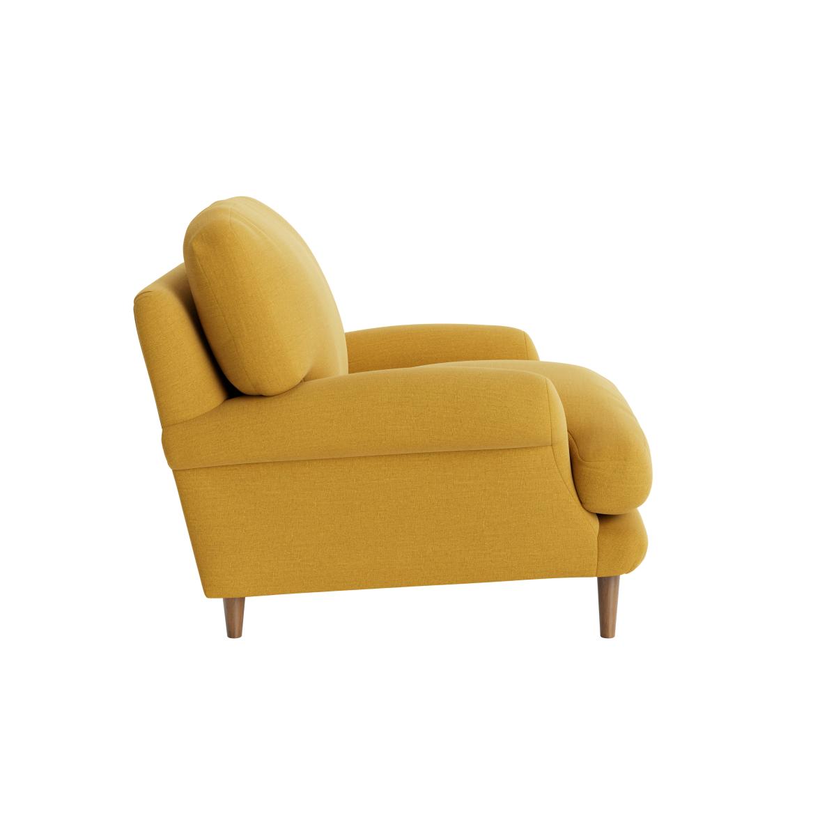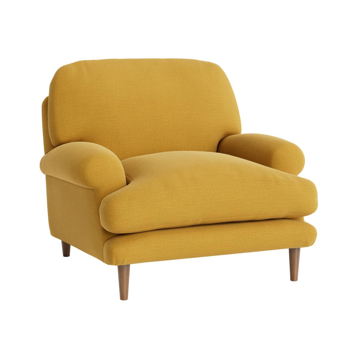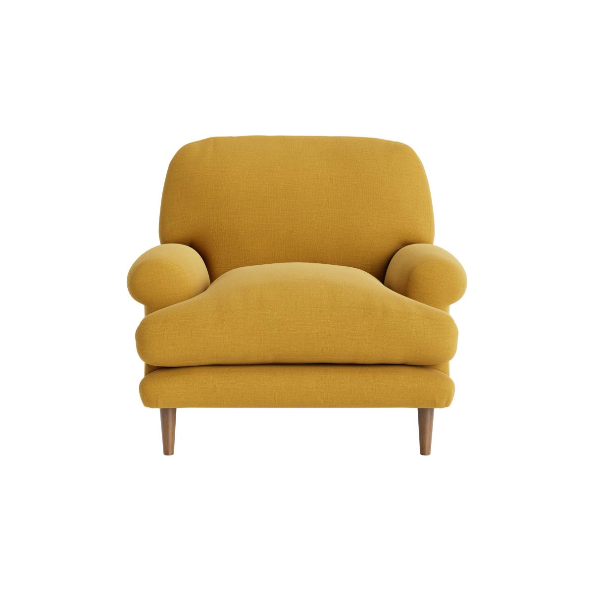 I love this armchair for its inviting, vintage-inspired look and its bold mustard hue, which adds a cheerful pop of colour to any room. It works particularly well in eclectic or retro interiors, but can also serve as a statement piece in more minimalist spaces when paired with complementary colours and textures. For styling tips, consider layering with textured cushions or throws to add depth, and position it near other natural materials like wood or rattan to create a warm, cohesive feel. Its compact size makes it versatile for small sitting areas or as an accent chair in a larger living room or bedroom.
